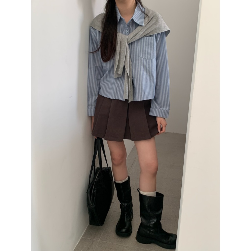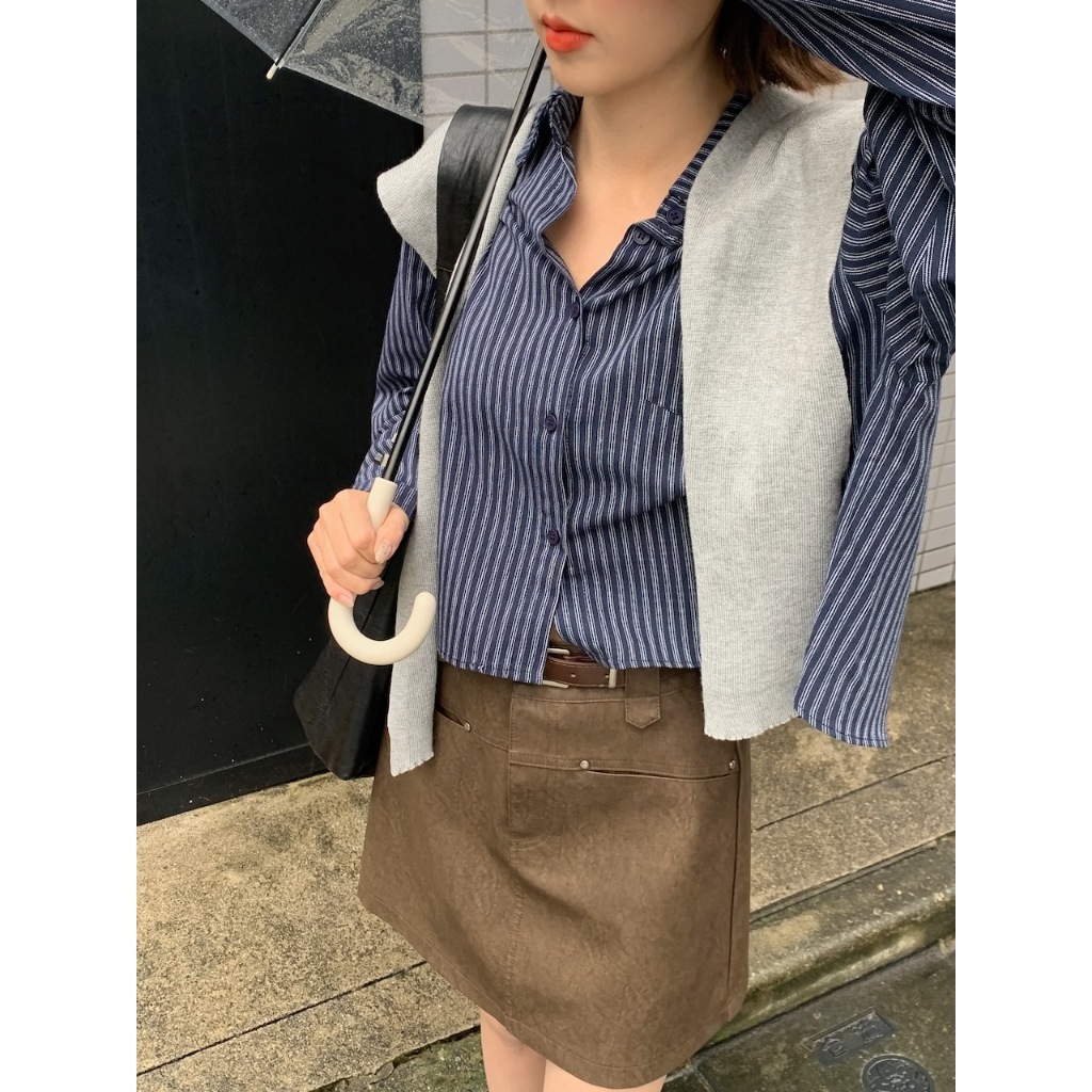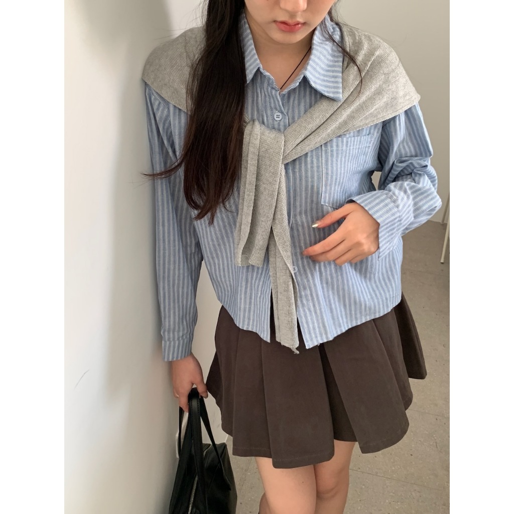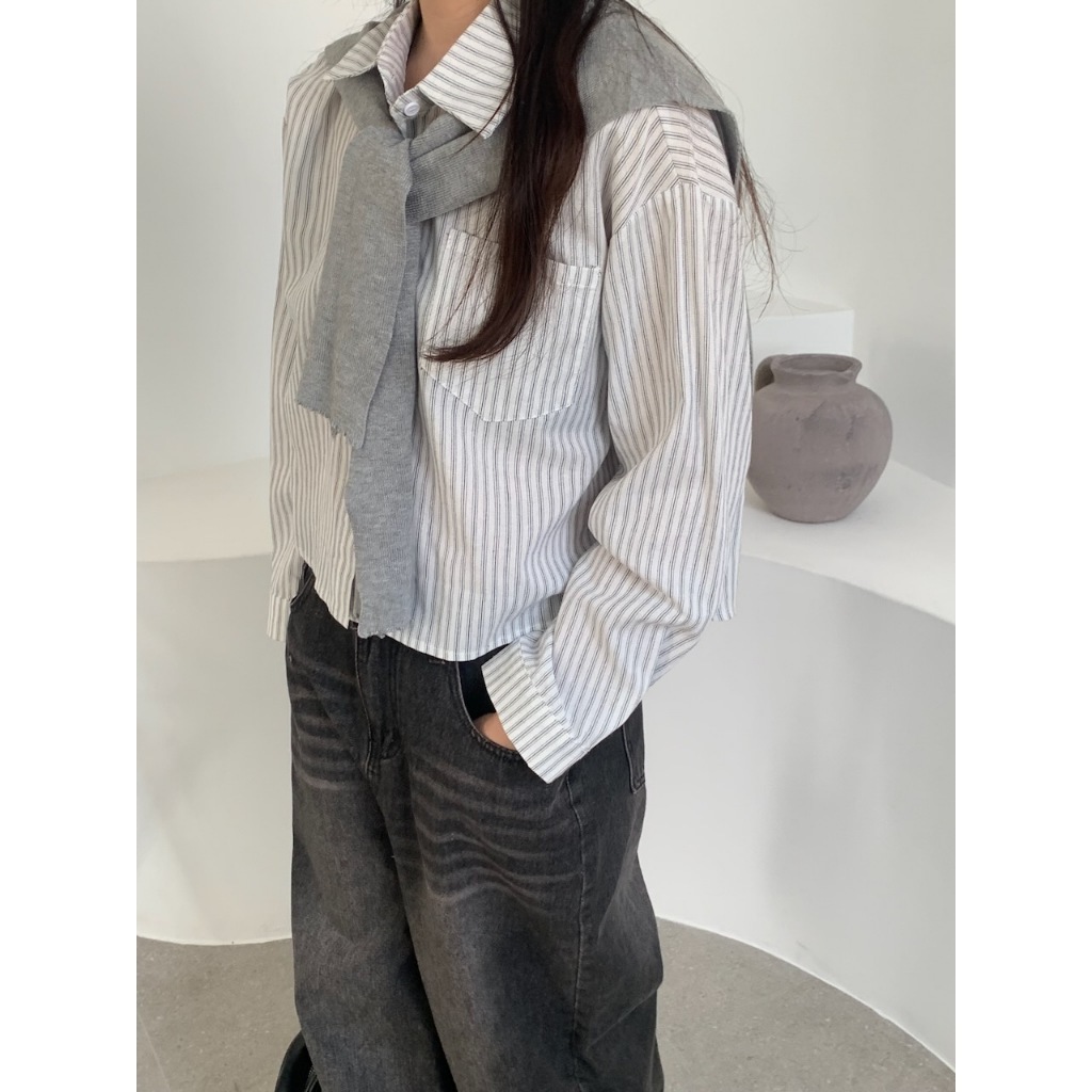 ※襯衫:真鈕扣 胸前真口袋 下擺前短後長 整件條紋設計 真兩件式