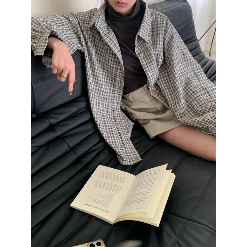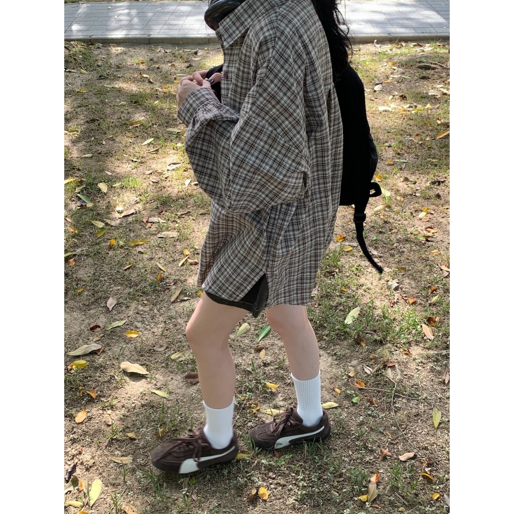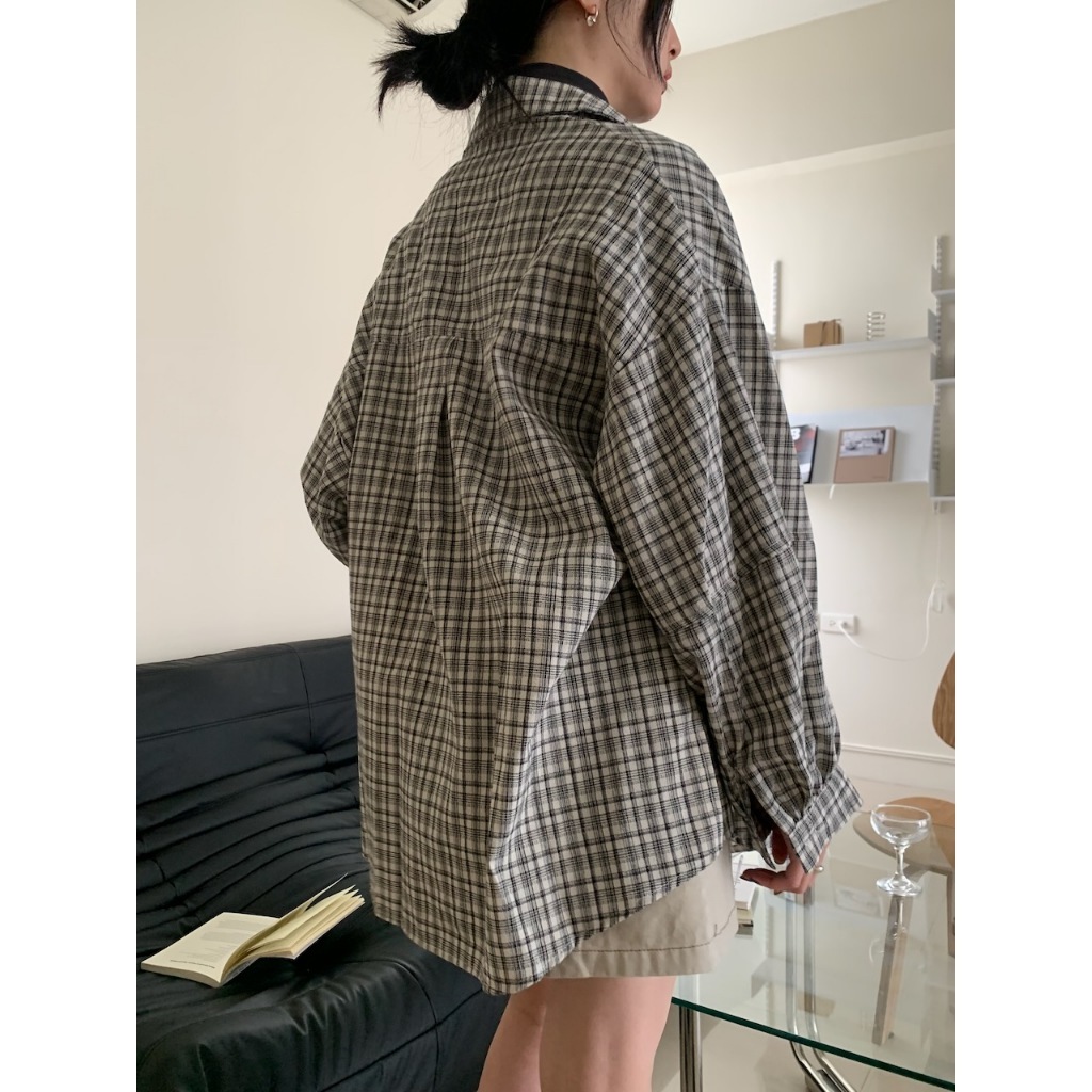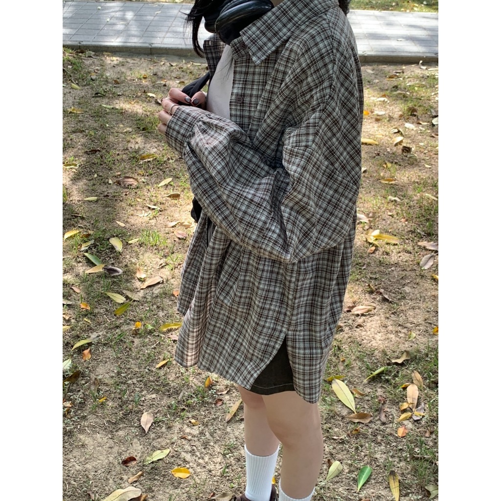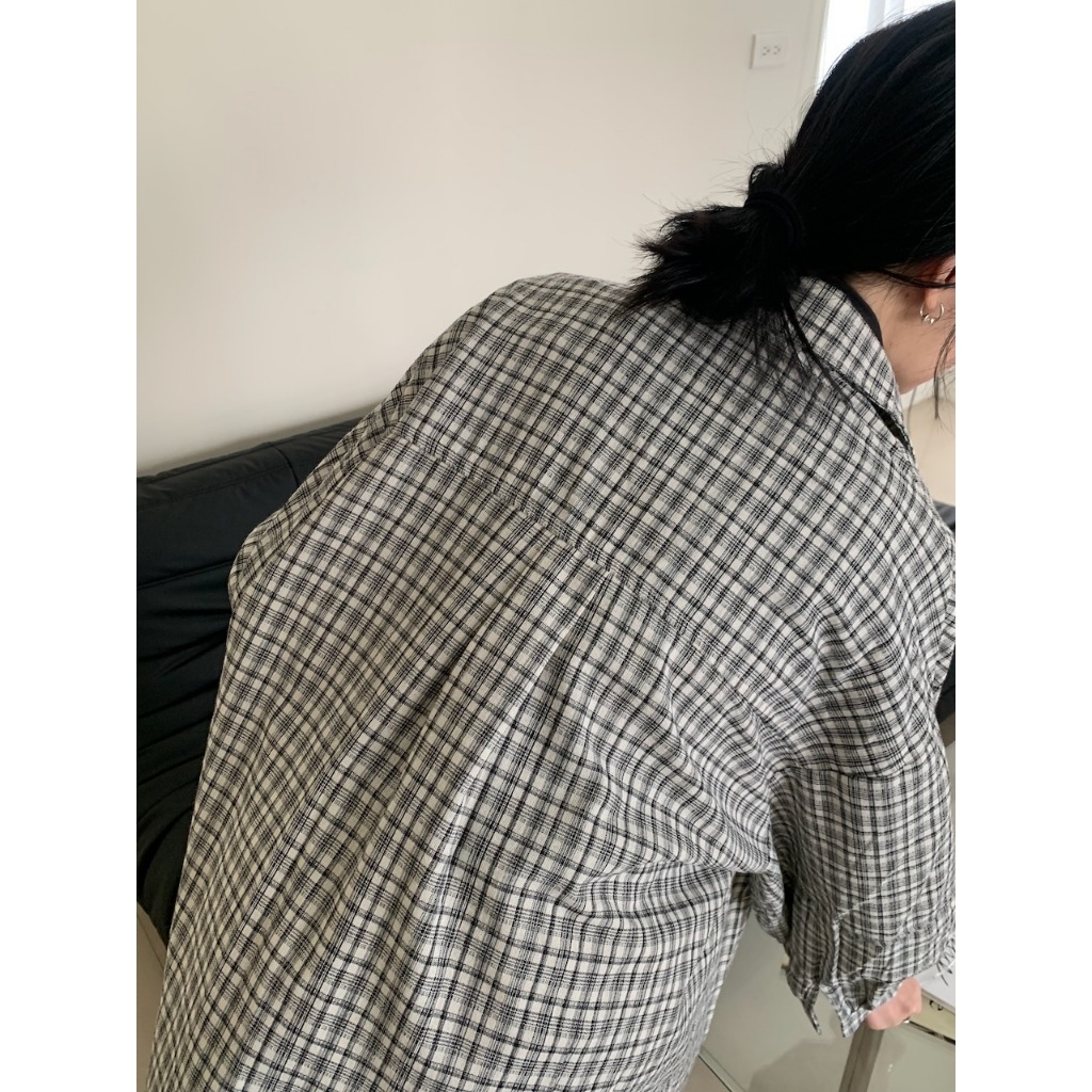 ※格紋 兩側開岔 袖子連接袖口處做澎 寬鬆 薄款微透 前短後'長