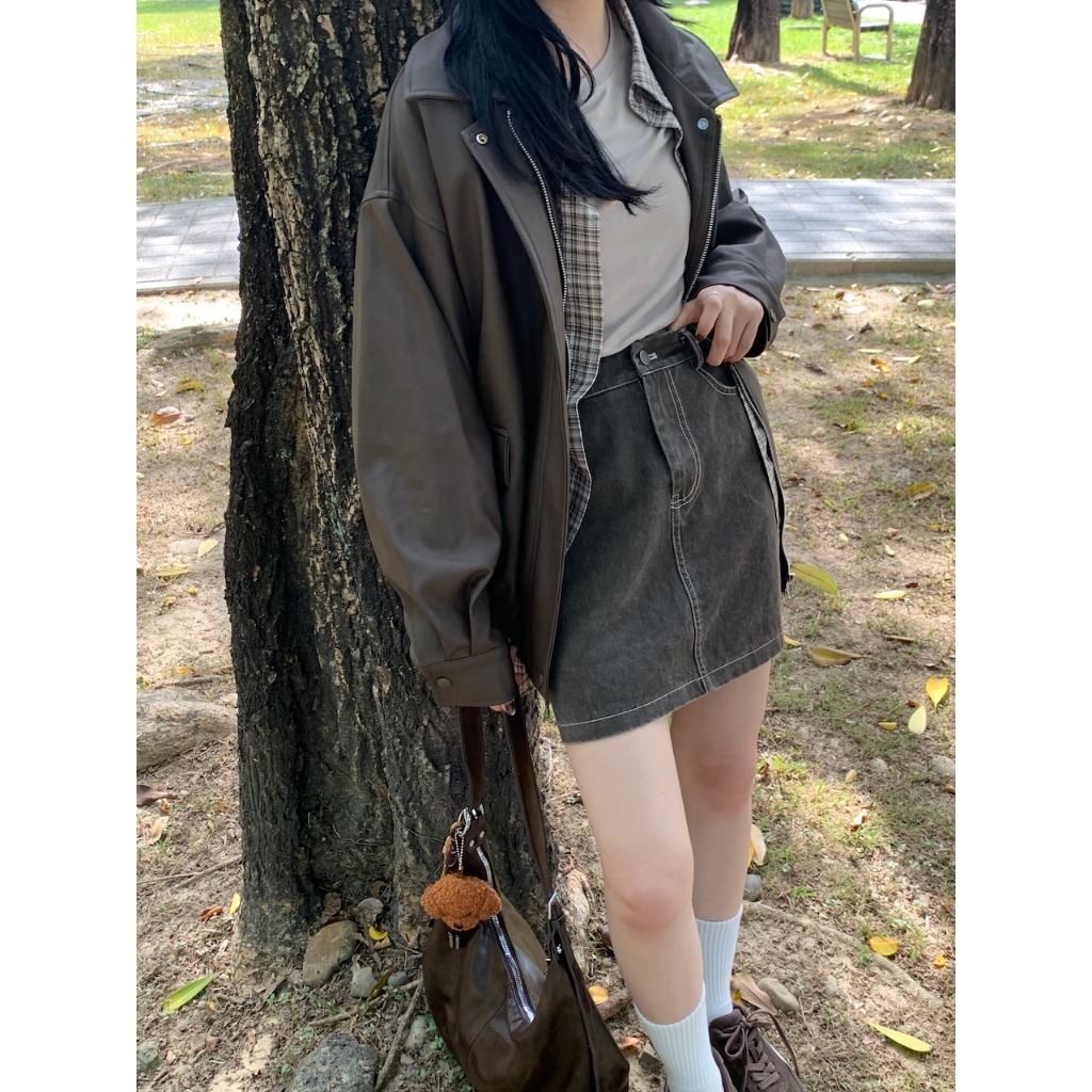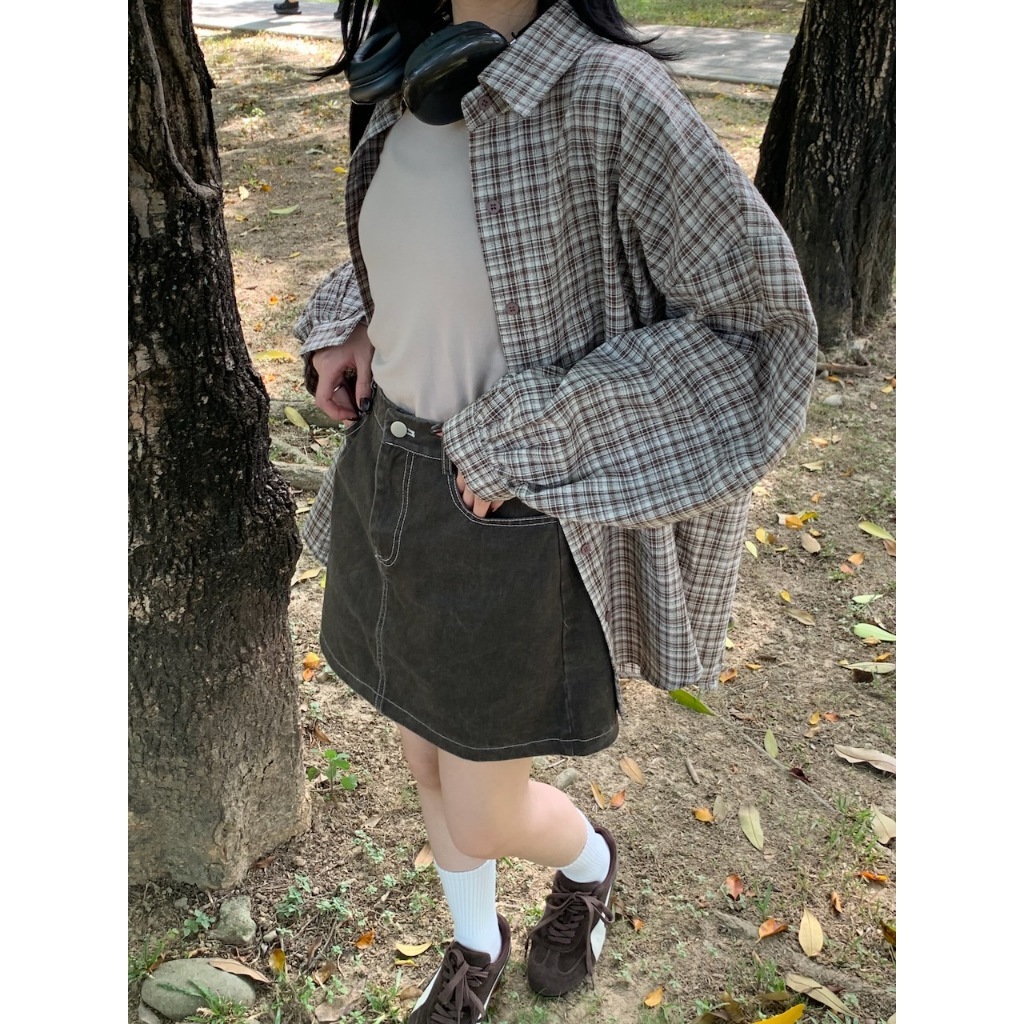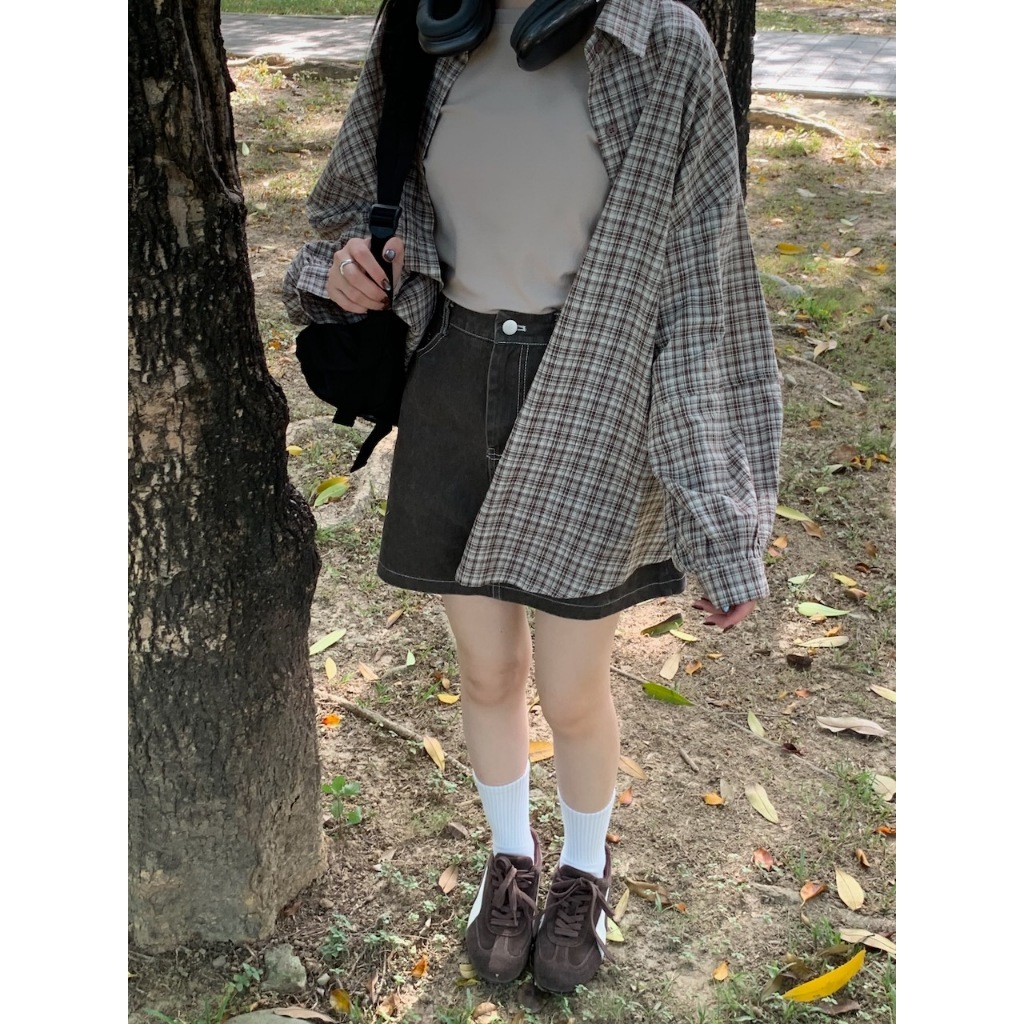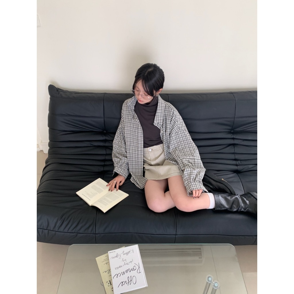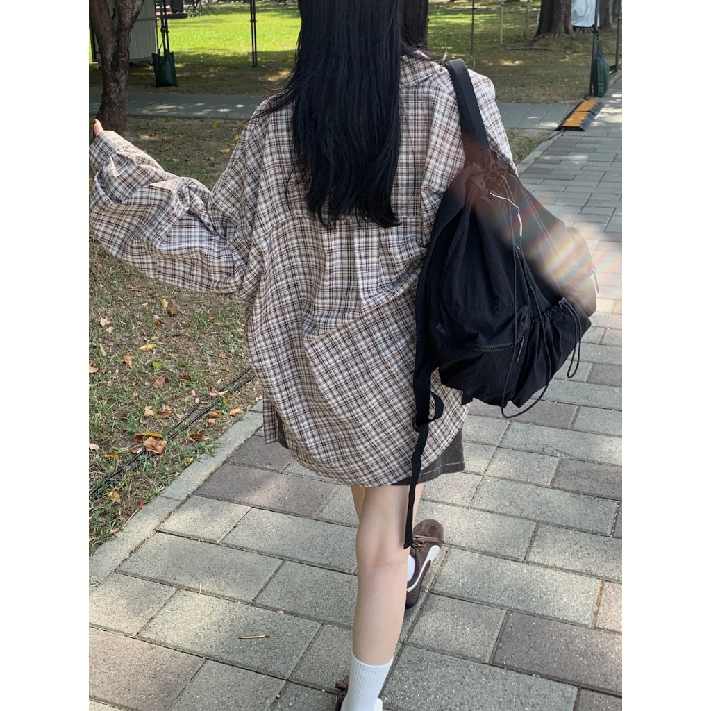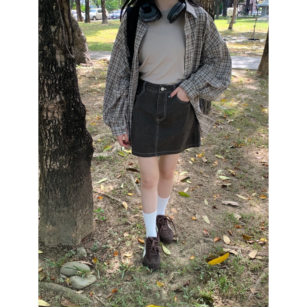 ※格紋 兩側開岔 袖子連接袖口處做澎 寬鬆 薄款微透 前短後'長