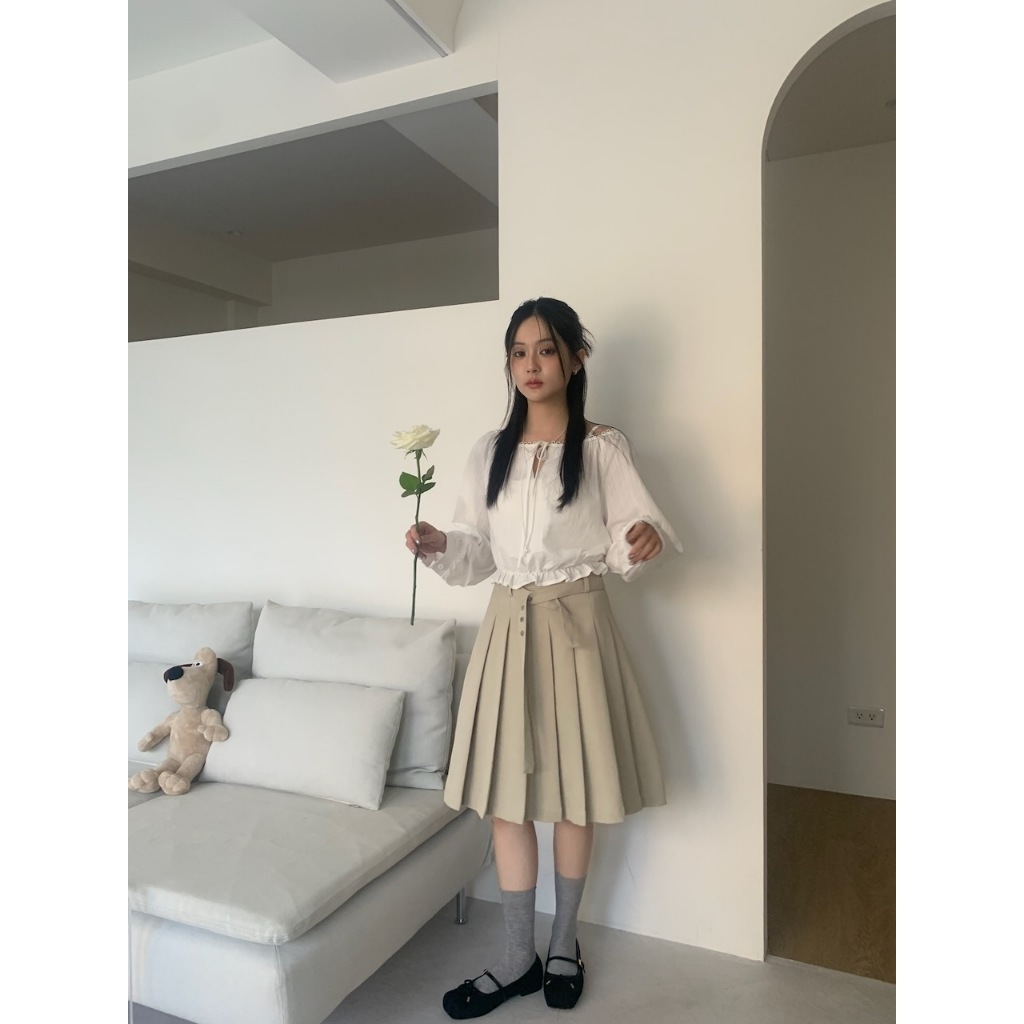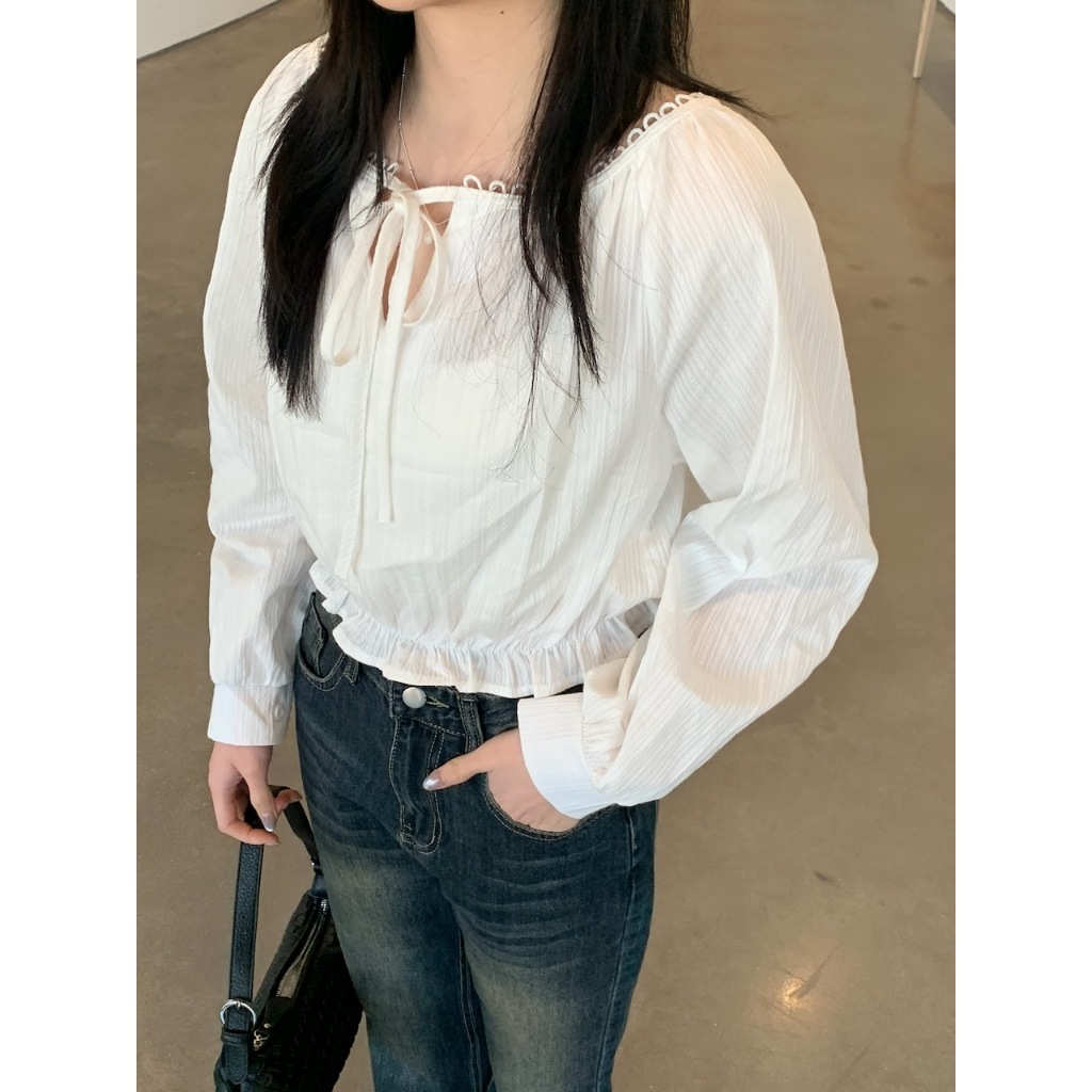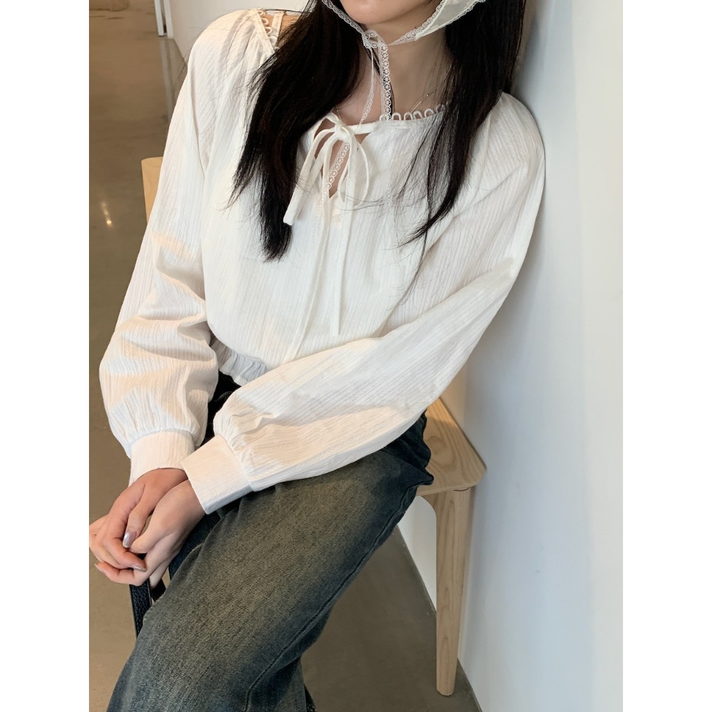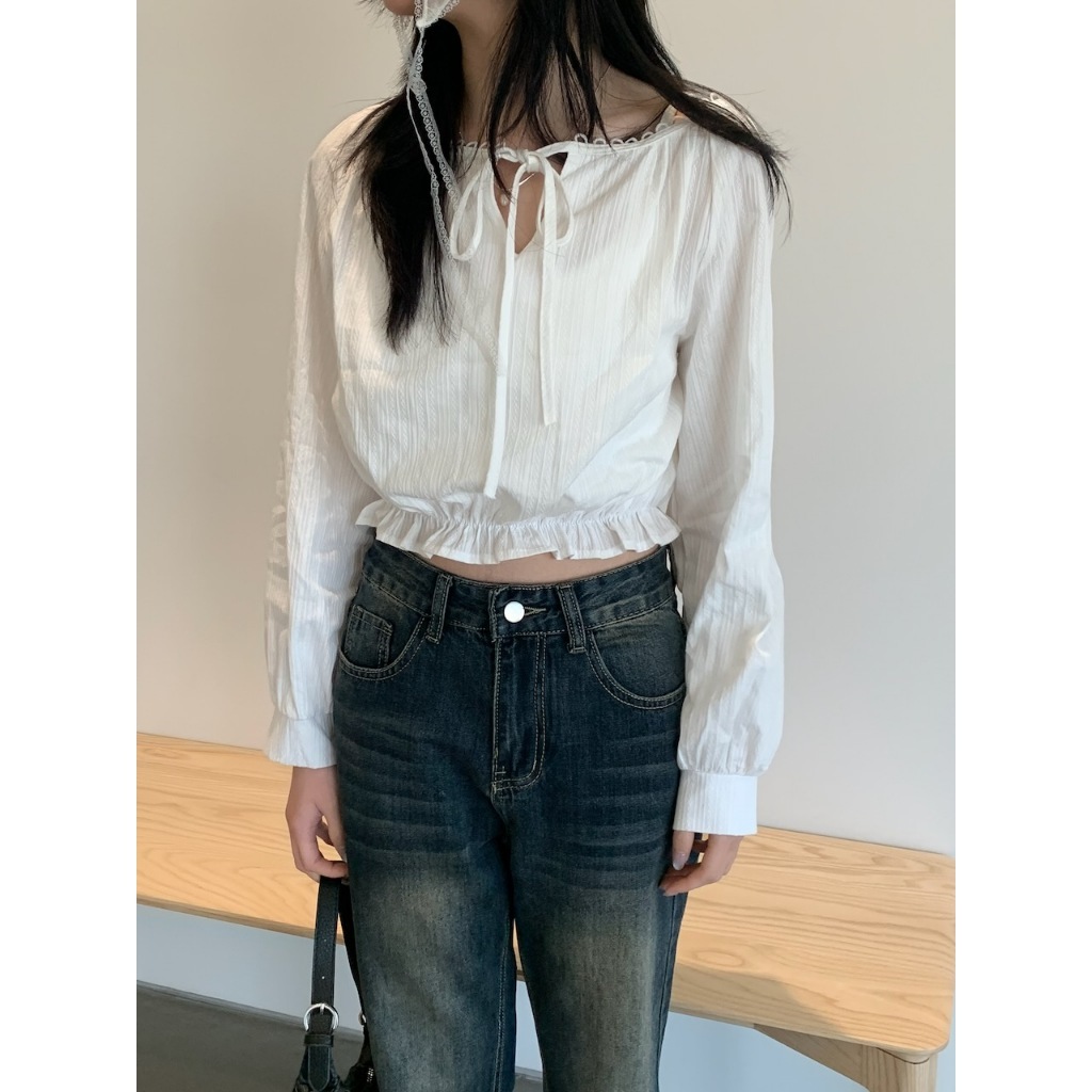 ※寬圓領 直菱格編織紋路 領口半圓簍空花邊設計 胸前蝴蝶結綁帶 下擺縮口荷葉邊 拋拋真鈕扣袖