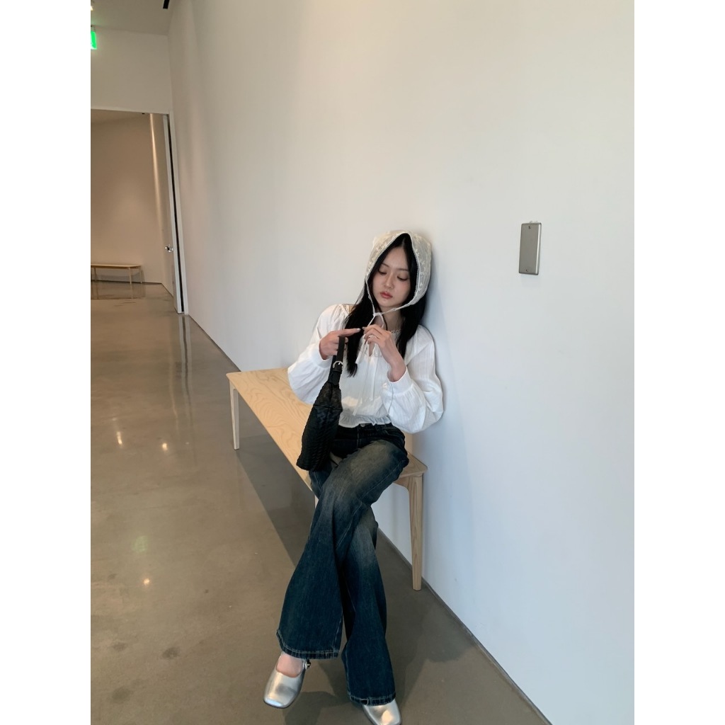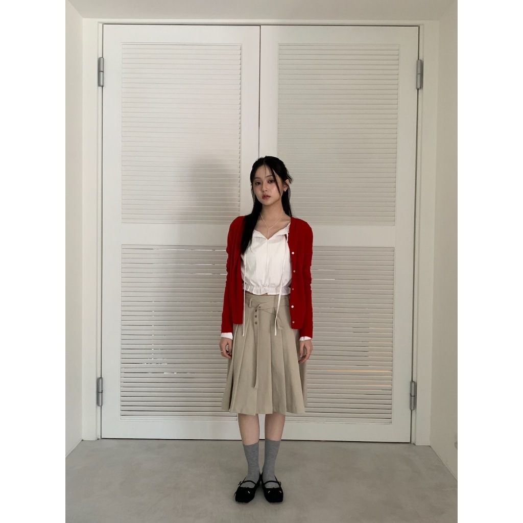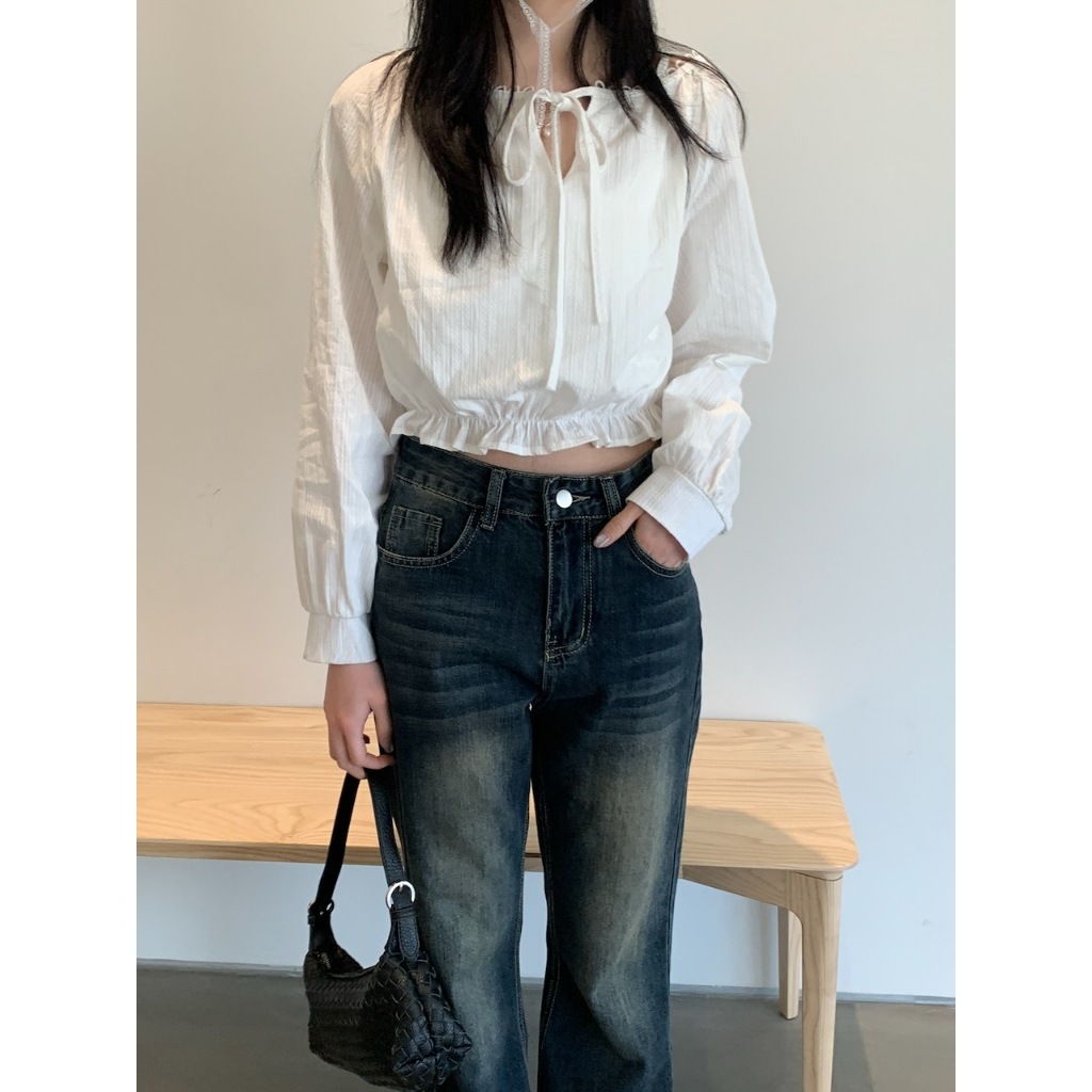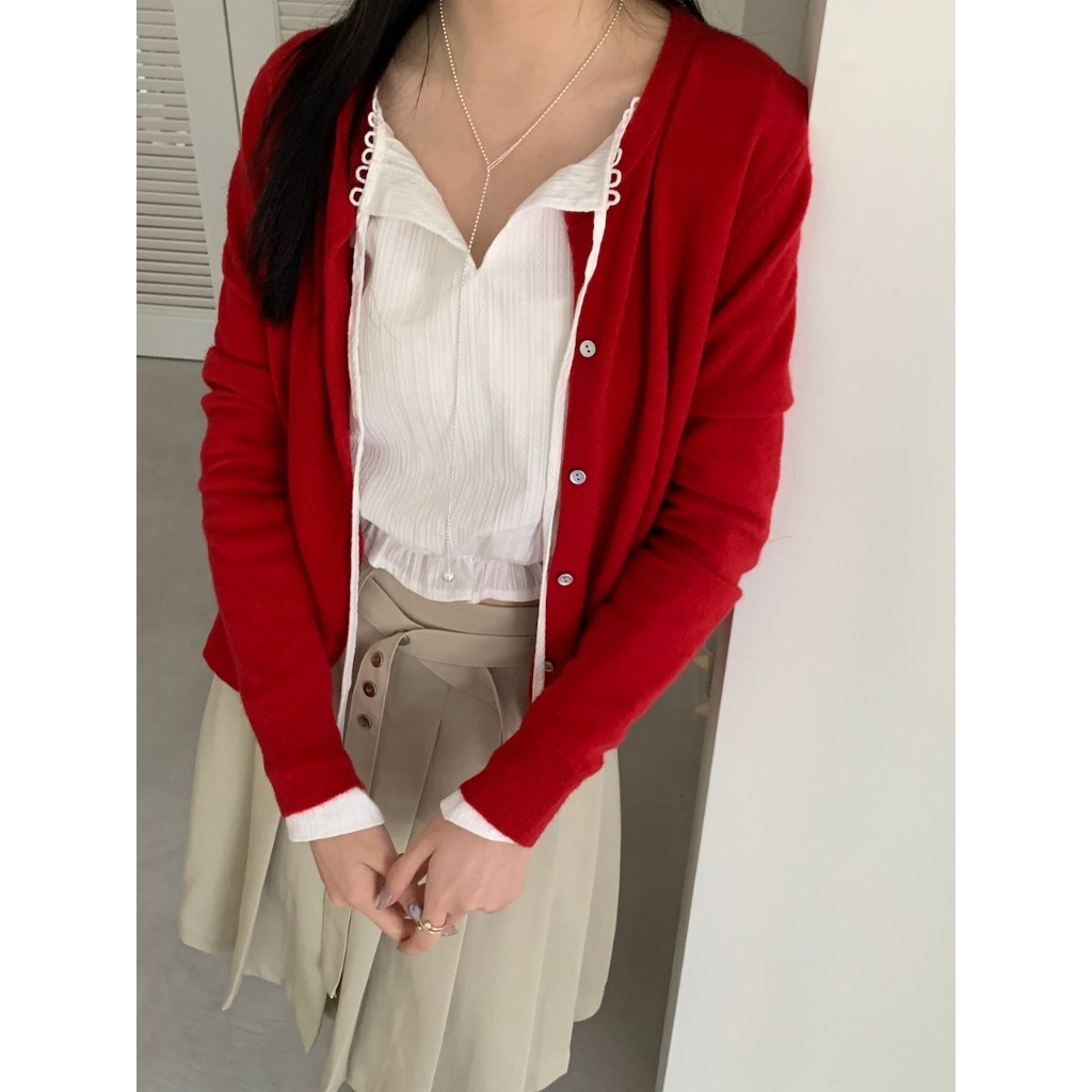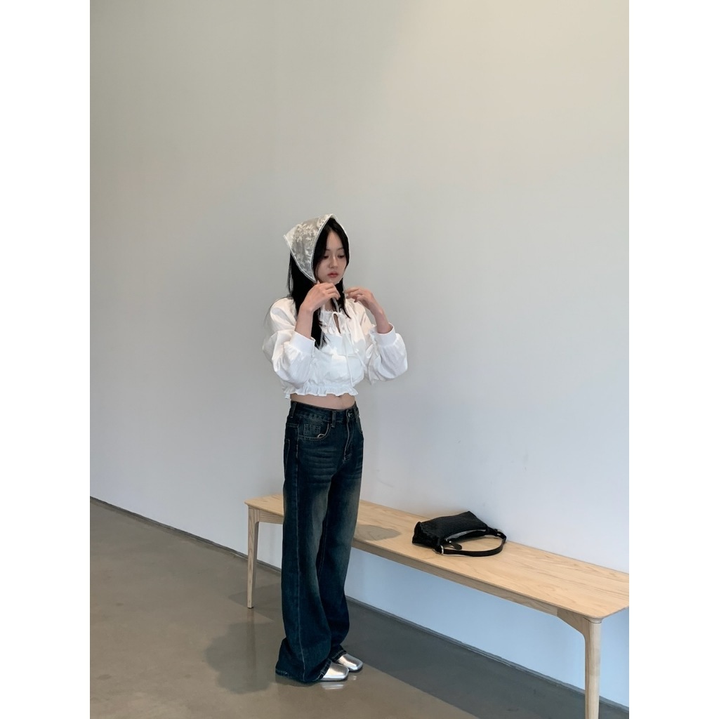※寬圓領 直菱格編織紋路 領口半圓簍空花邊設計 胸前蝴蝶結綁帶 下擺縮口荷葉邊 拋拋真鈕扣袖