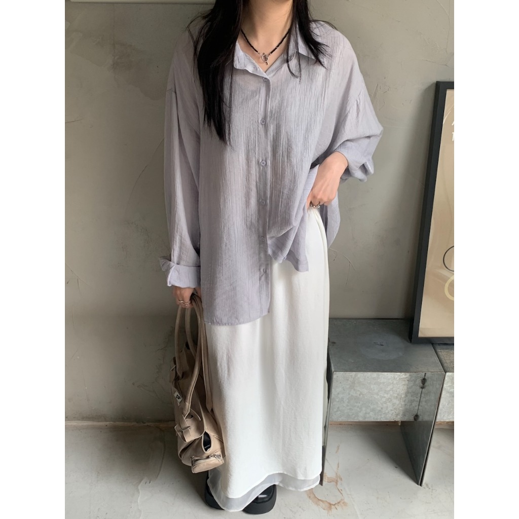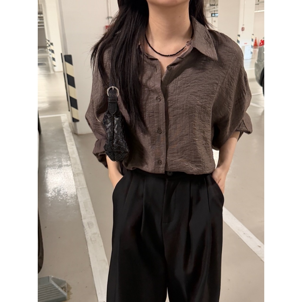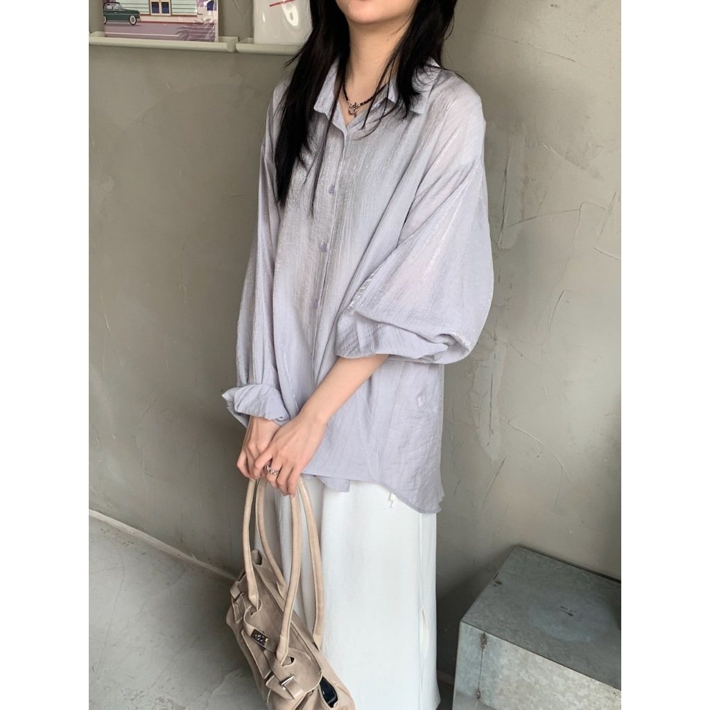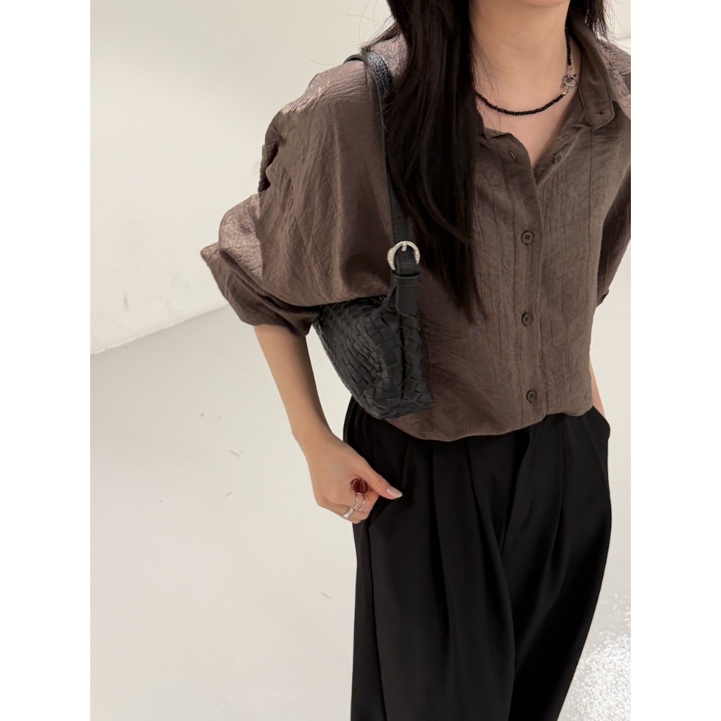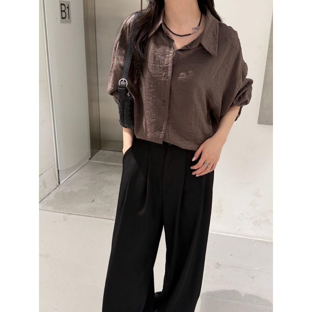 ※長版落肩襯衫 有領 微金絲布料 縐褶紋路感設計 後下擺圓弧 真排釦式 素色