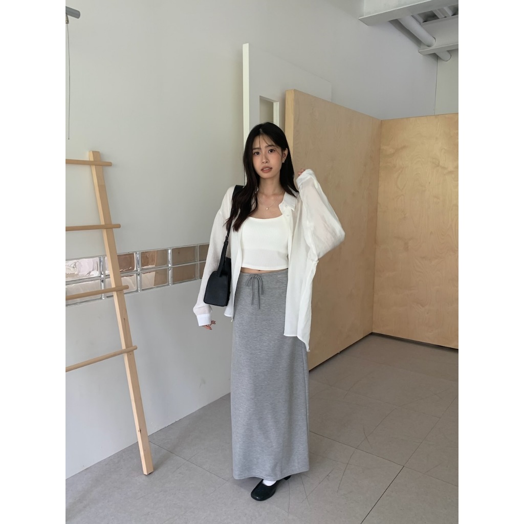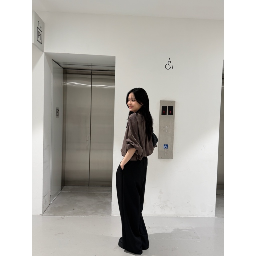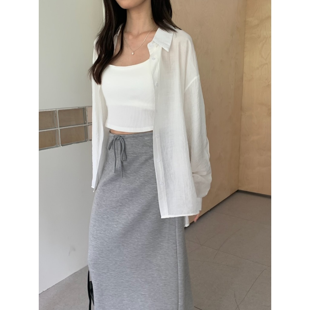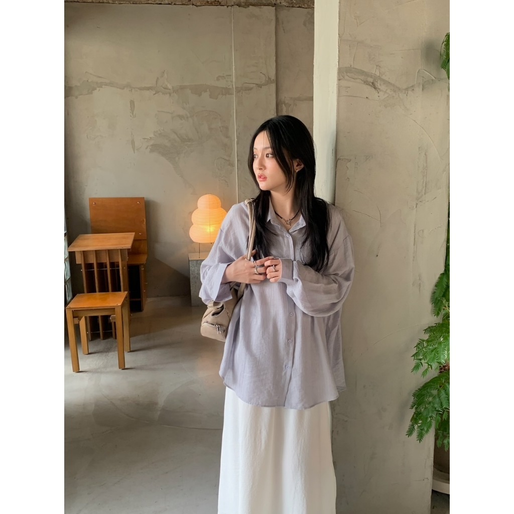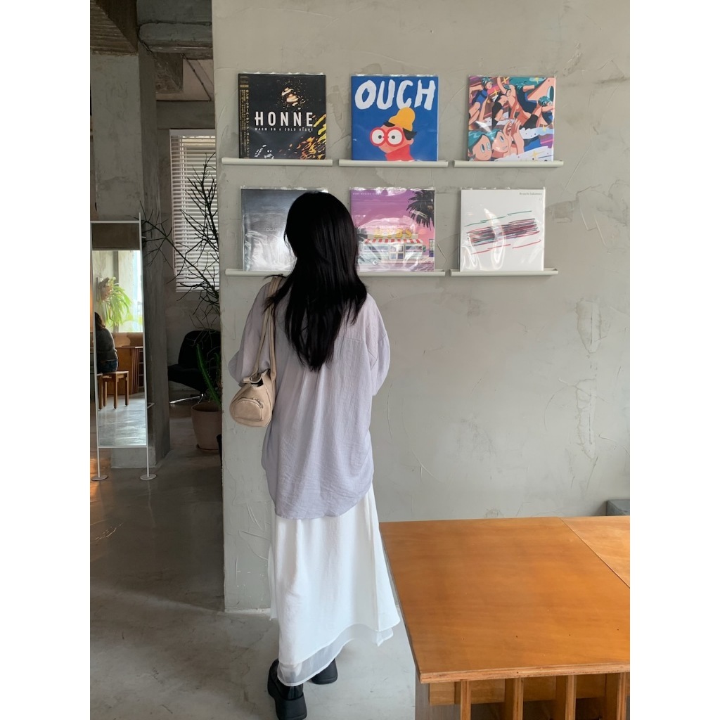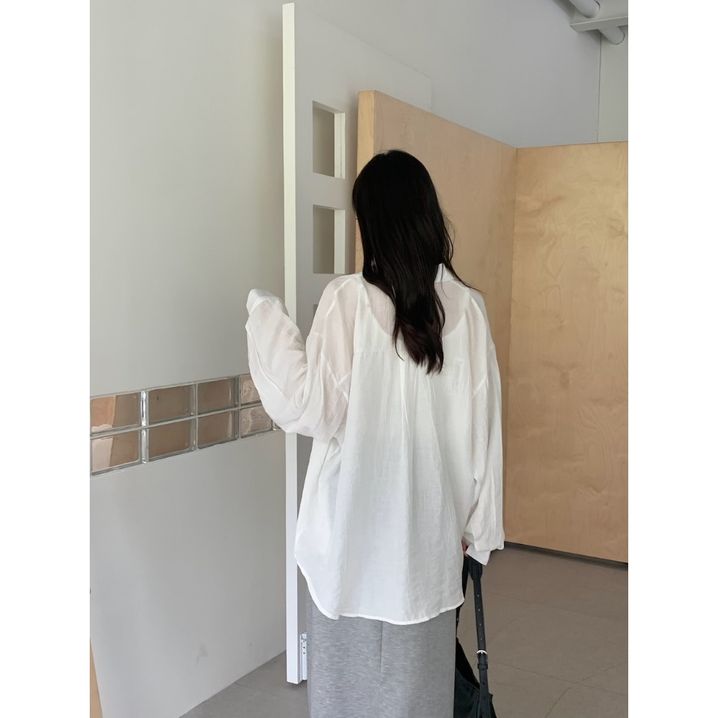 ※長版落肩襯衫 有領 微金絲布料 縐褶紋路感設計 後下擺圓弧 真排釦式 素色