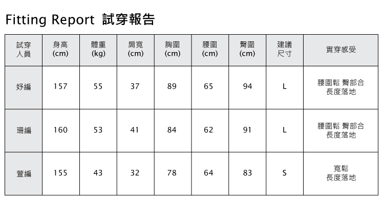 尺寸:S、M、L平量單位:公分照片麻豆郁芯:155/43Joan:160/47S 腰圍32 臀圍44 大腿圍27 褲襠前31後34 褲管寬23 全長101