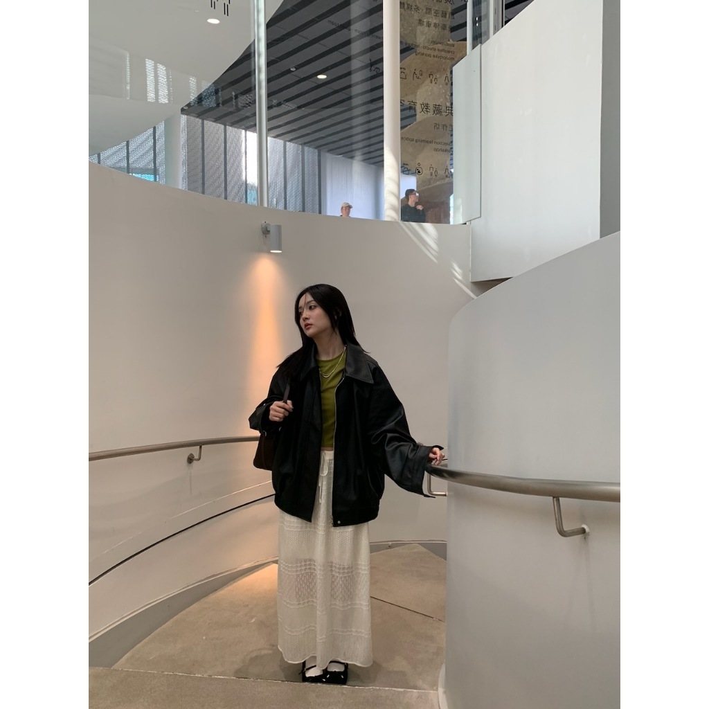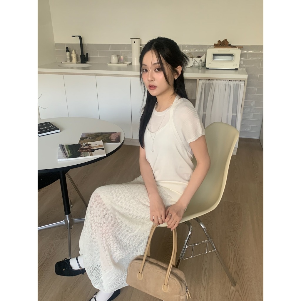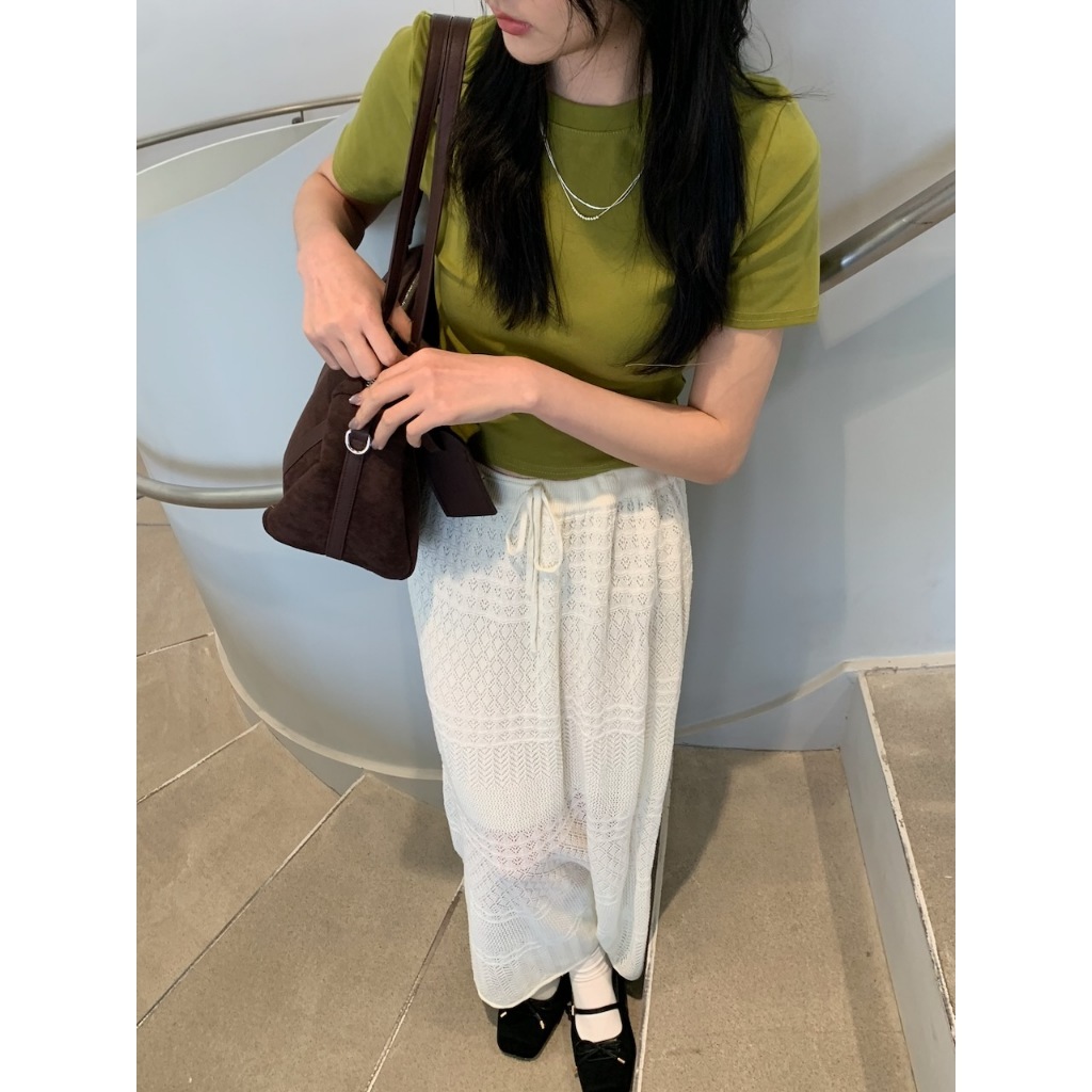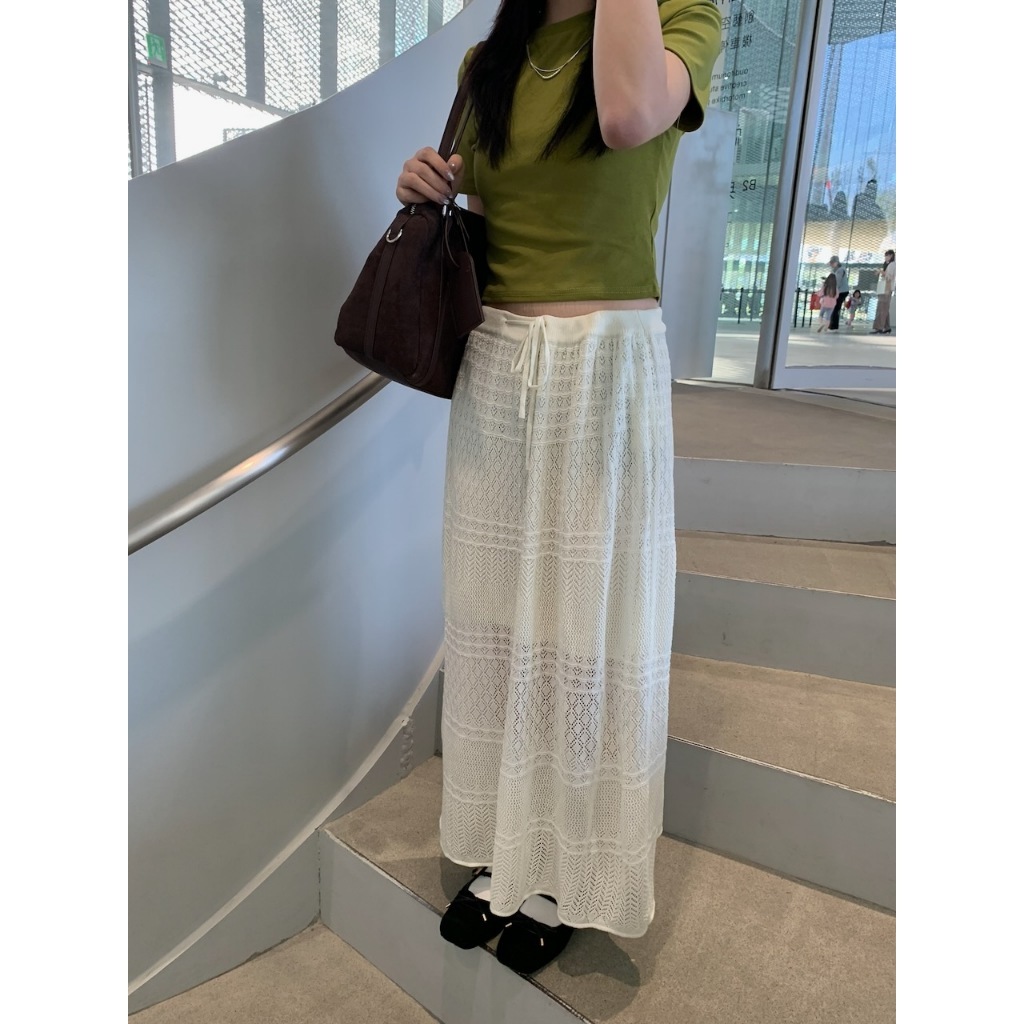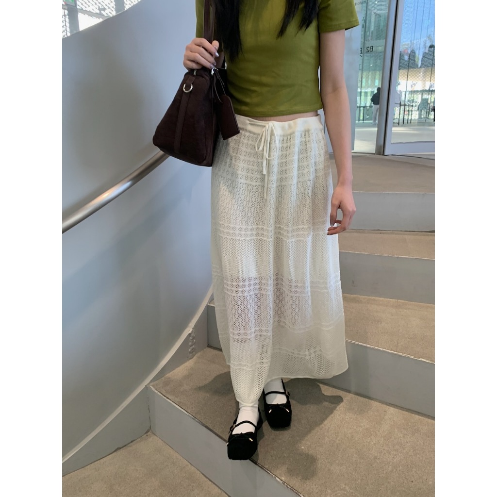 ※長板針織A字裙 腰圍整圈綁帶設計 鉤針編織紋理設計 內裡有安全褲