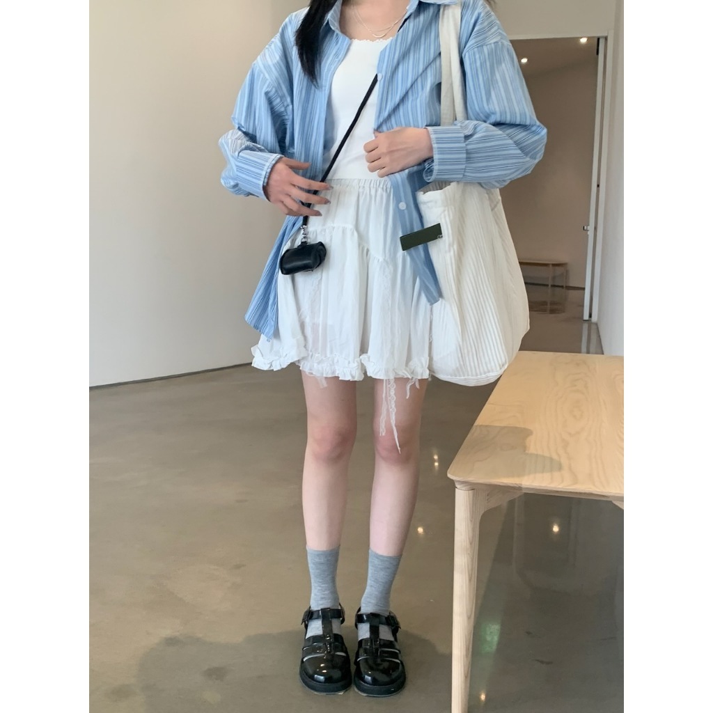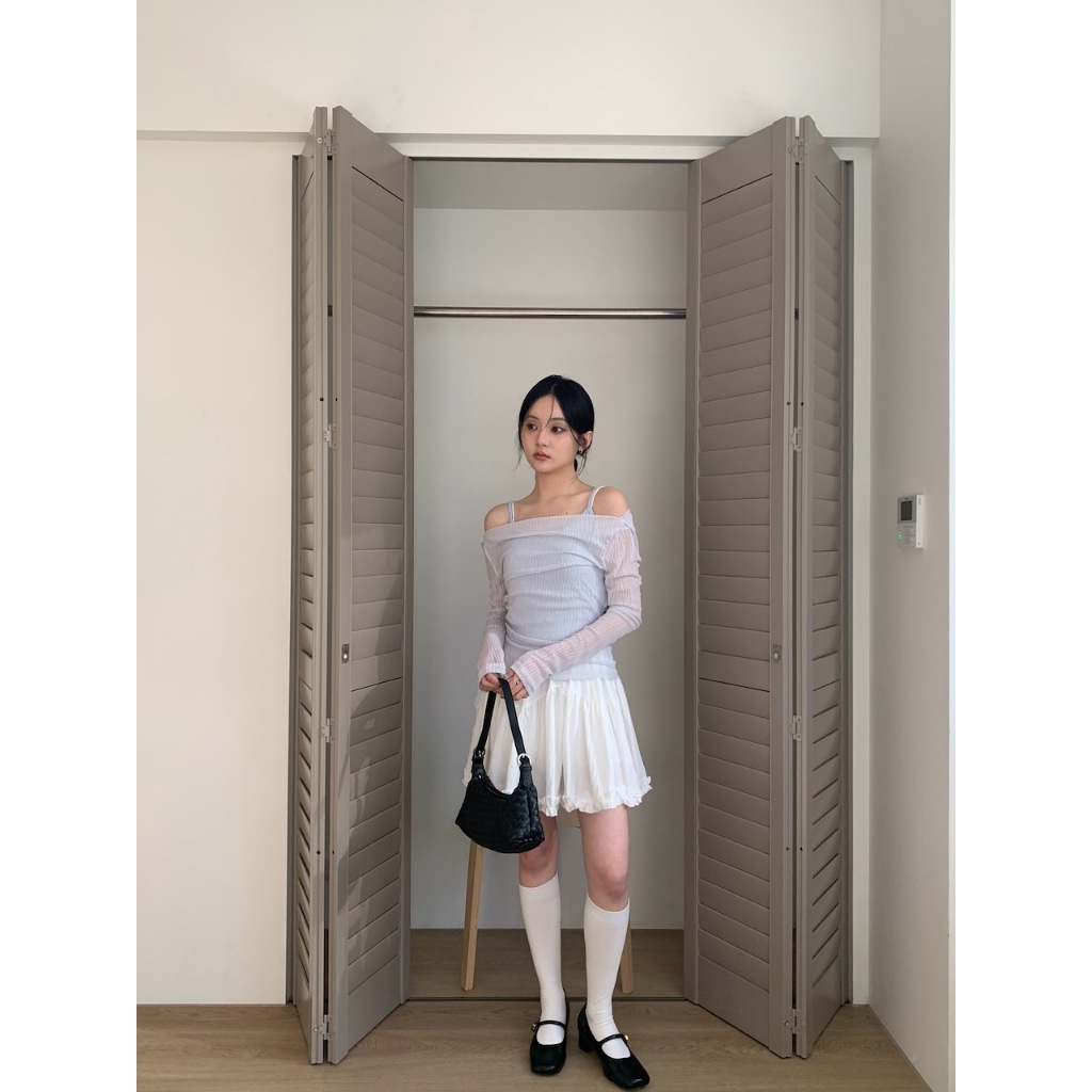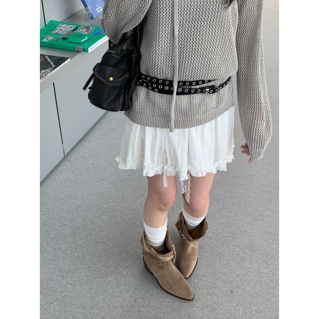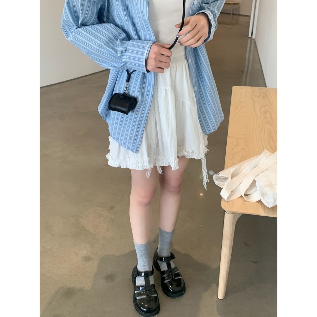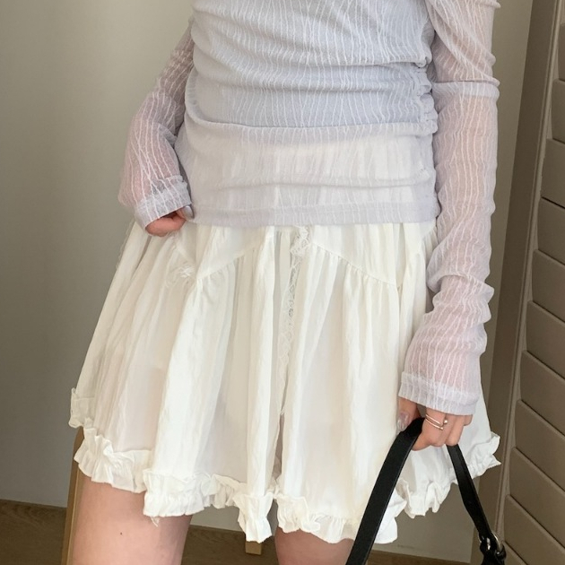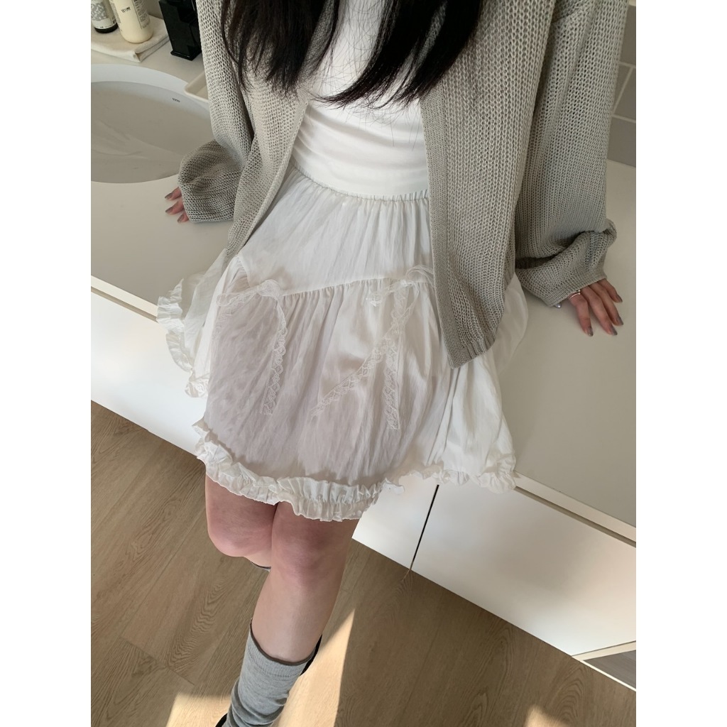 ※高腰蛋糕短裙 腰圍整圈鬆緊 前面蕾絲蝴蝶結設計 下擺荷葉邊 內裡有安全褲