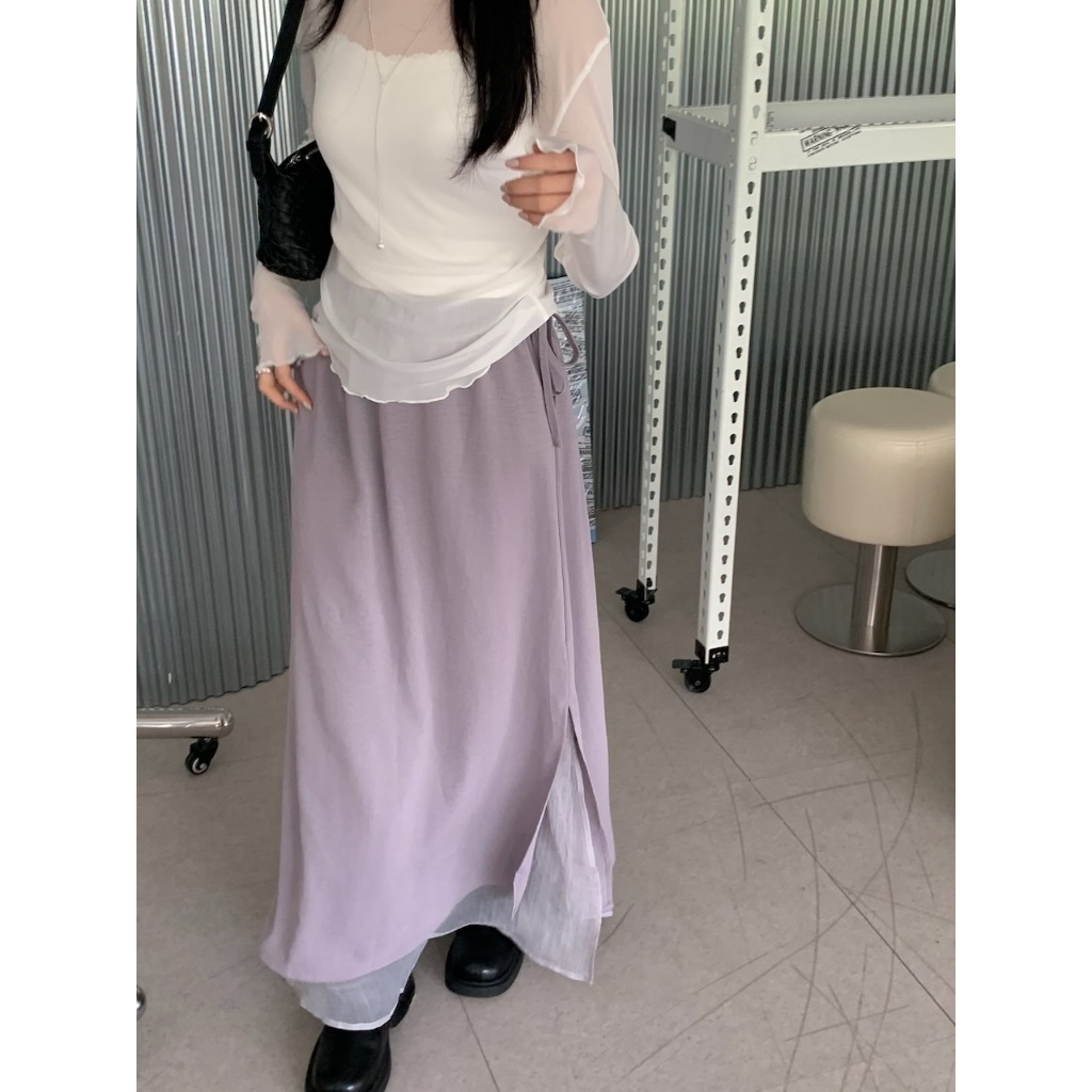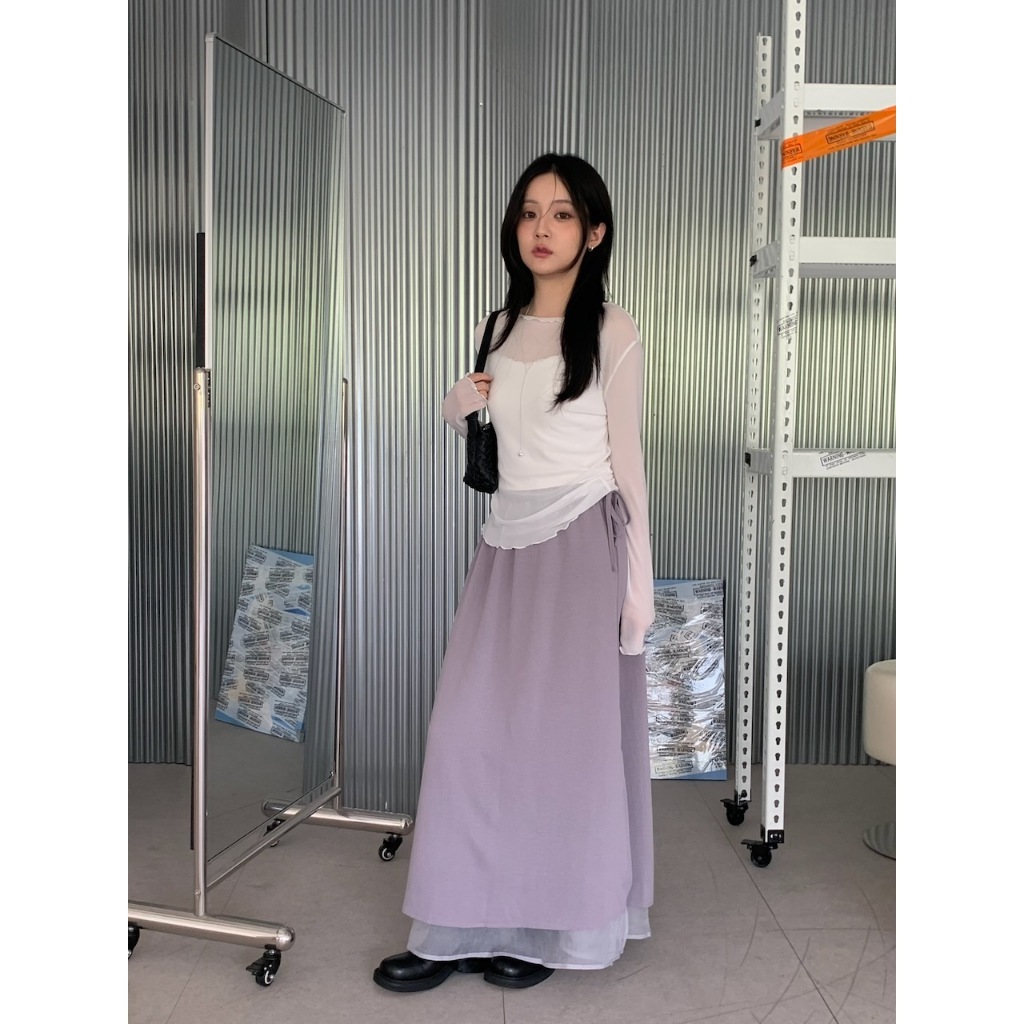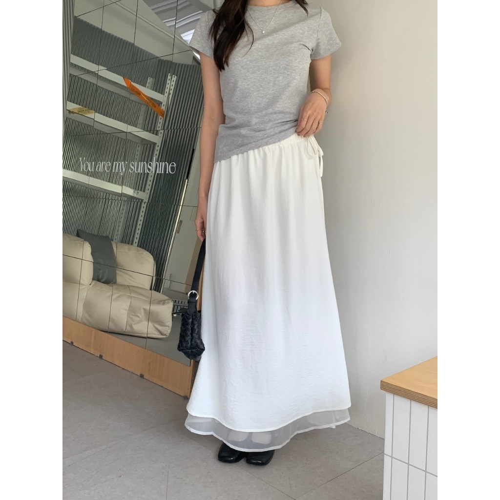 ※A字長裙 腰圍側拉繩縮口 單邊側開衩 內層網紗 可雙面穿 下擺層次長短 素色