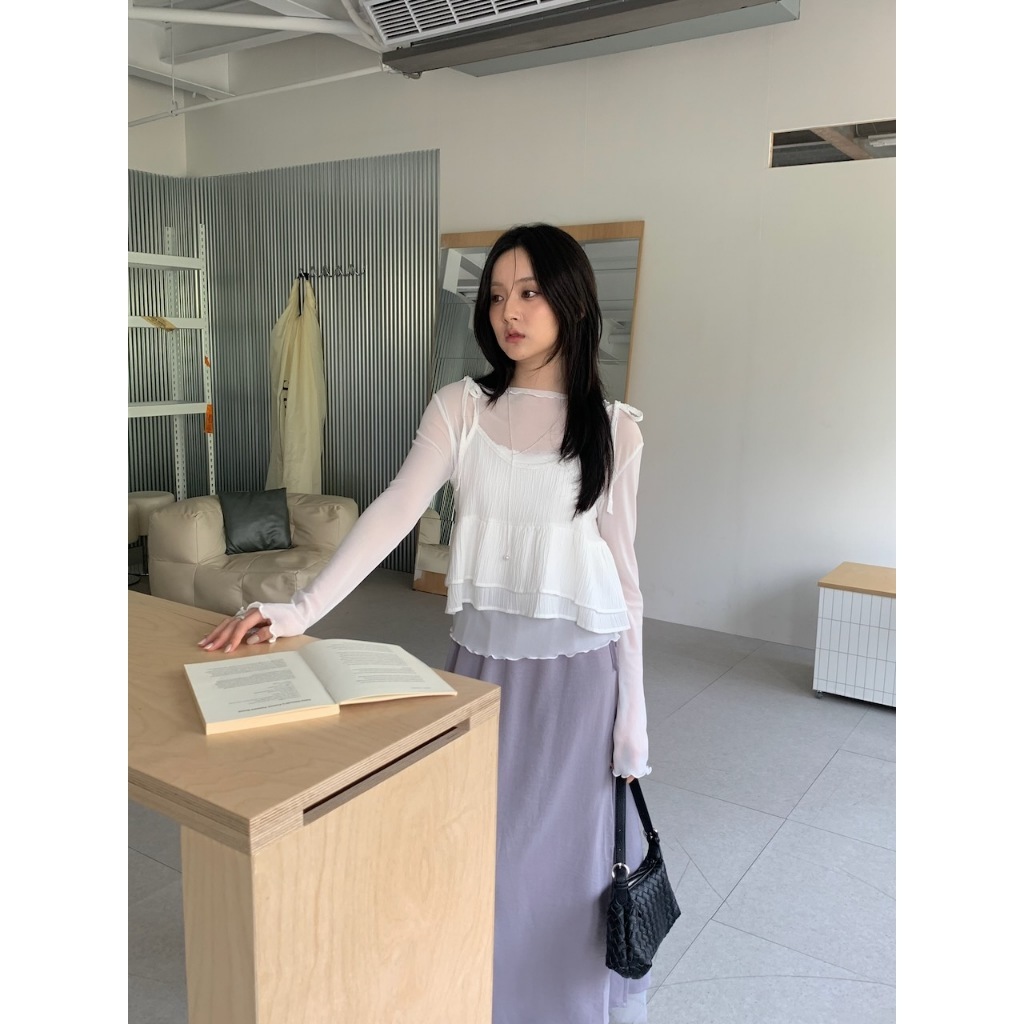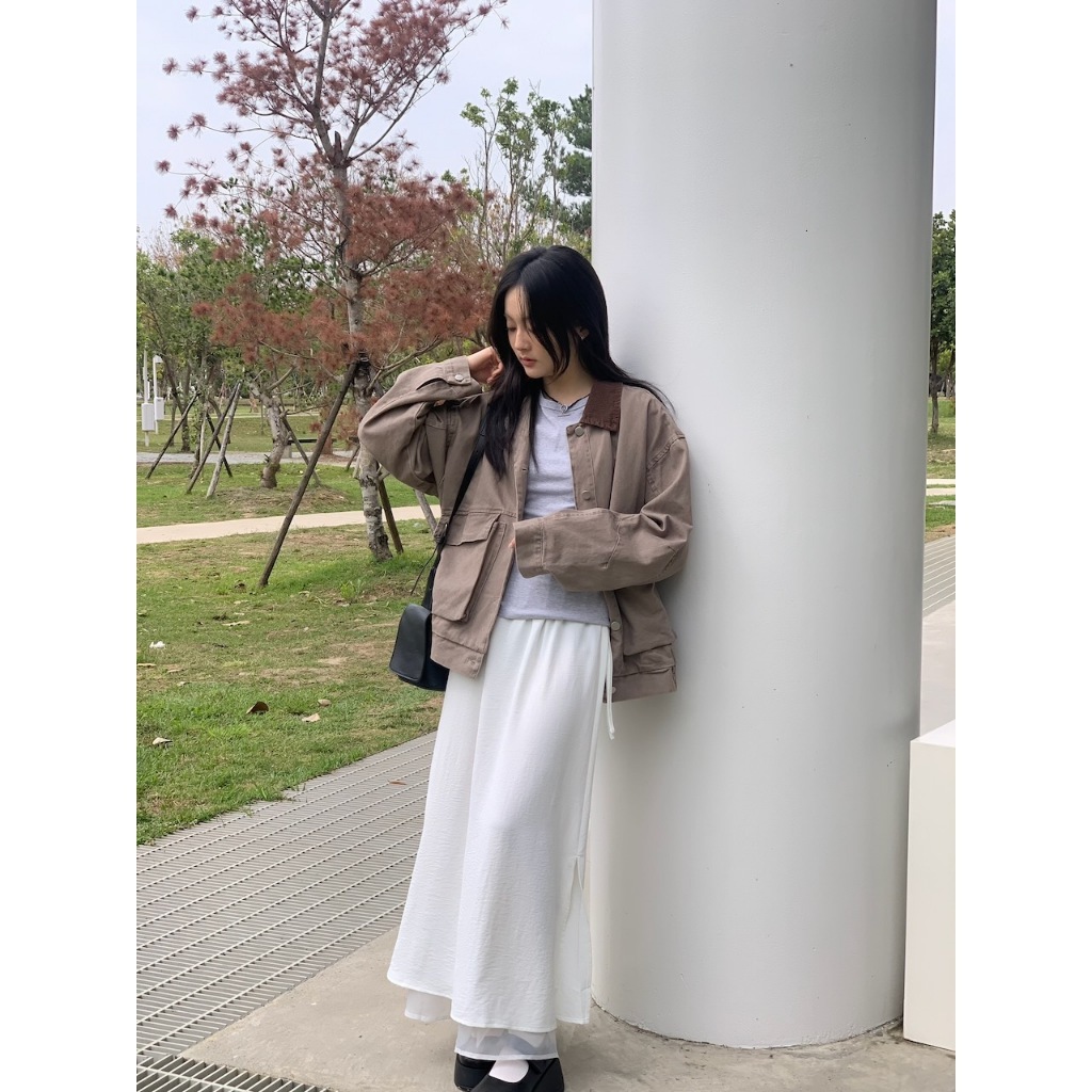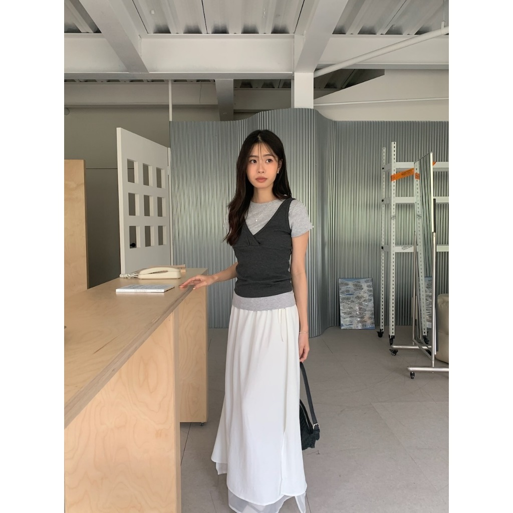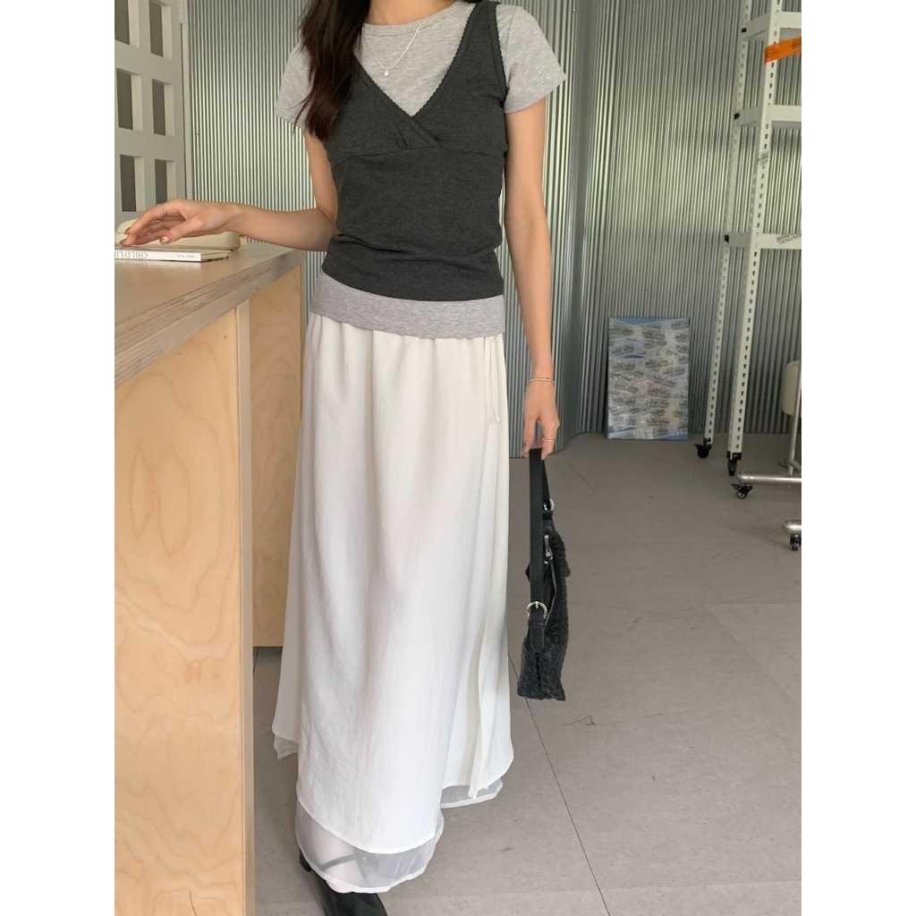 ※A字長裙 腰圍側拉繩縮口 單邊側開衩 內層網紗 可雙面穿 下擺層次長短 素色