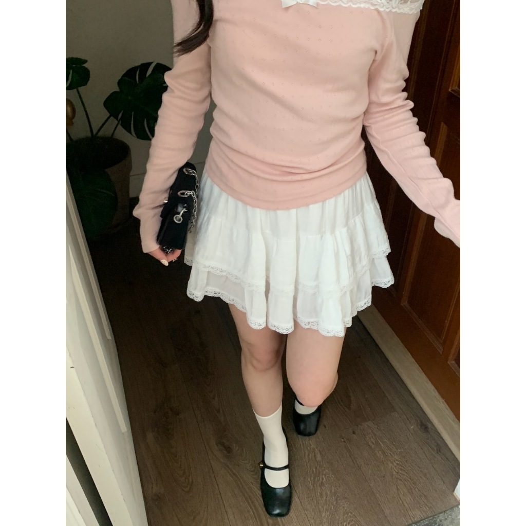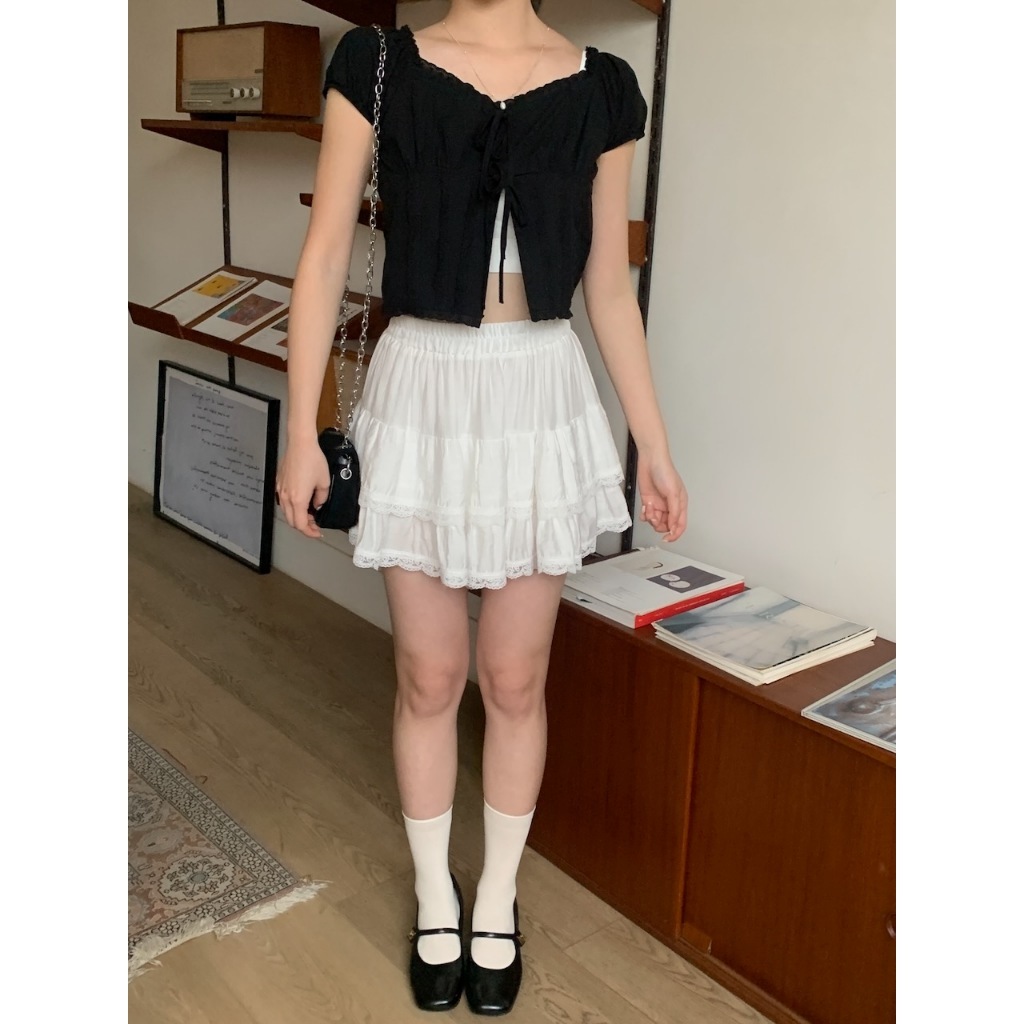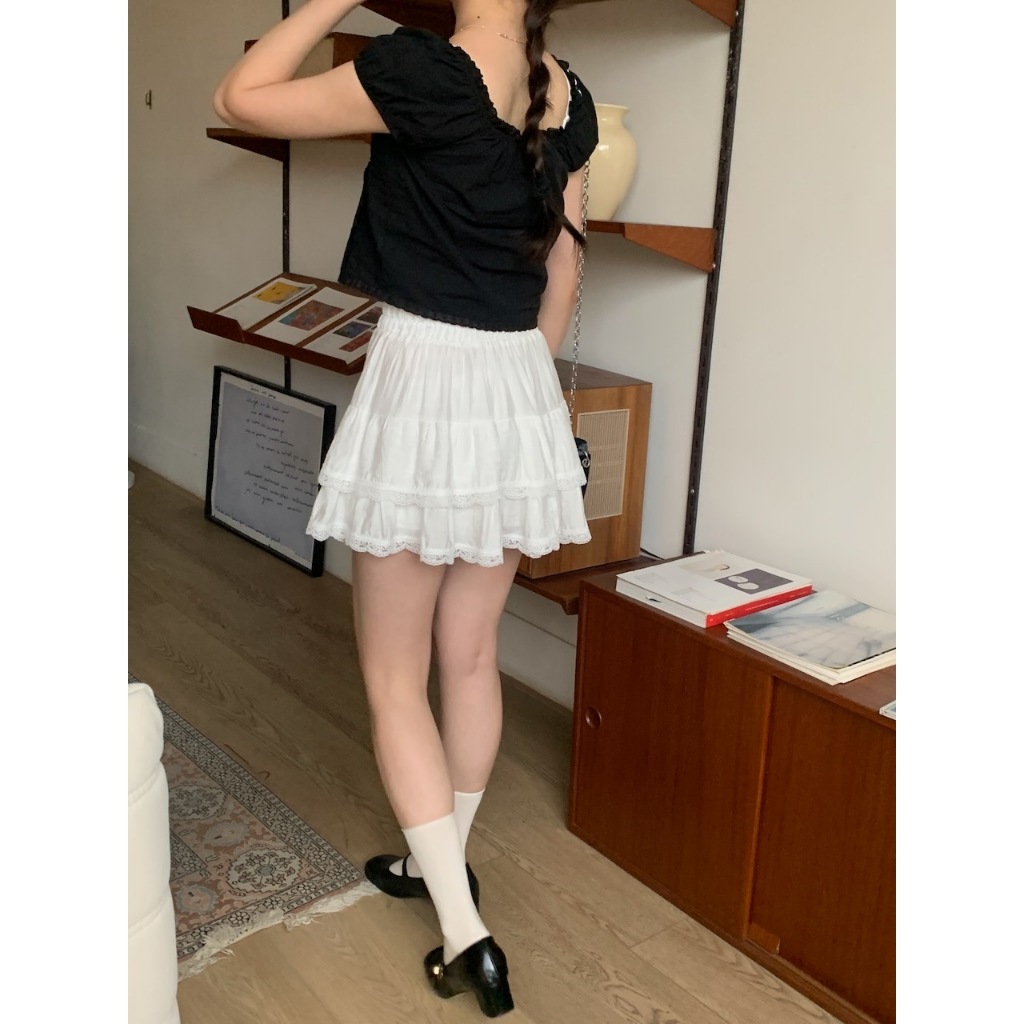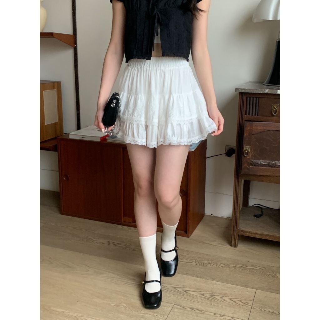 ※A字蛋糕短裙 裙擺拼接圓弧形蕾絲花邊 棉麻感 腰圍整圈鬆緊帶 有安全褲