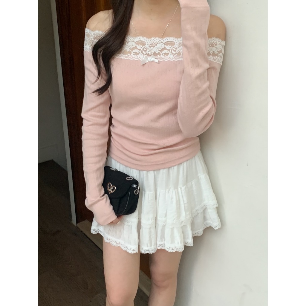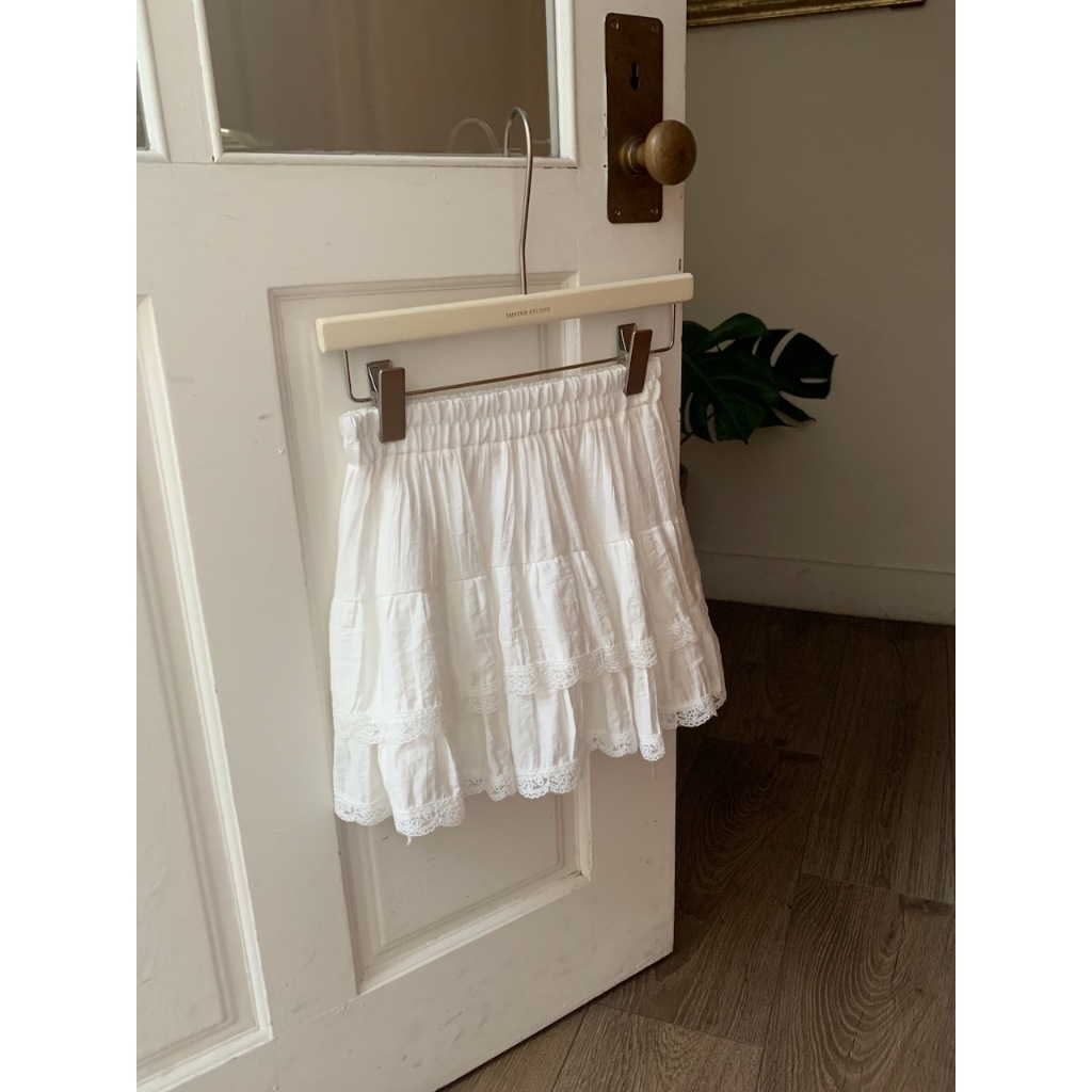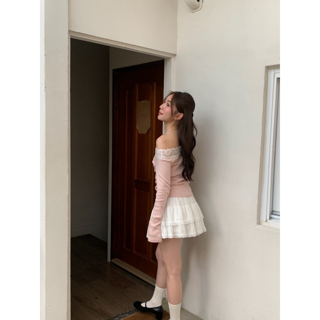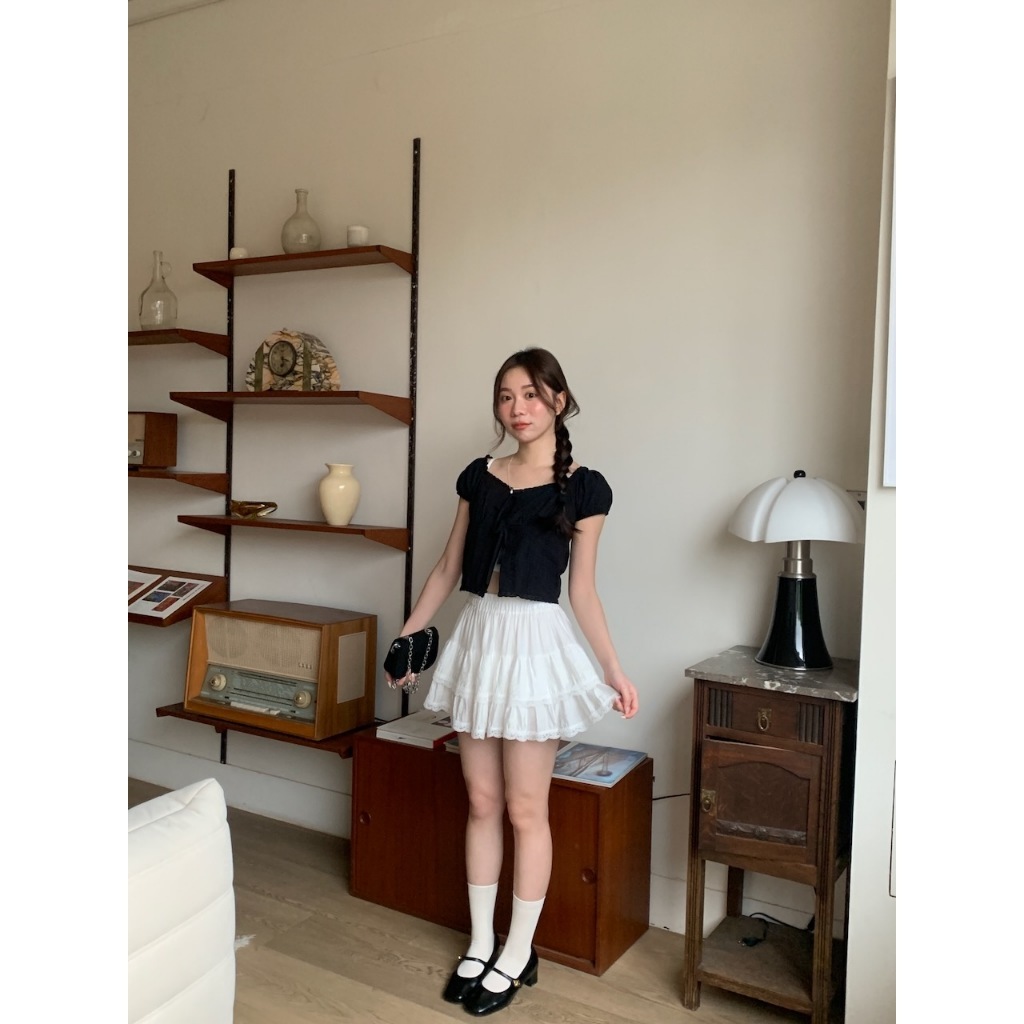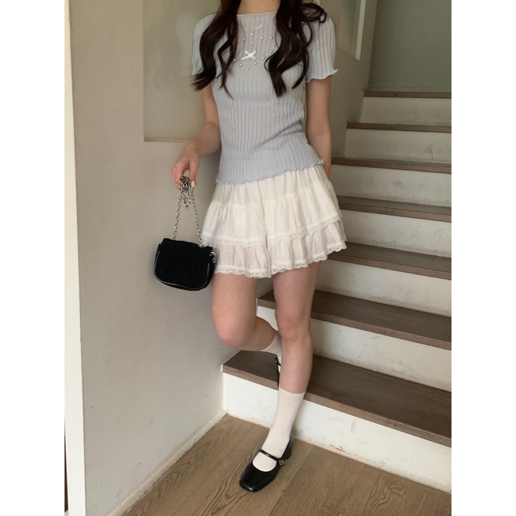 ※A字蛋糕短裙 裙擺拼接圓弧形蕾絲花邊 棉麻感 腰圍整圈鬆緊帶 有安全褲