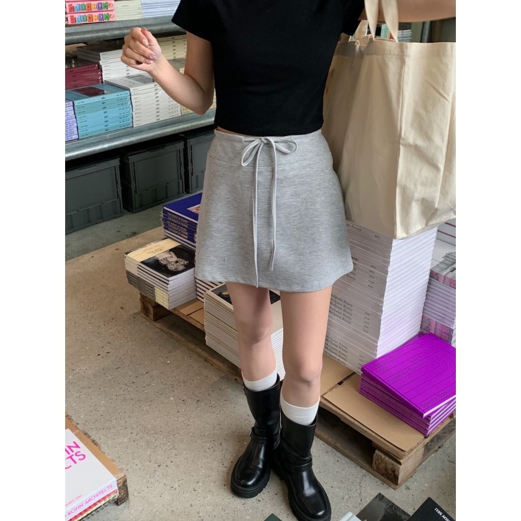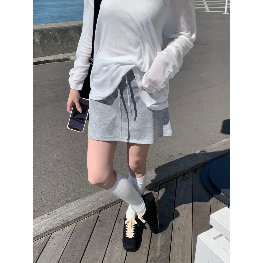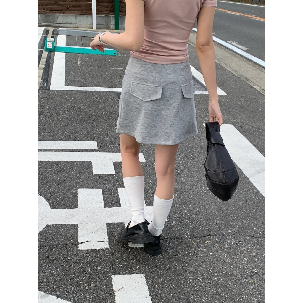 ※A字短裙 太空棉材質 腰圍前綁帶式 後面兩邊假口袋設計 有安全褲 素色 微滑面感