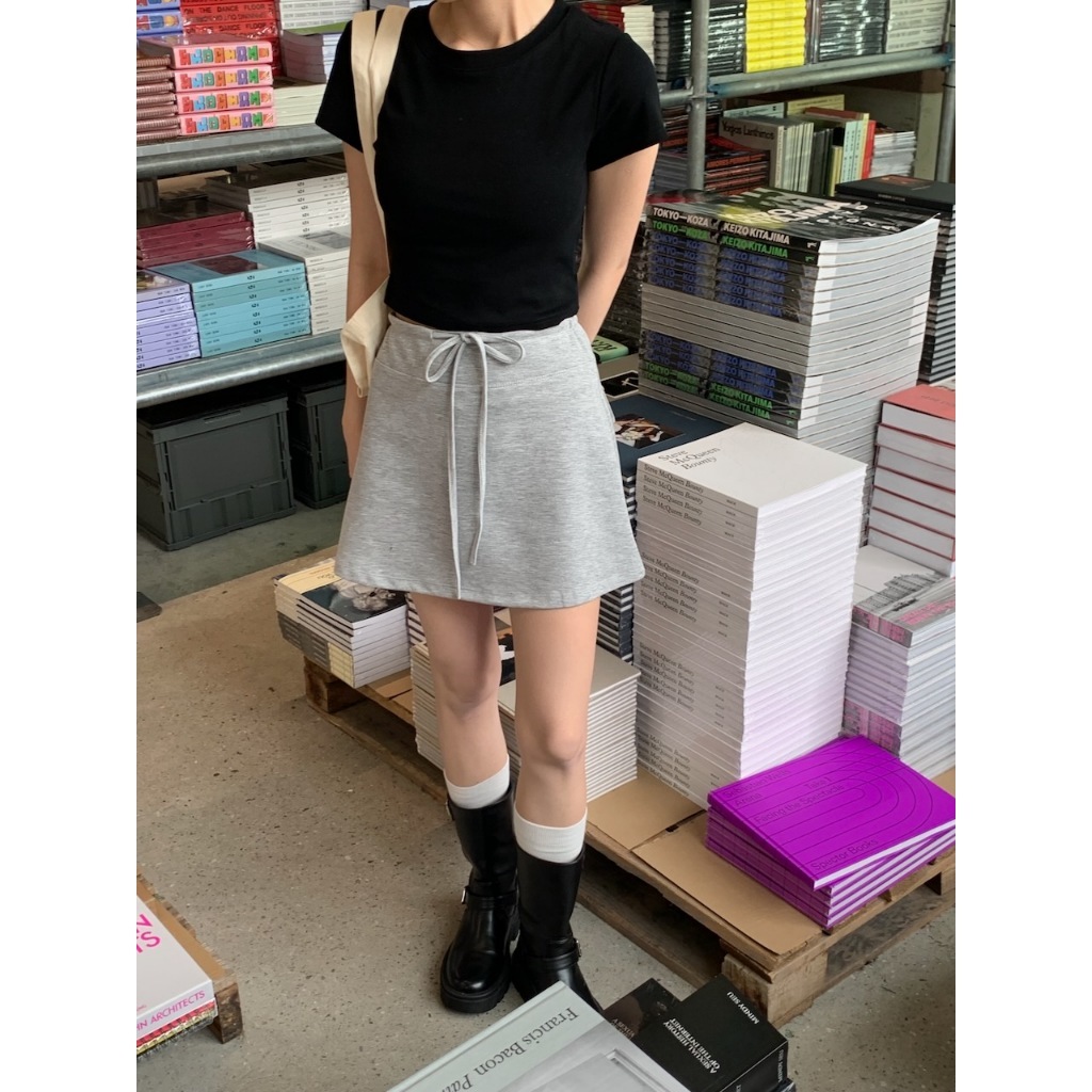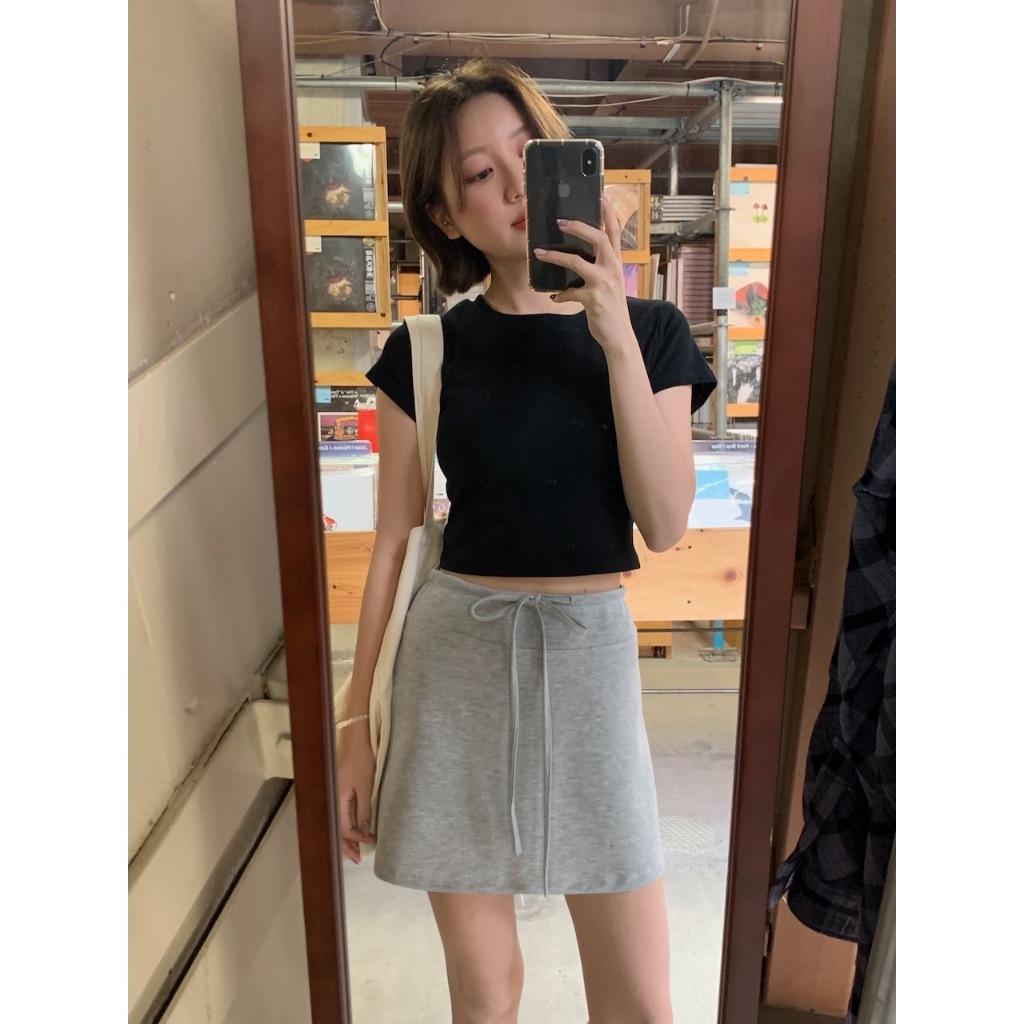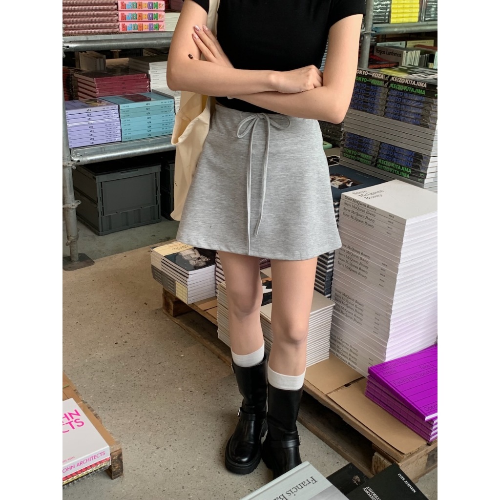 ※A字短裙 太空棉材質 腰圍前綁帶式 後面兩邊假口袋設計 有安全褲 素色 微滑面感
