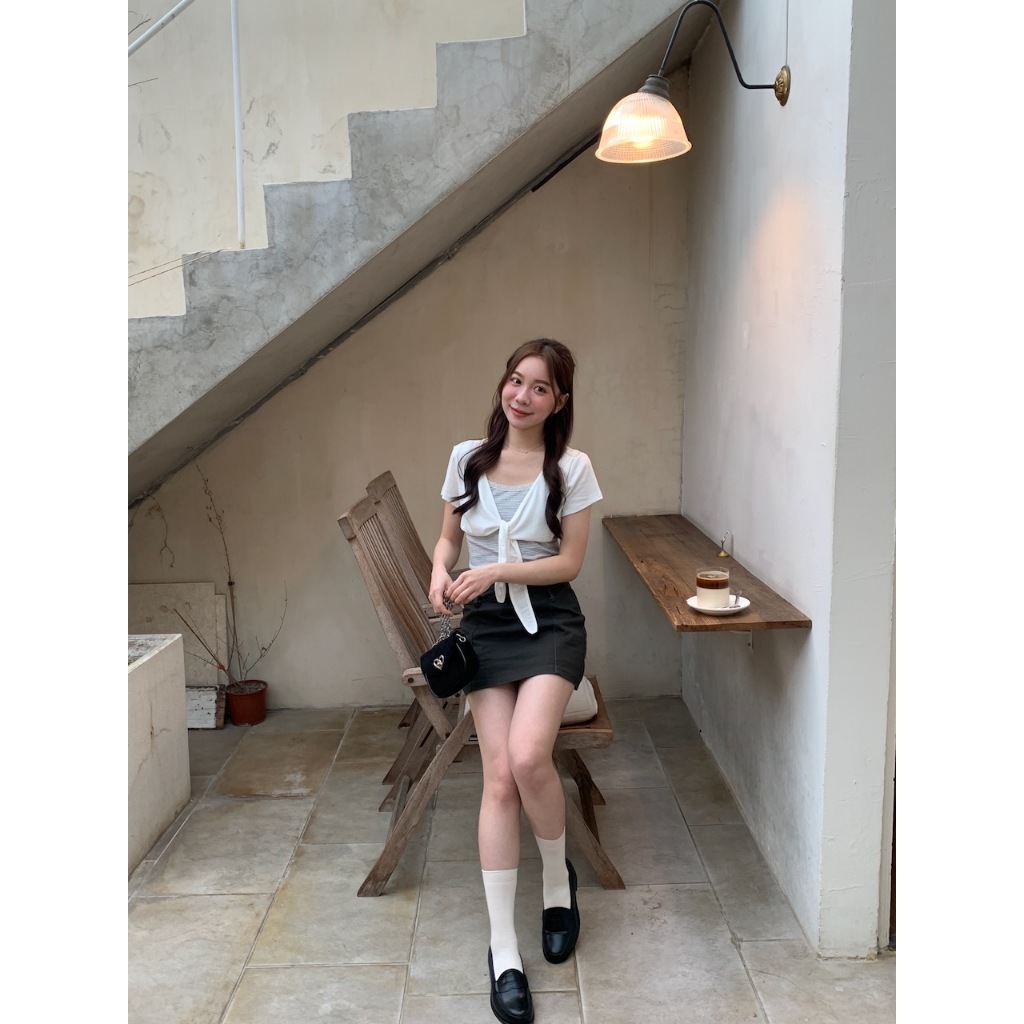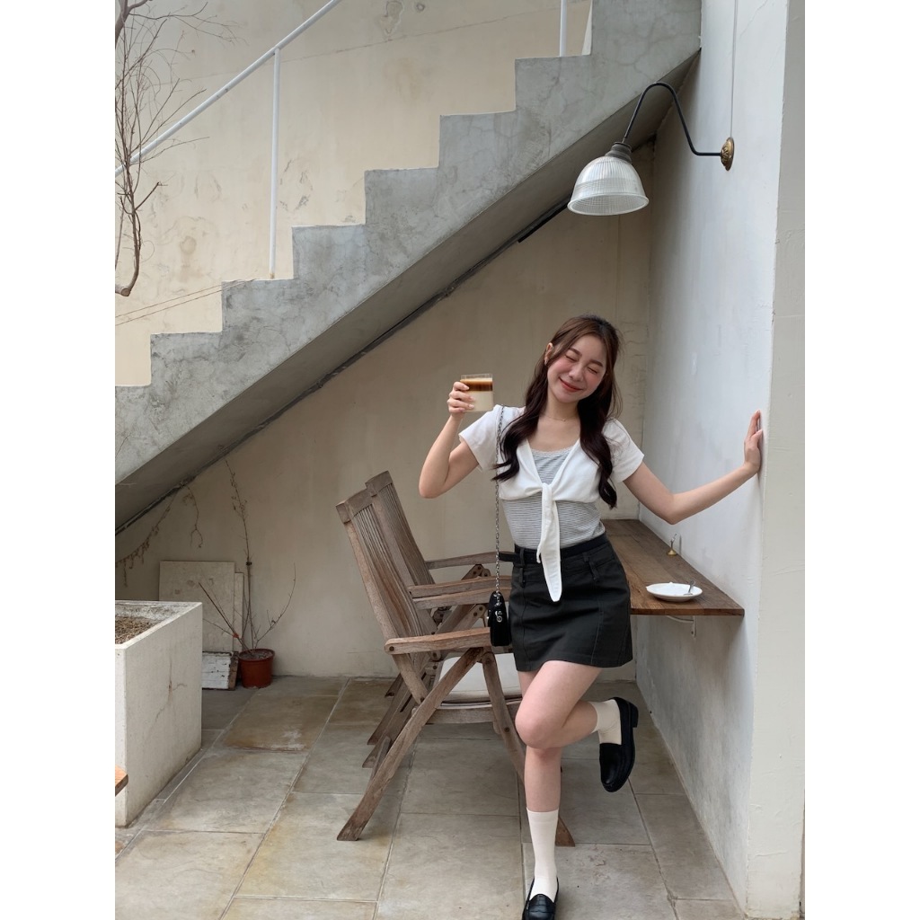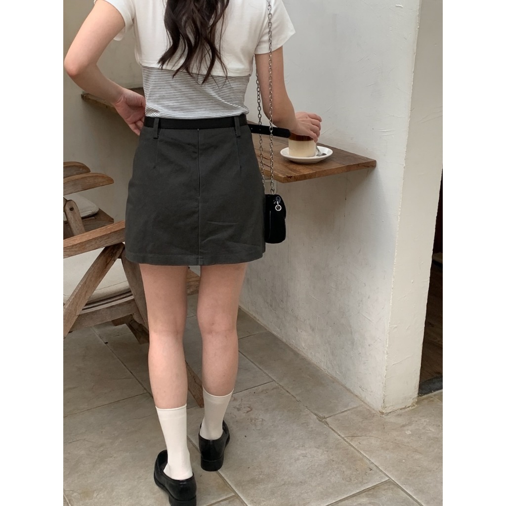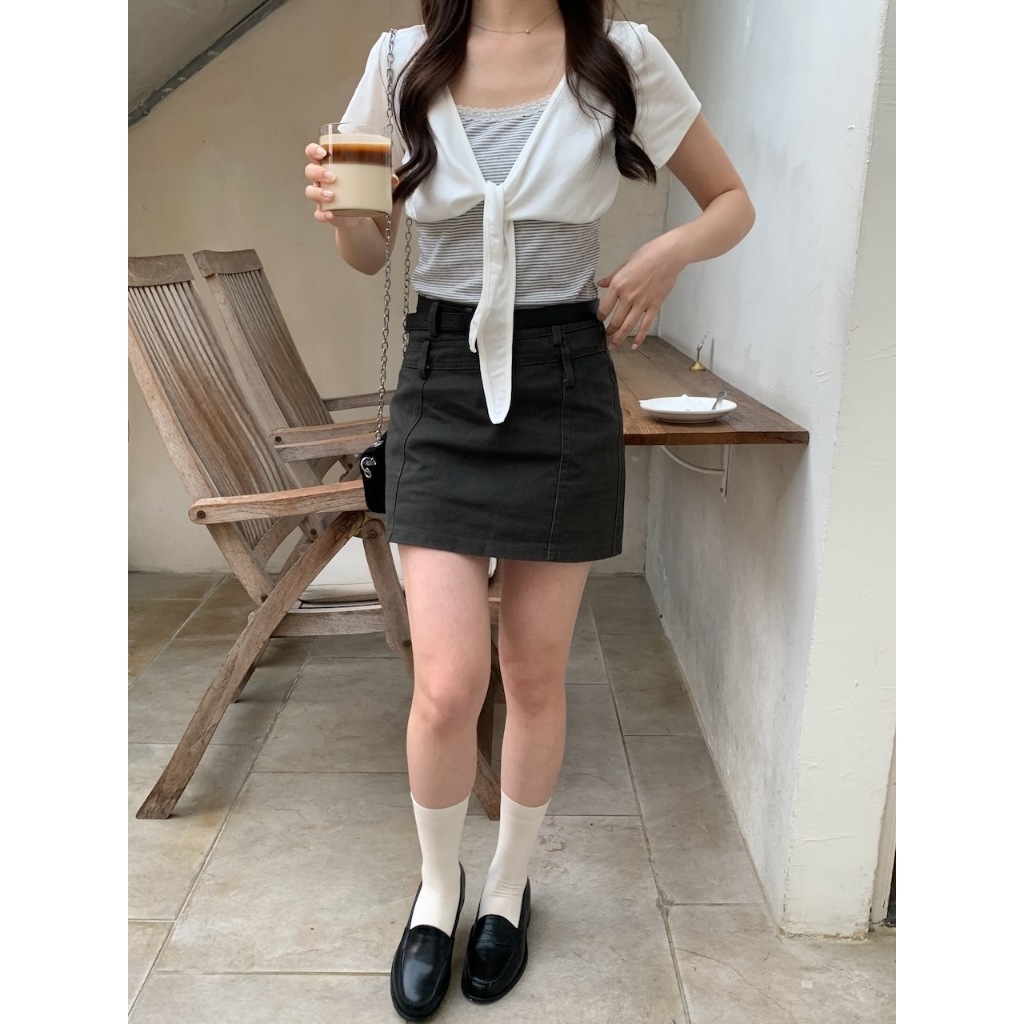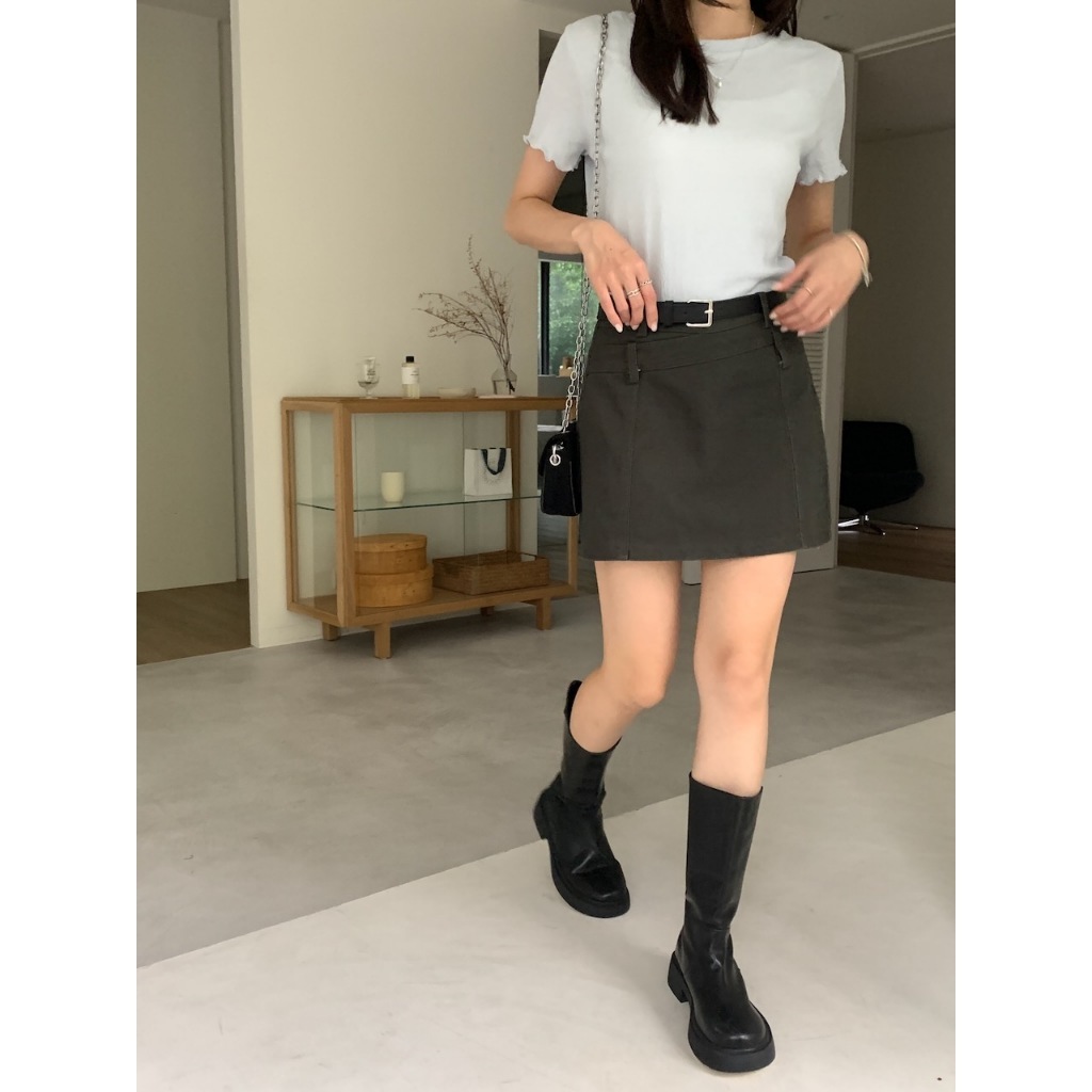 ※A字牛仔短裙 前面雙層腰帶環設計 後半截隱藏拉鍊 附皮帶 有安全褲 無彈性