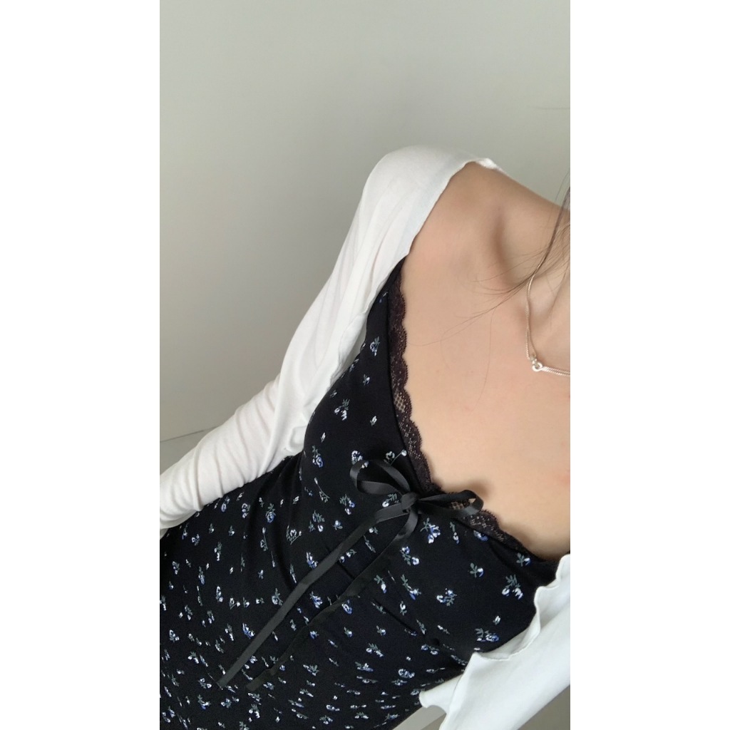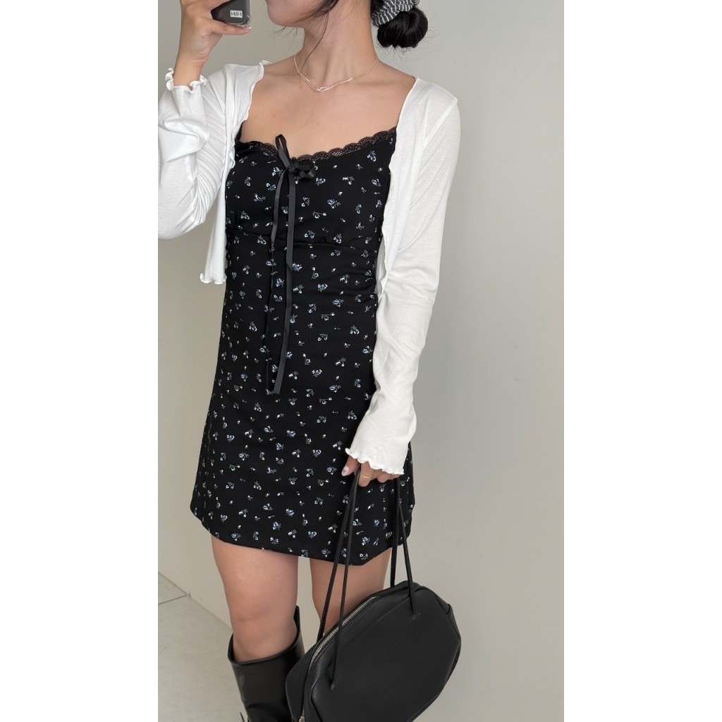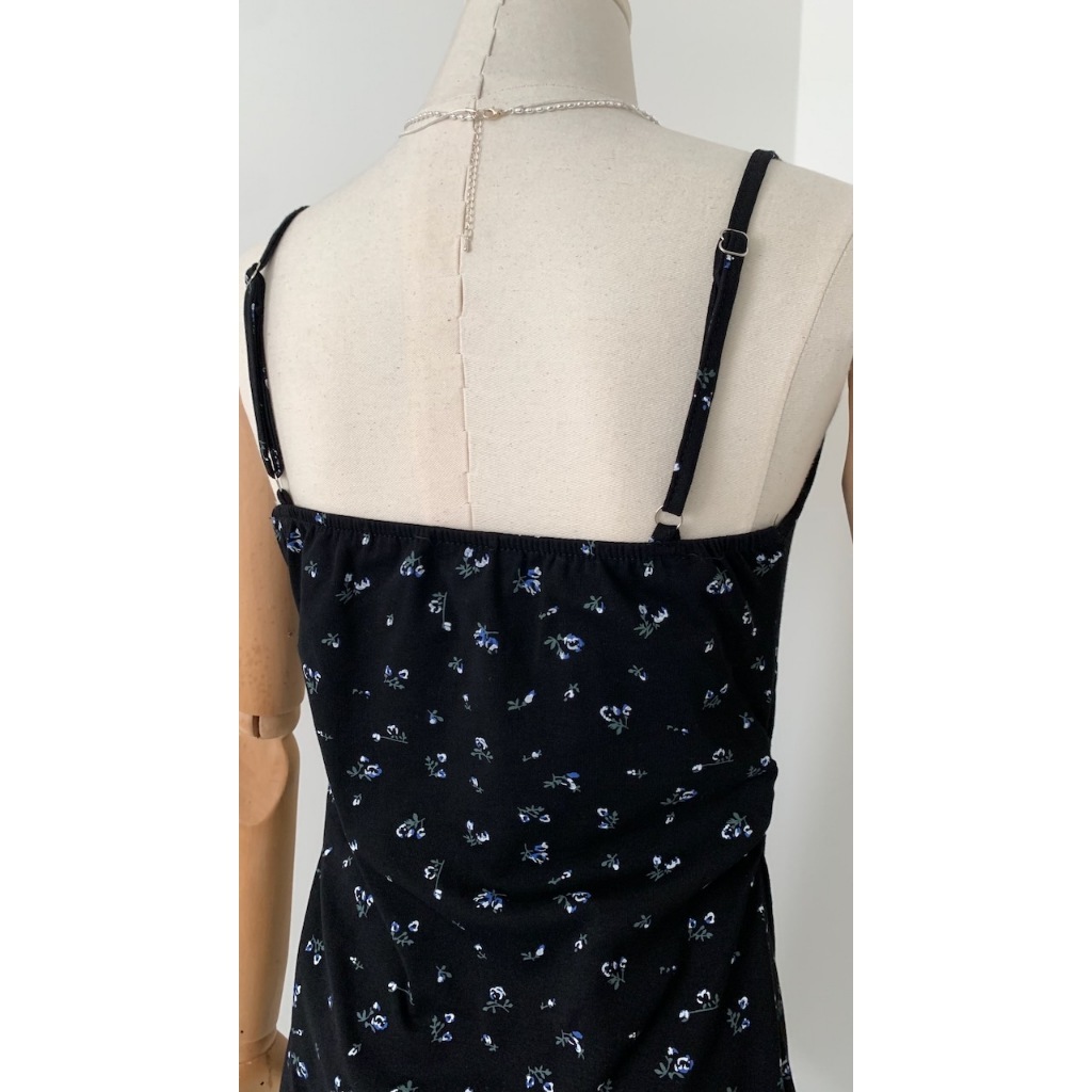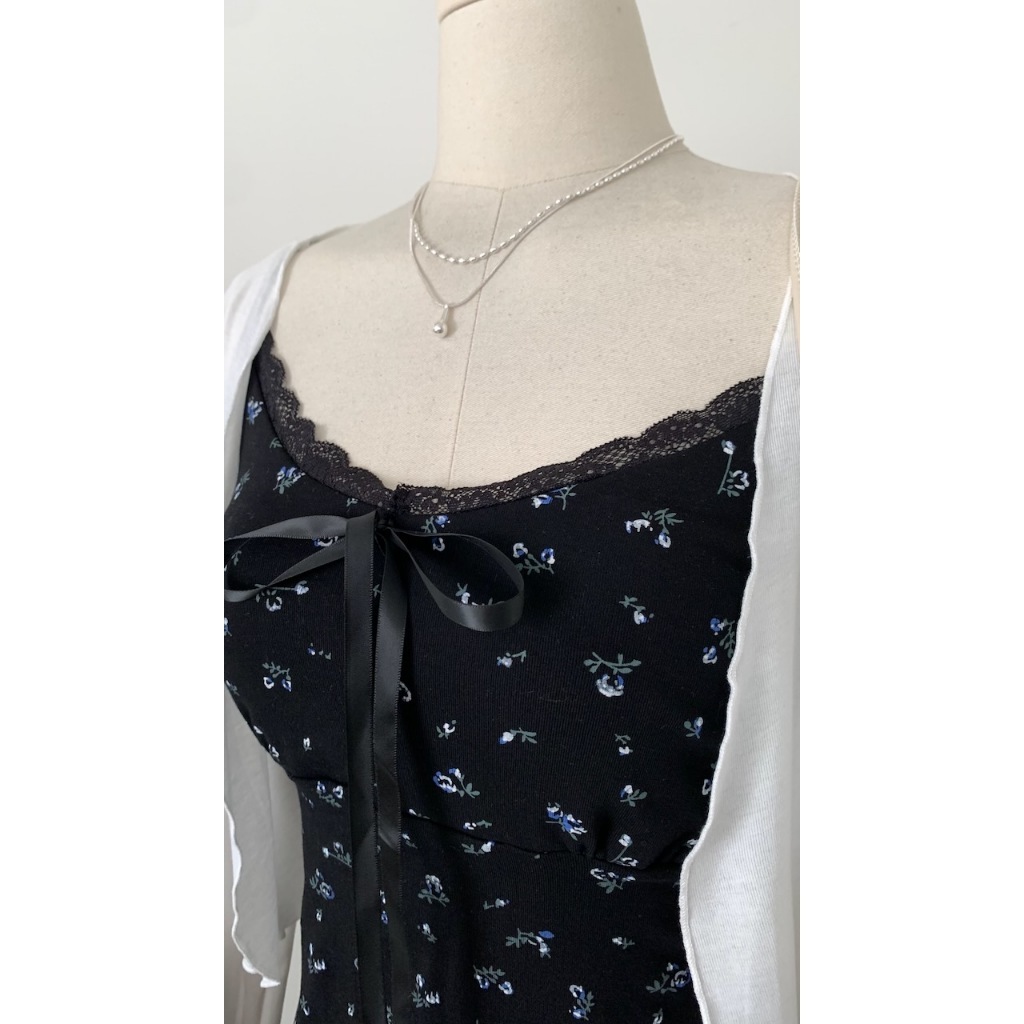 ※洋裝:微V領 可調細肩帶 領口蕾絲花邊 胸前固定式蝴蝶結 整件藍白色碎花印花 背後、腰圍縮口 A字裙襬 不可拆胸襯 微彈性