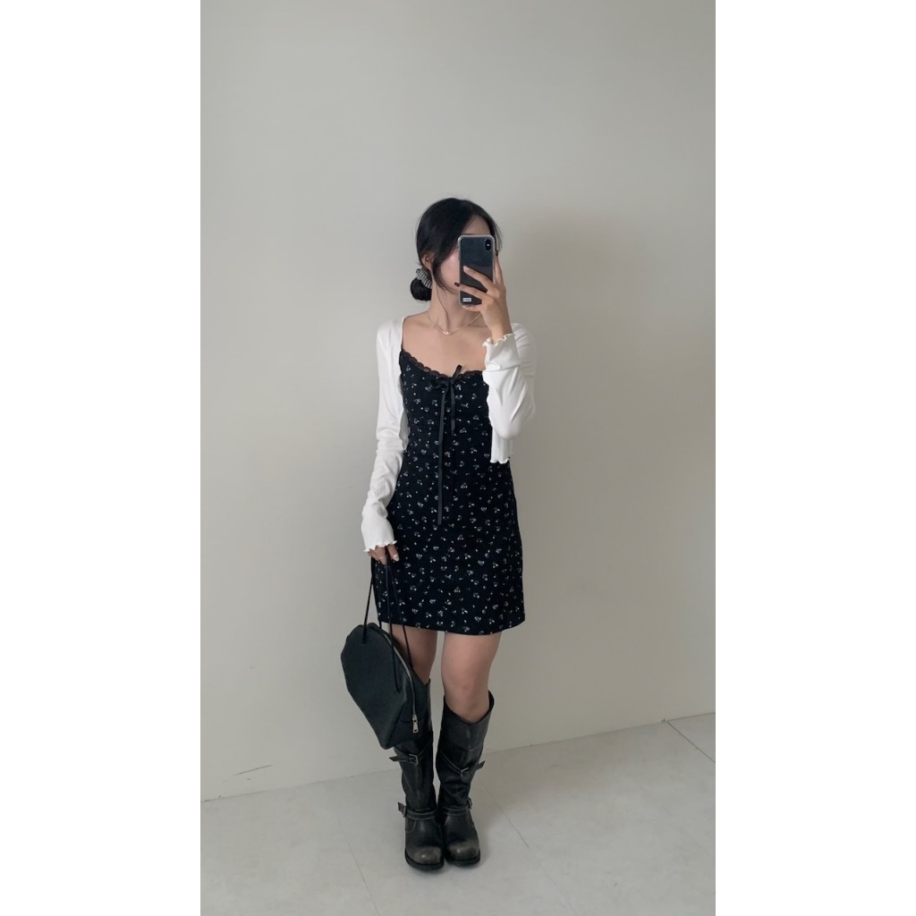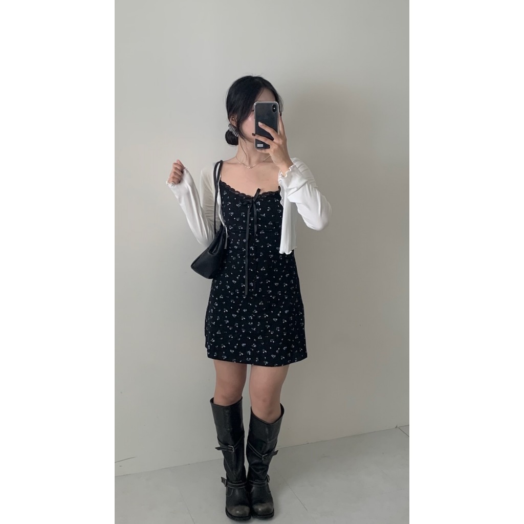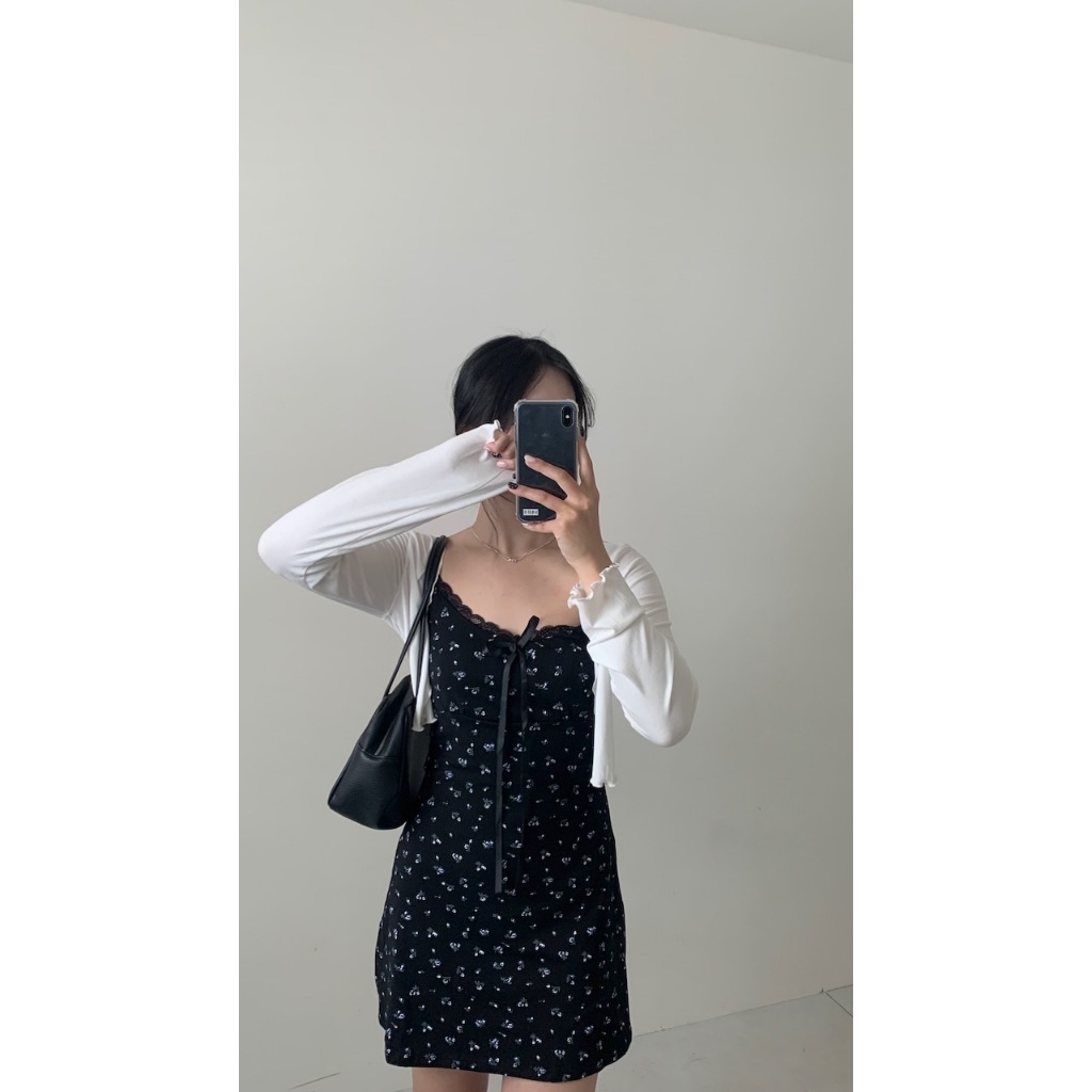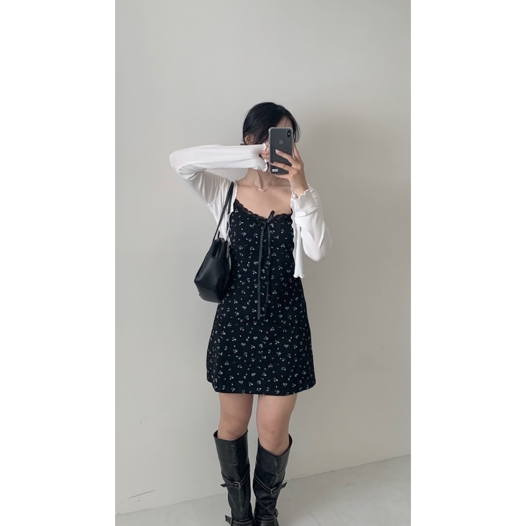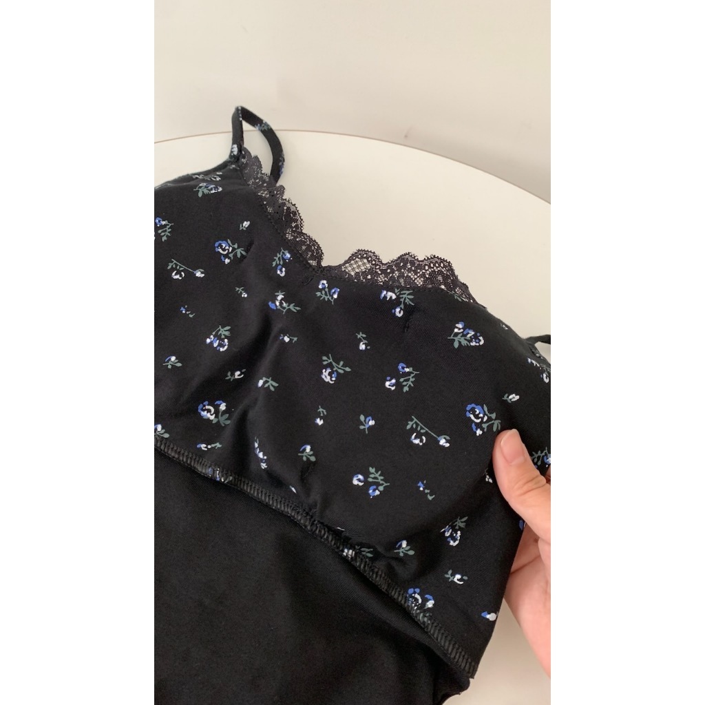 ※洋裝:微V領 可調細肩帶 領口蕾絲花邊 胸前固定式蝴蝶結 整件藍白色碎花印花 背後、腰圍縮口 A字裙襬 不可拆胸襯 微彈性