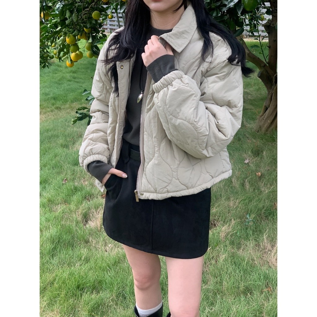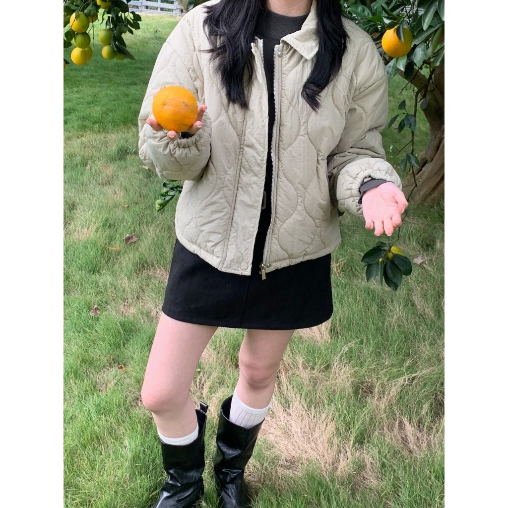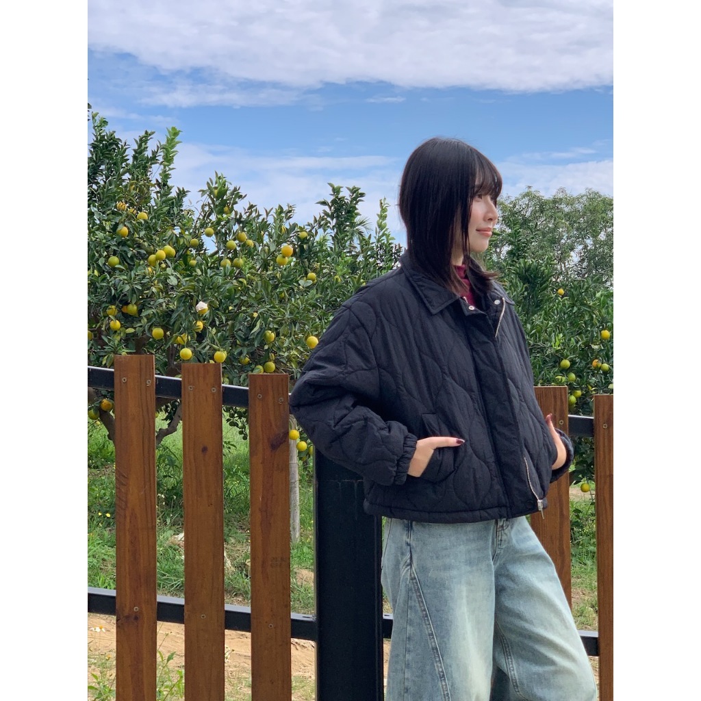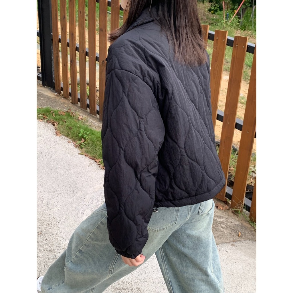 ※短版鋪棉葫蘆紋車線設計 有領 前面兩邊有真口袋 拉鍊修飾保護片 下擺可調整鬆緊抽繩 手袖縮口