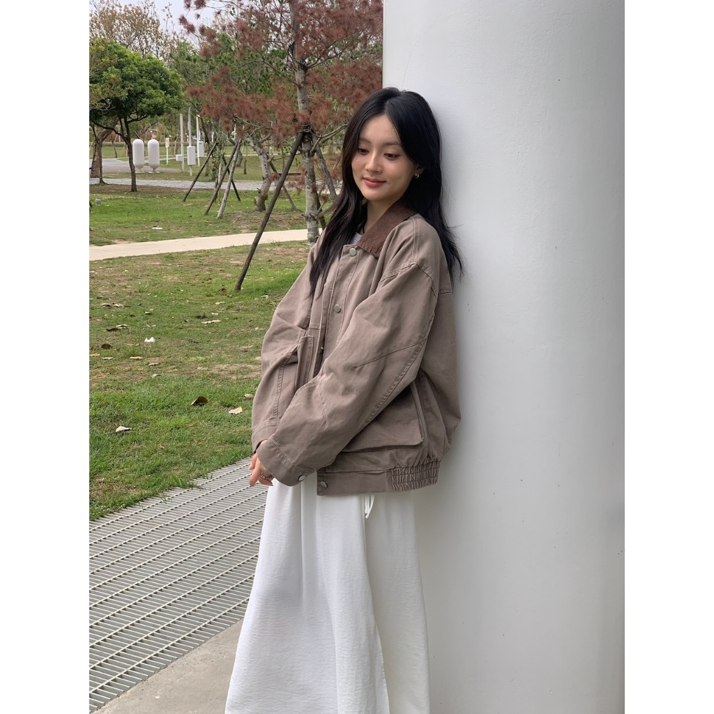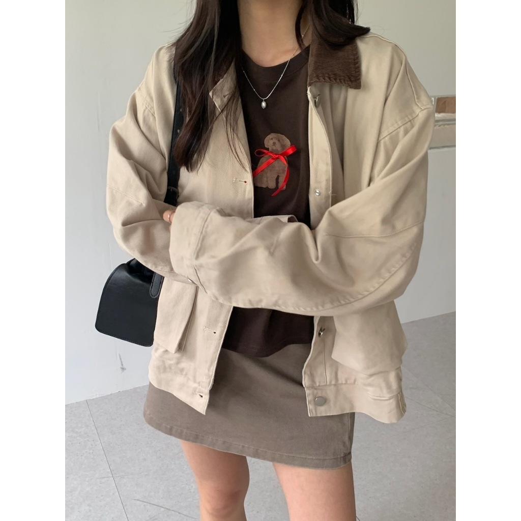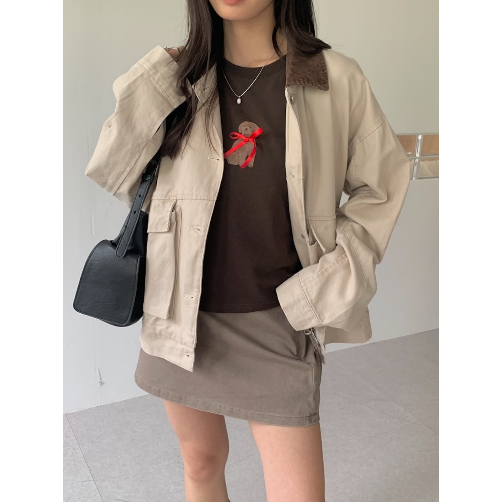 ※翻領拚色夾克 領口燈心絨 整排可開釦 前面左右兩邊翻蓋真口袋 後面、左右兩側下擺縮口