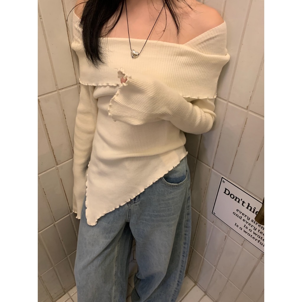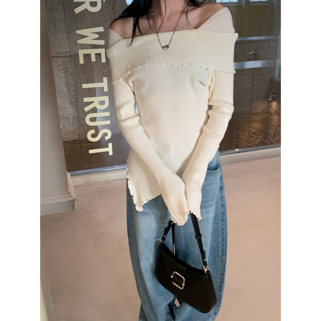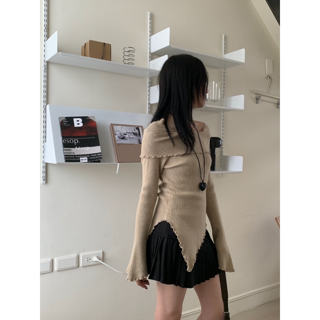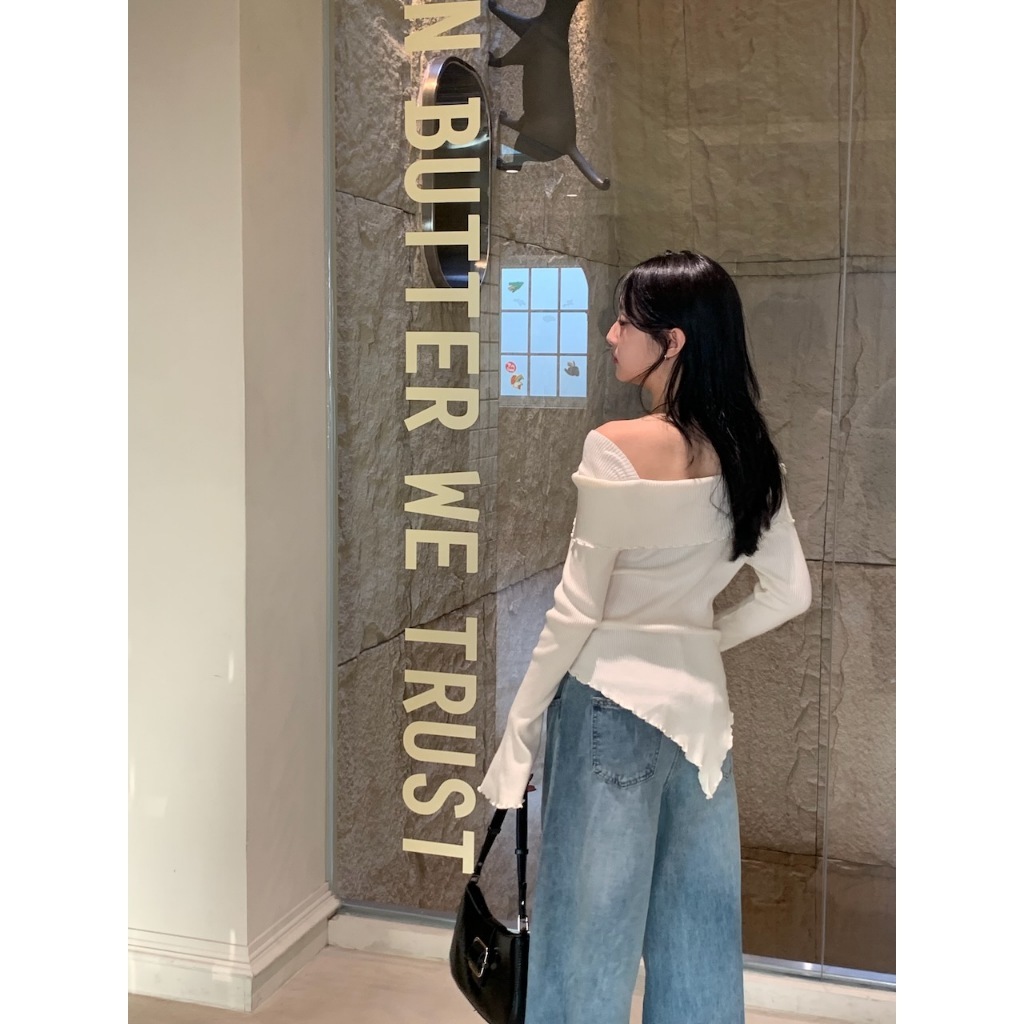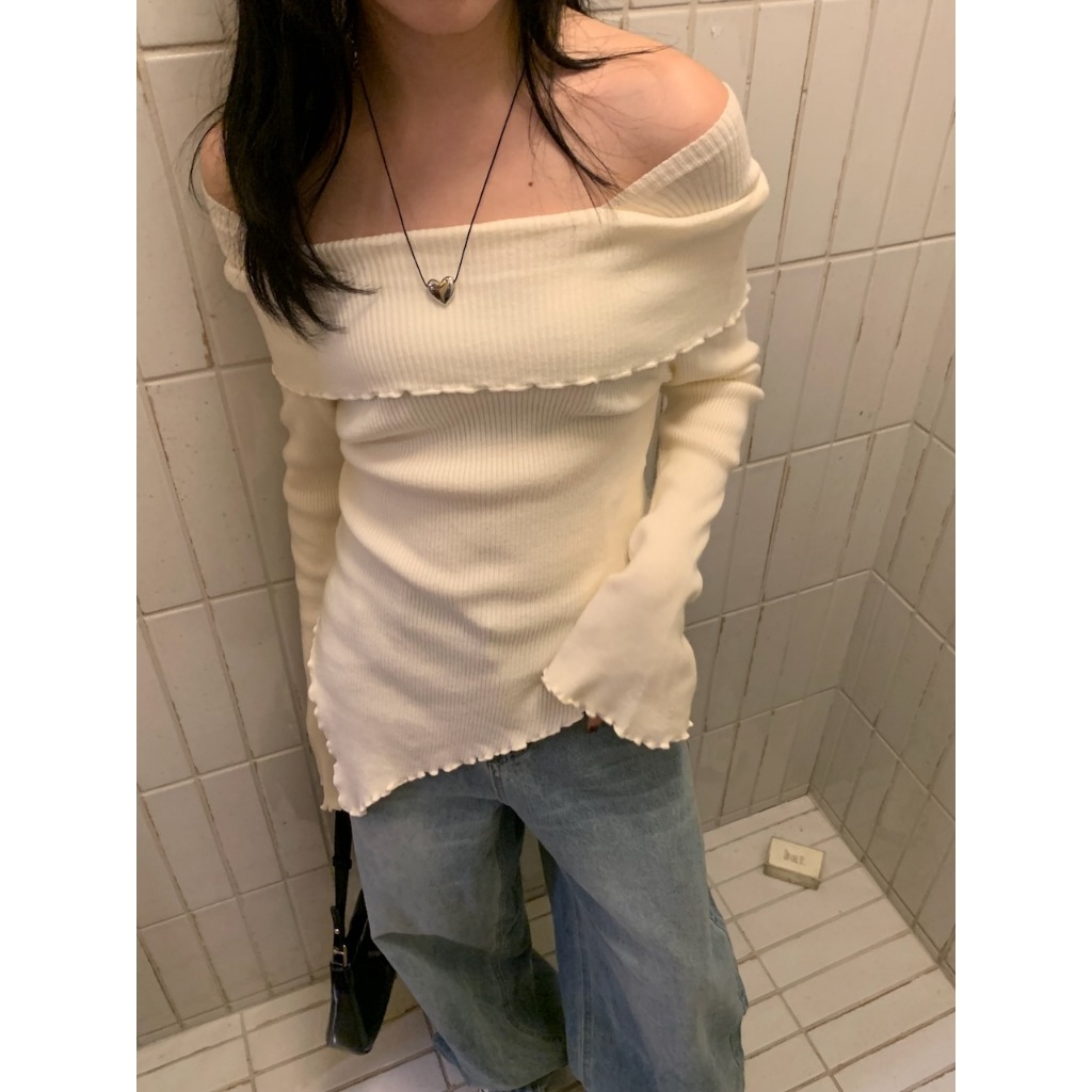※一字領 領口、手袖、下擺木耳邊 喇叭袖 下擺不規則 素色