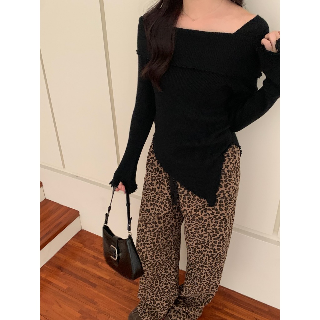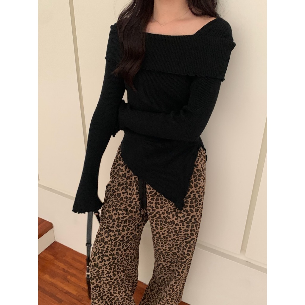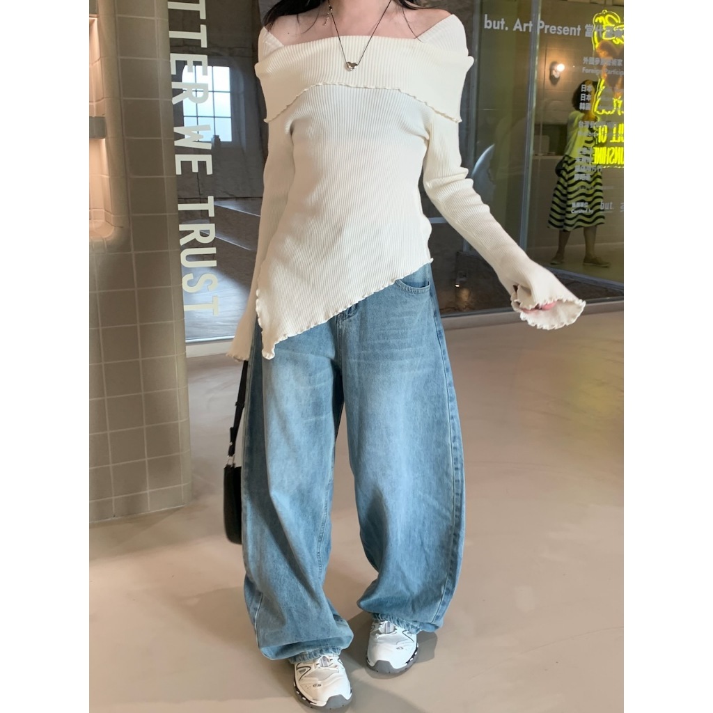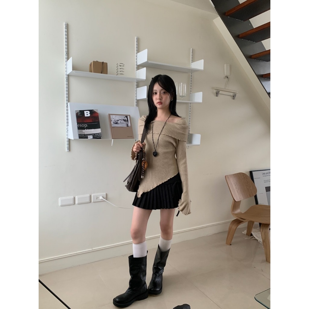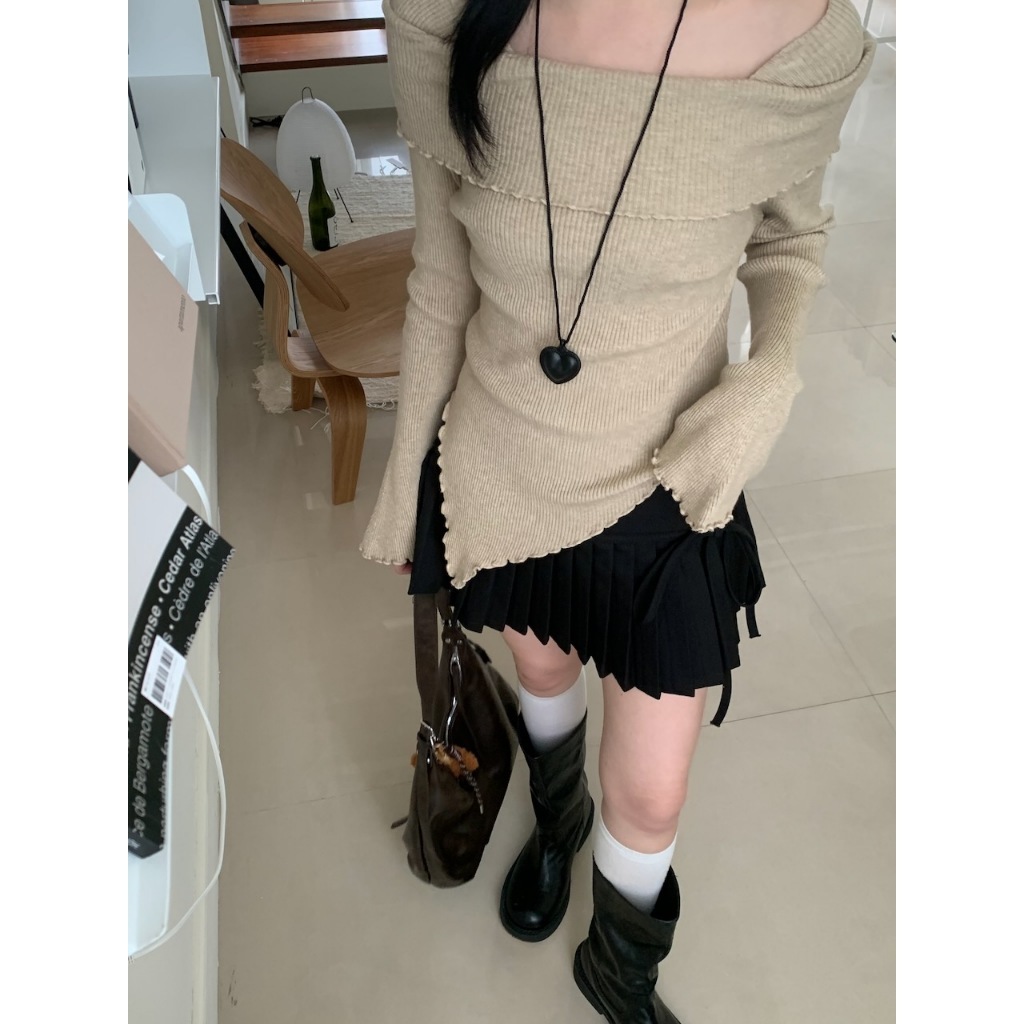 ※一字領 領口、手袖、下擺木耳邊 喇叭袖 下擺不規則 素色