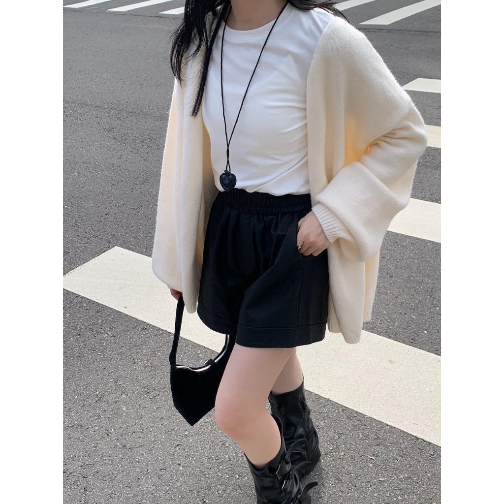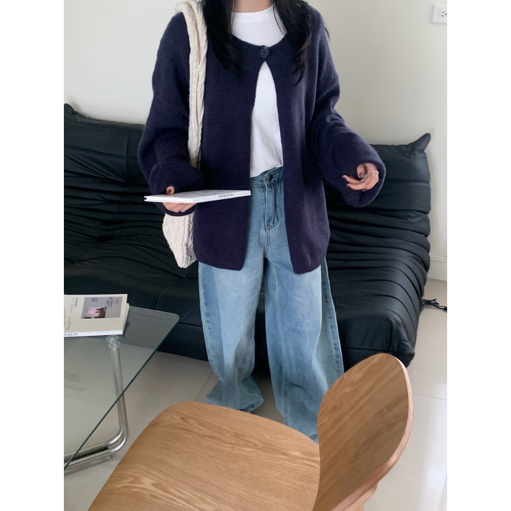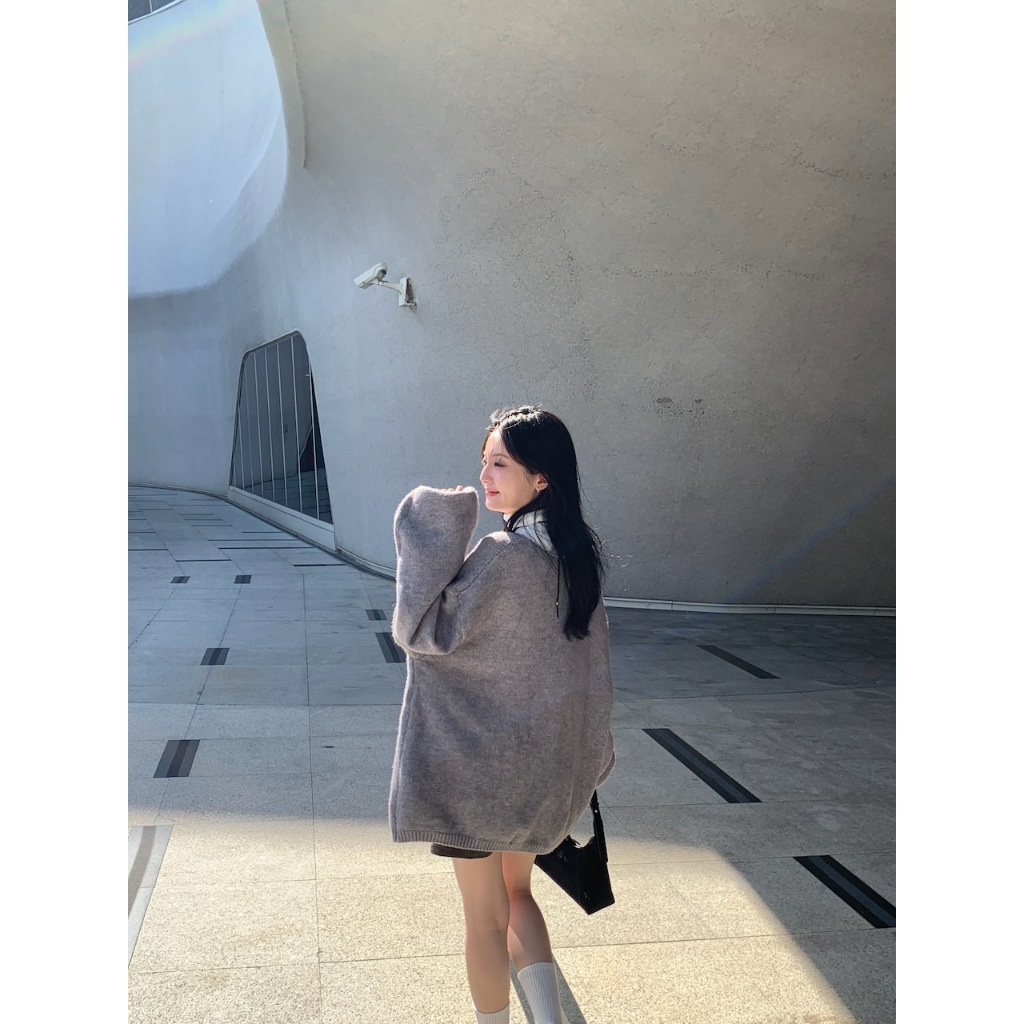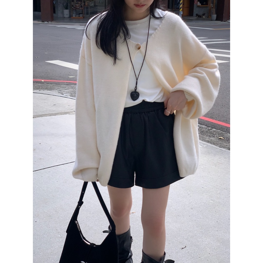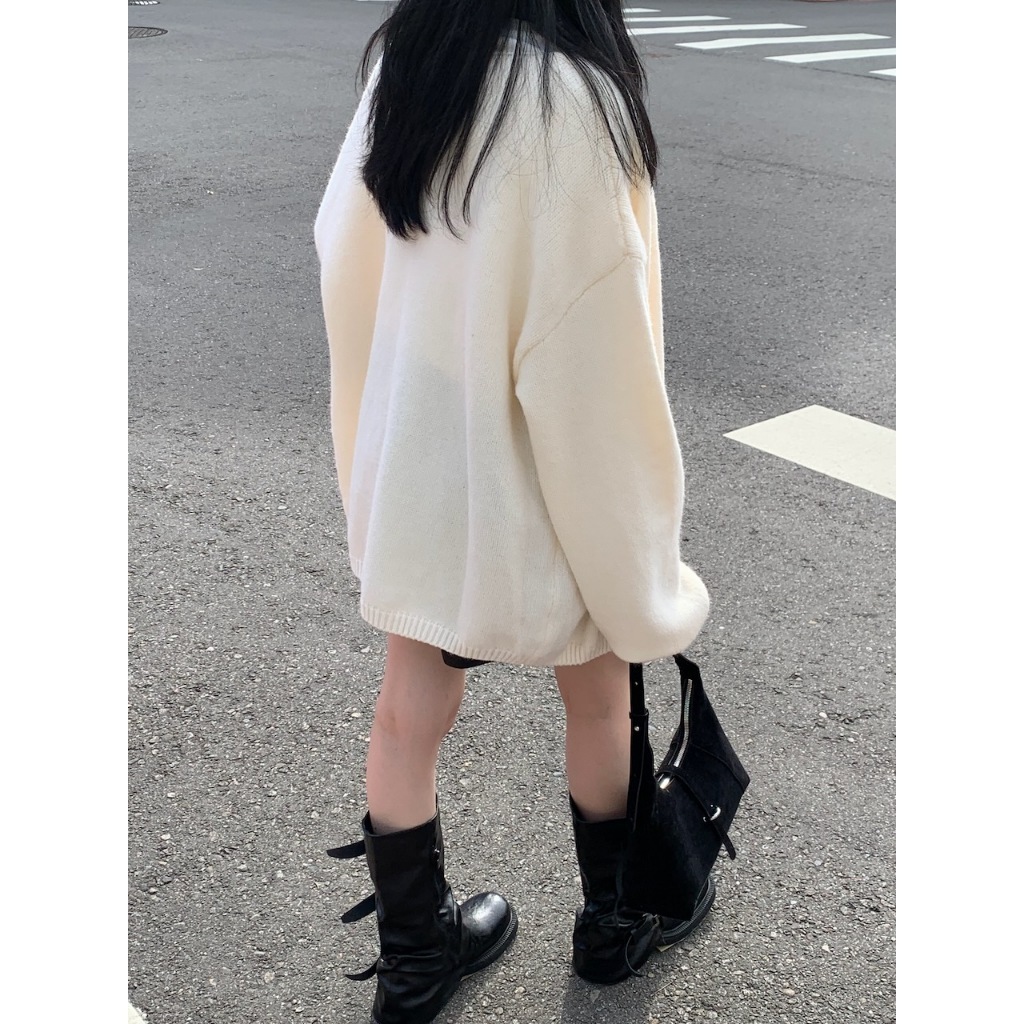 ※ 寬圓領毛衣針織長版寬袖袖口、下擺縮口胸前珍珠大真紐帶
