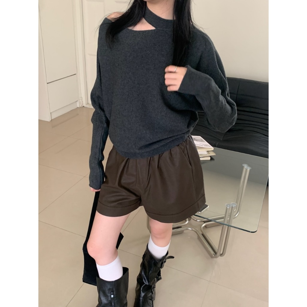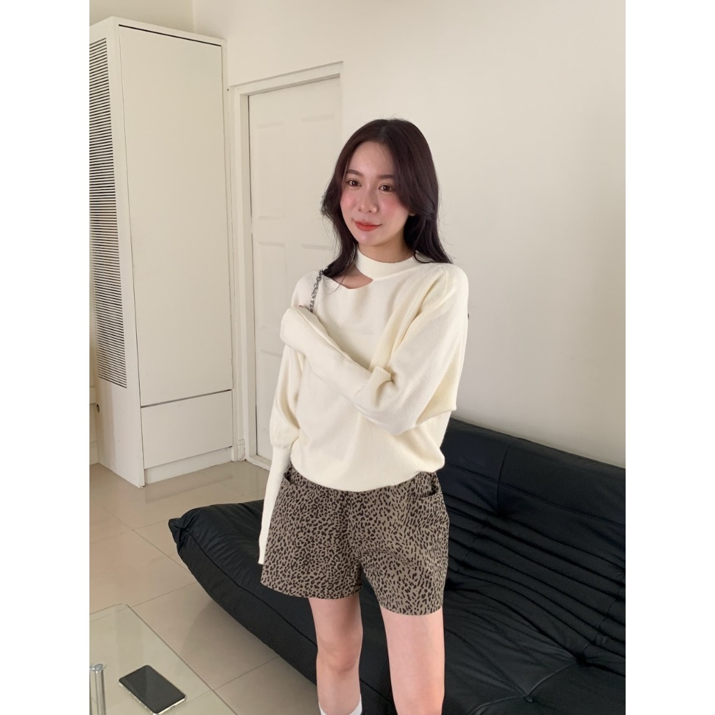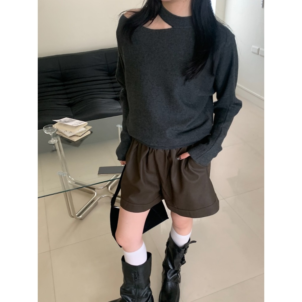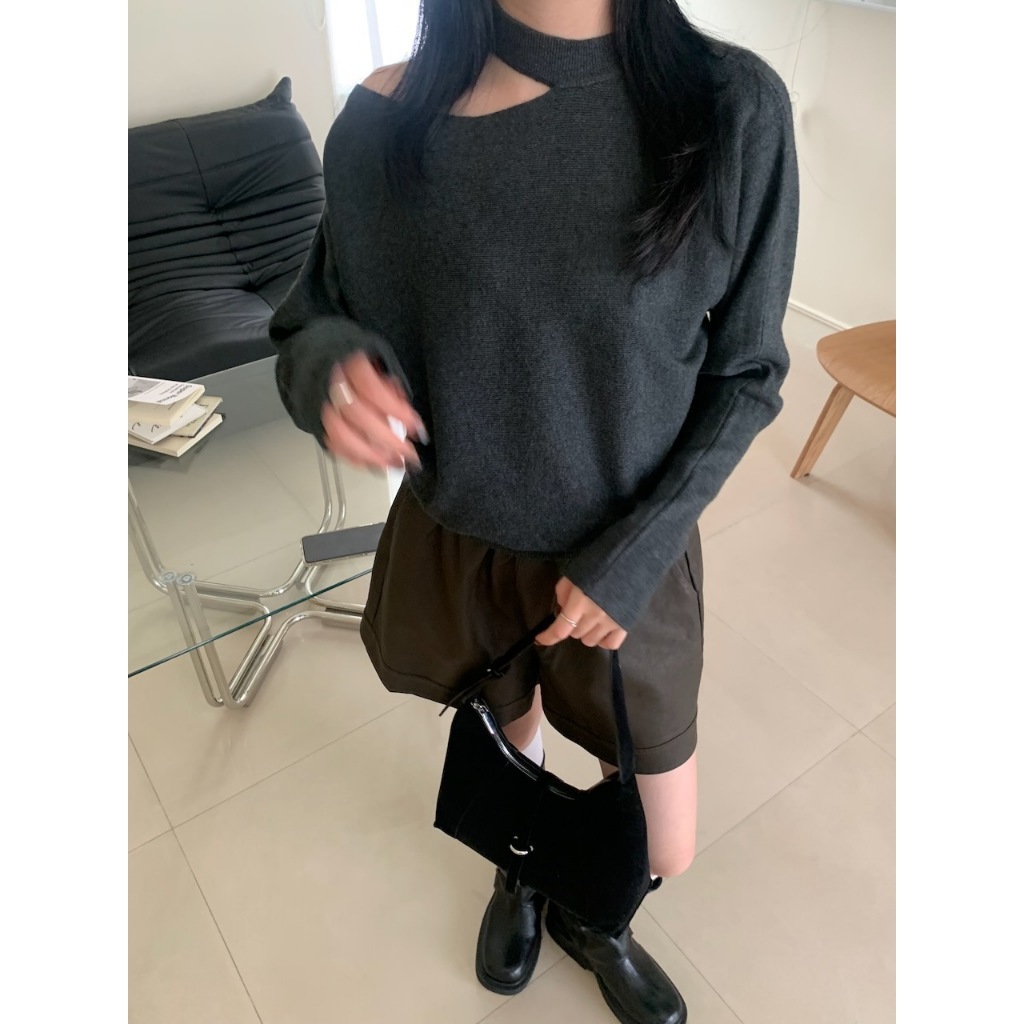 ※斜肩 左肩假背心露肩感 袖子半縮口 下擺縮口設計 素色