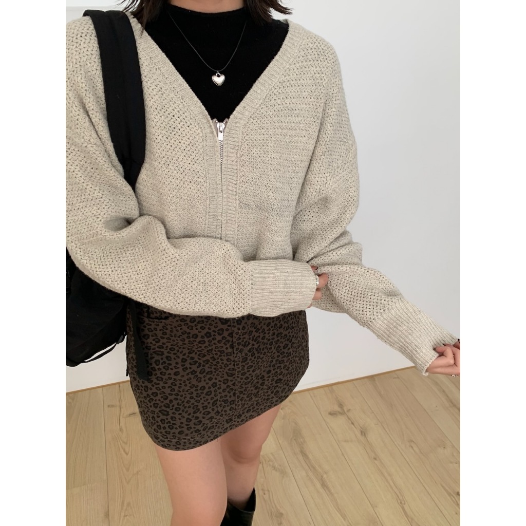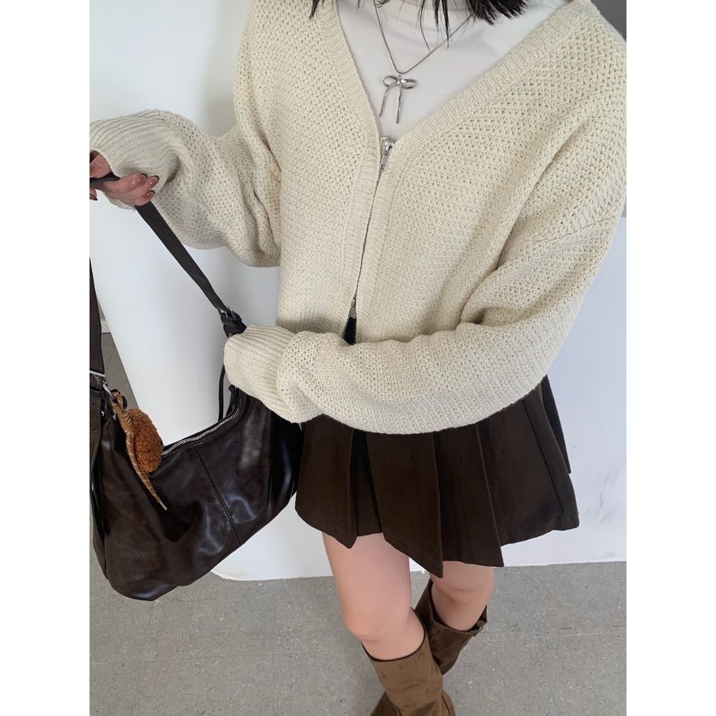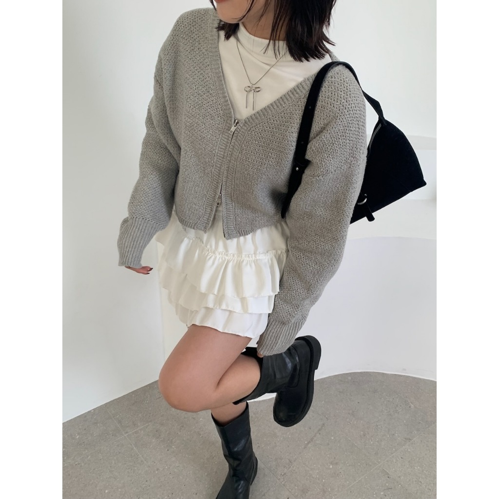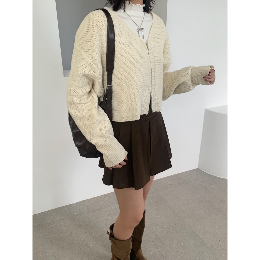 ※V領雙頭拉鍊粗針織外罩 袖口縮口 短版 素色