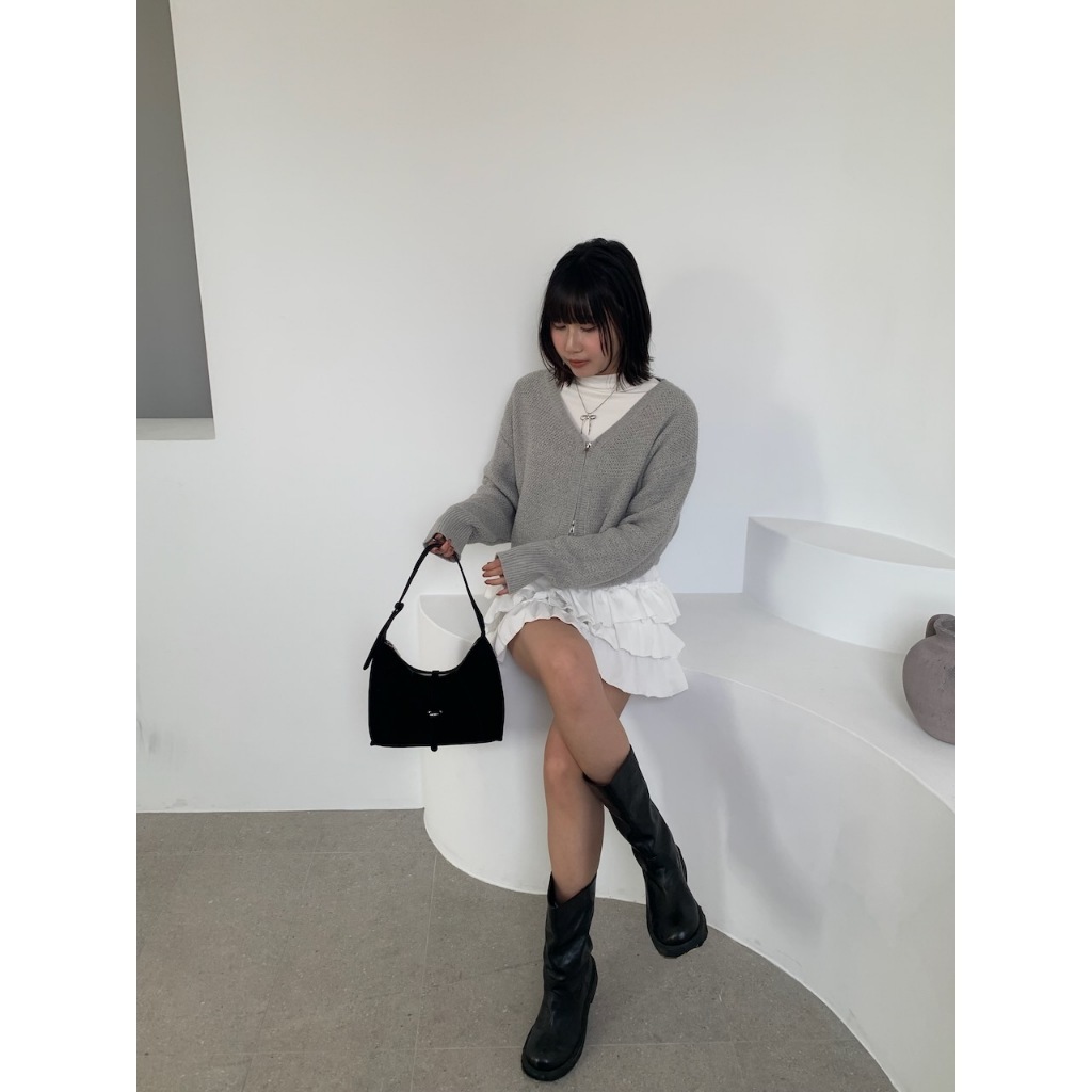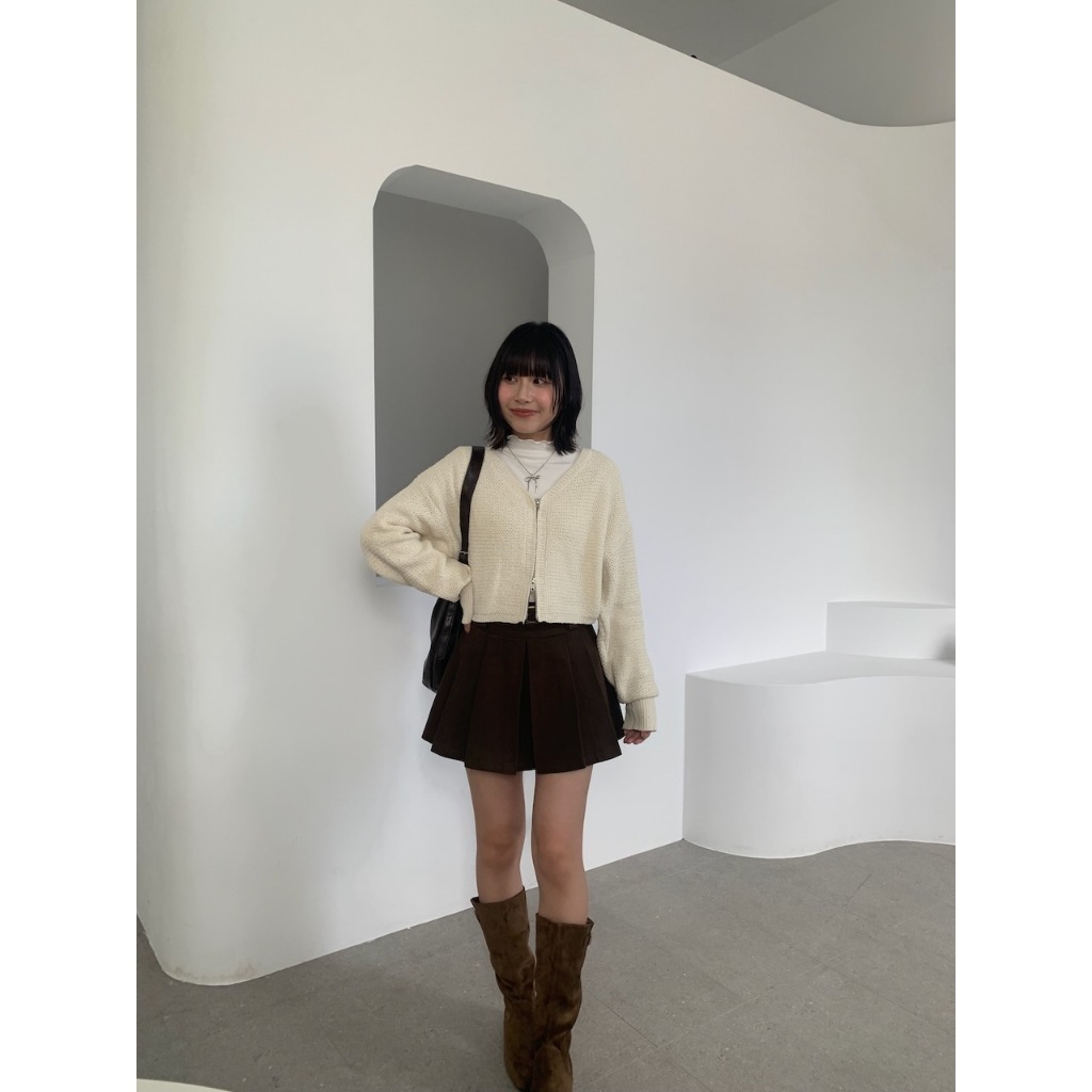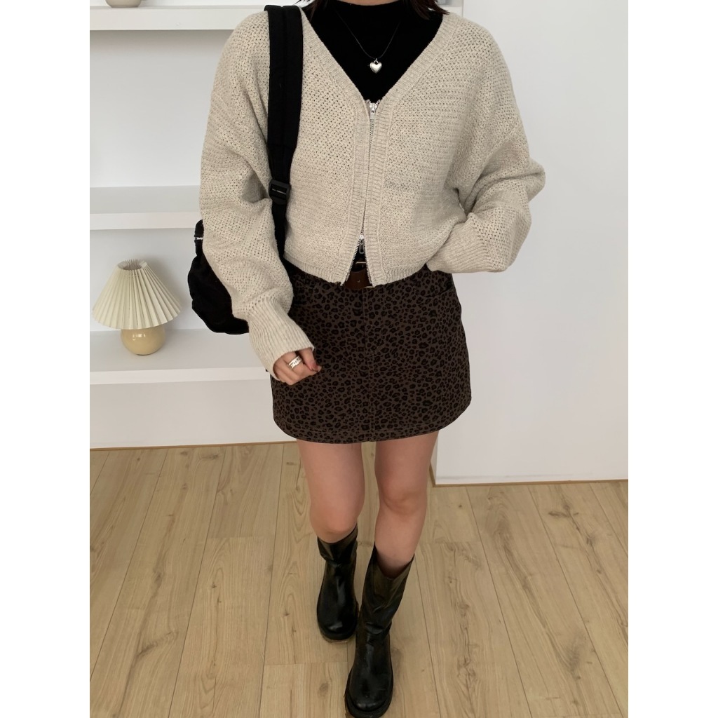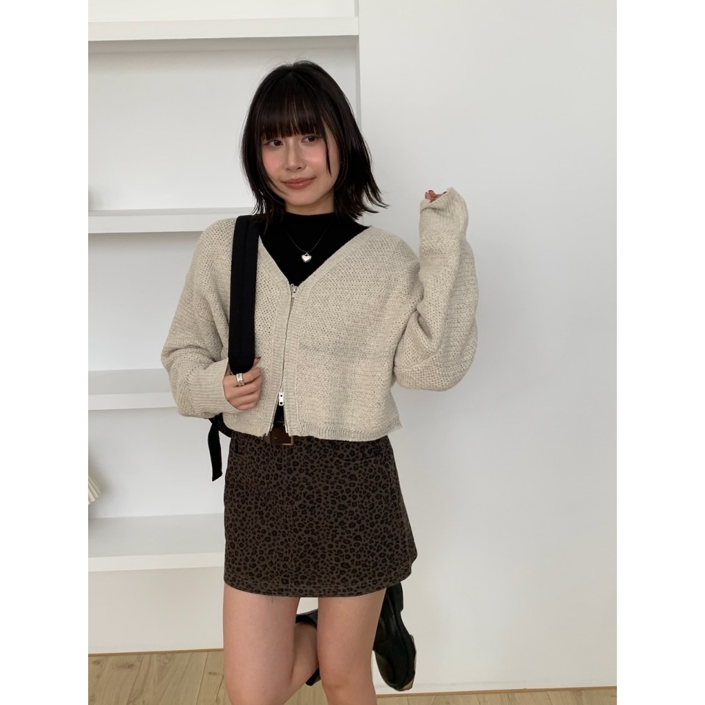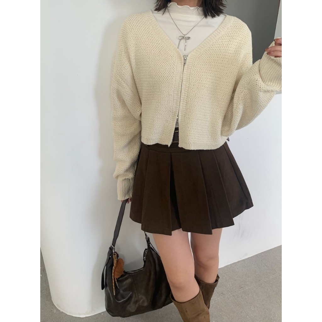 ※V領雙頭拉鍊粗針織外罩 袖口縮口 短版 素色