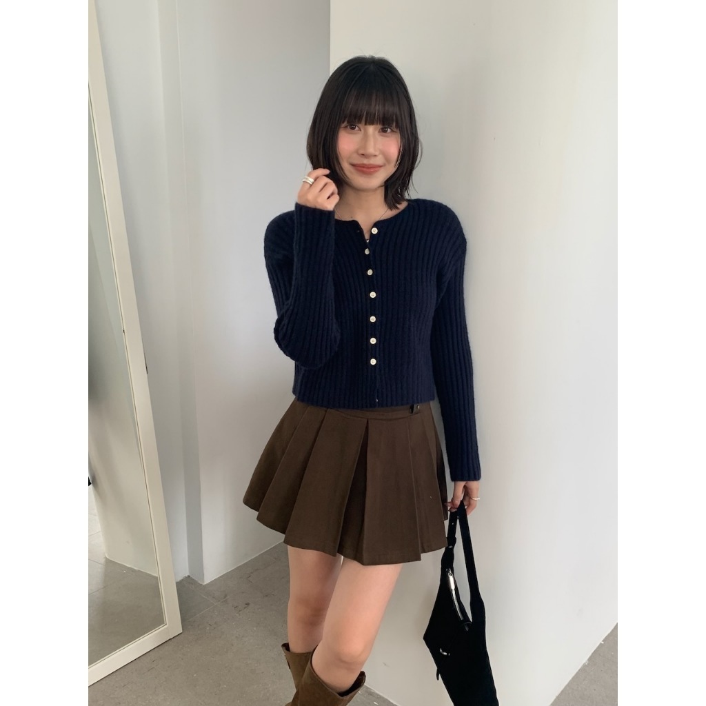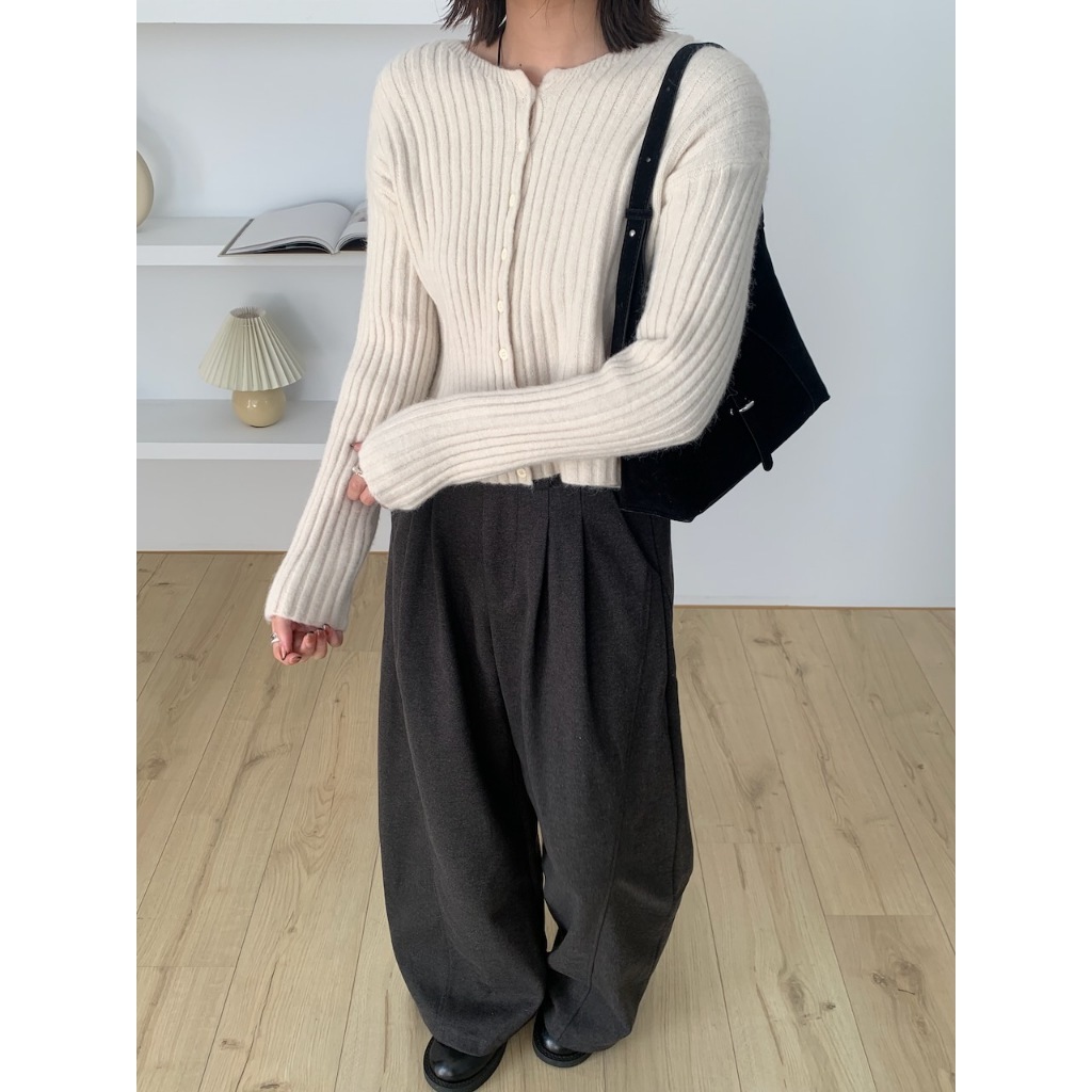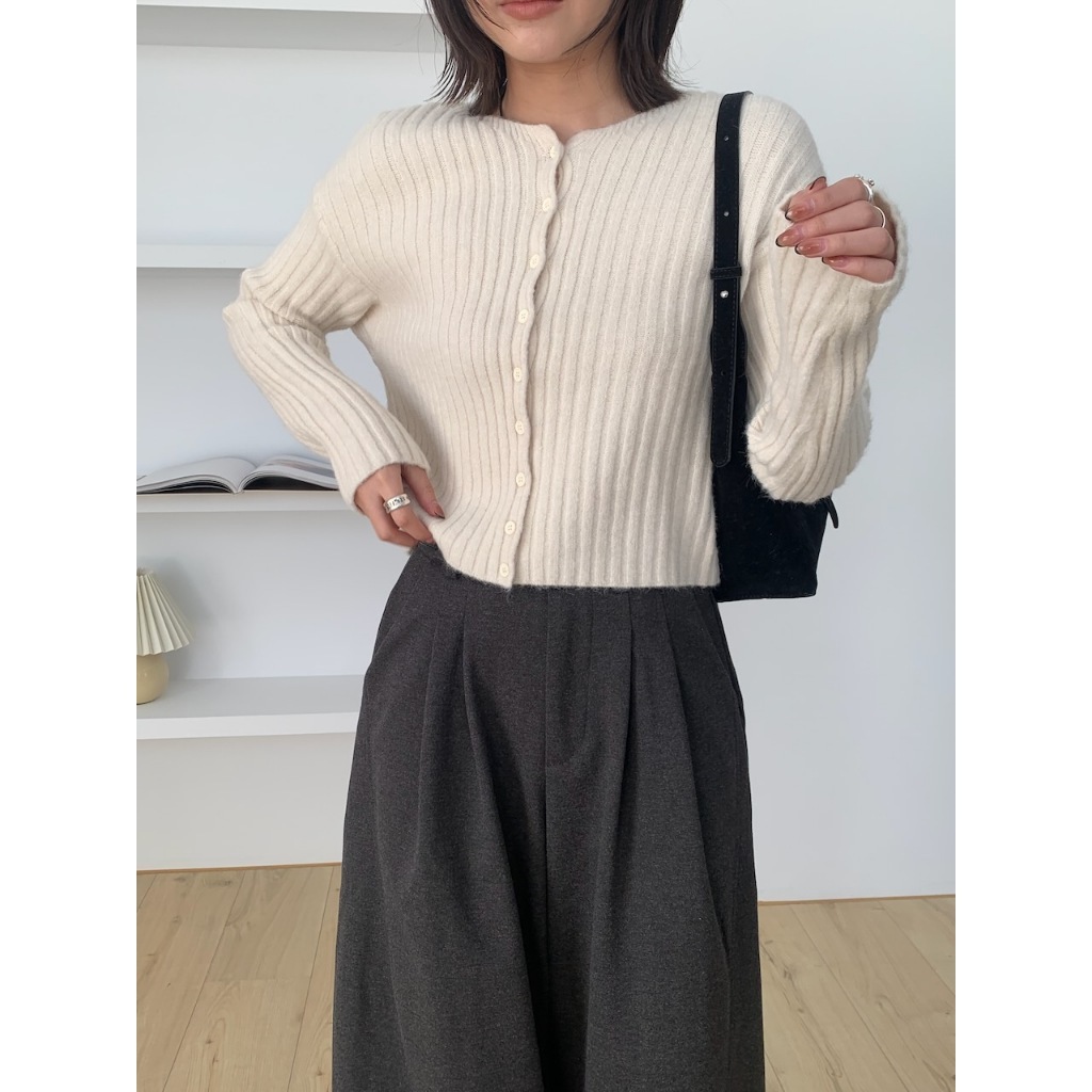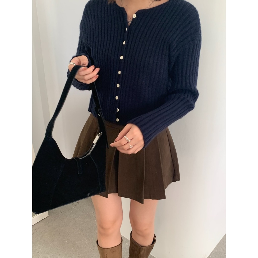 ※圓領 真排扣 小鈕扣 短版 直紋路針織 素色