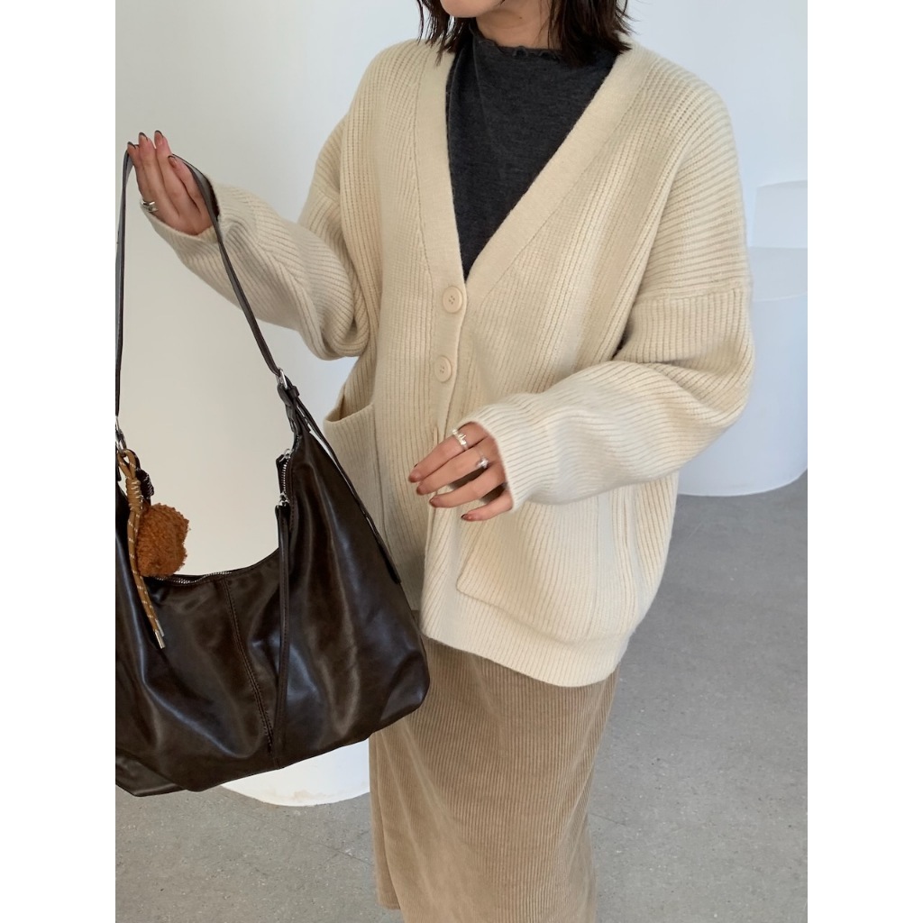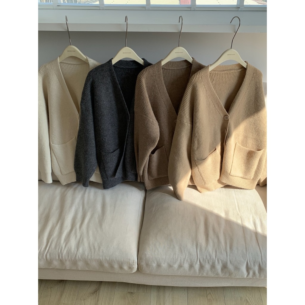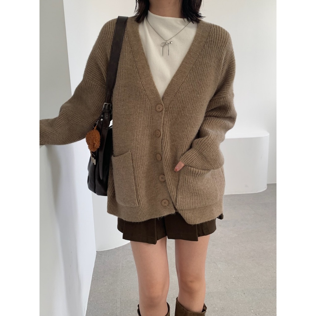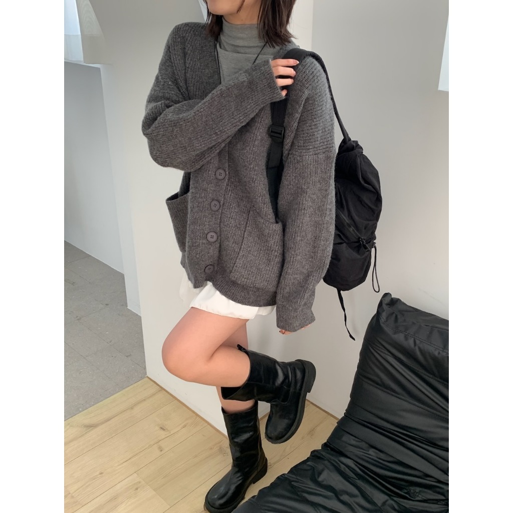 ※V領 針織 落肩 真排扣 大鈕扣 前面左右兩邊真開放式口袋 素色