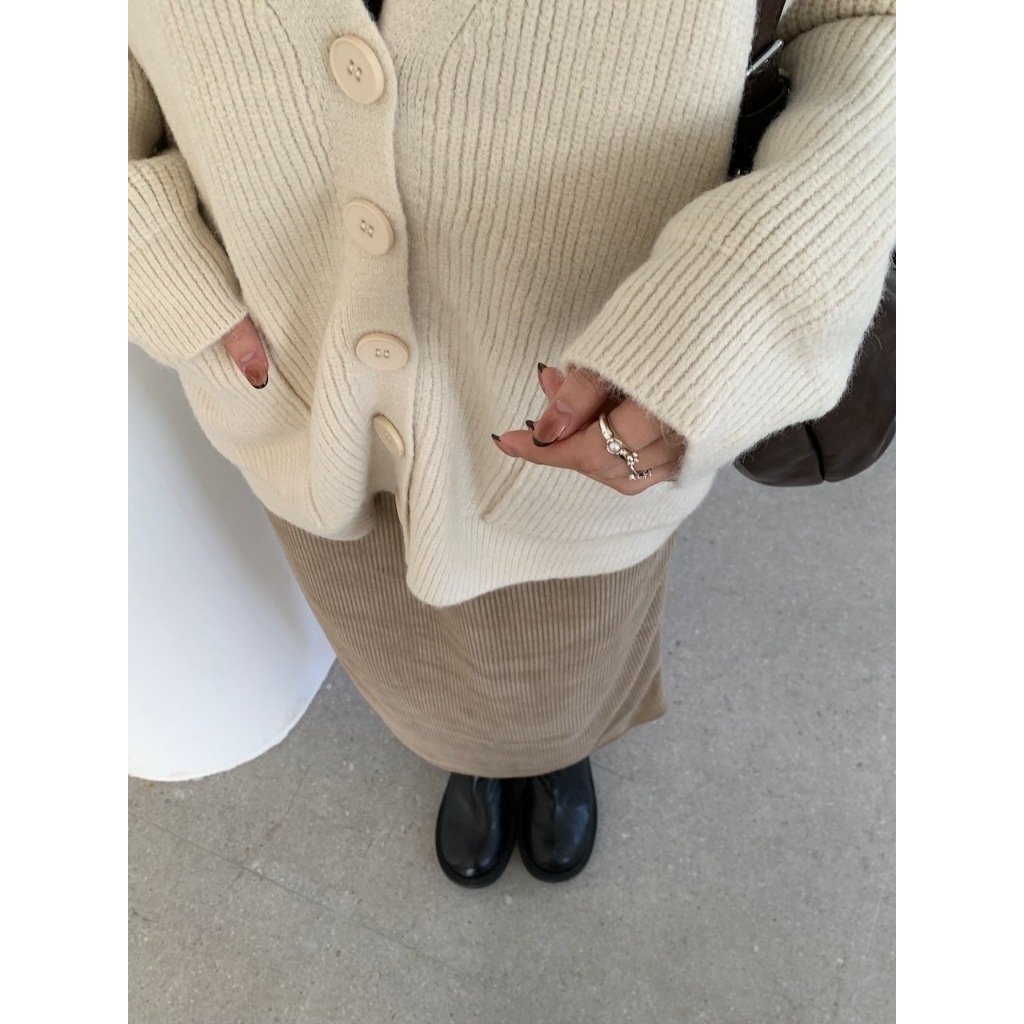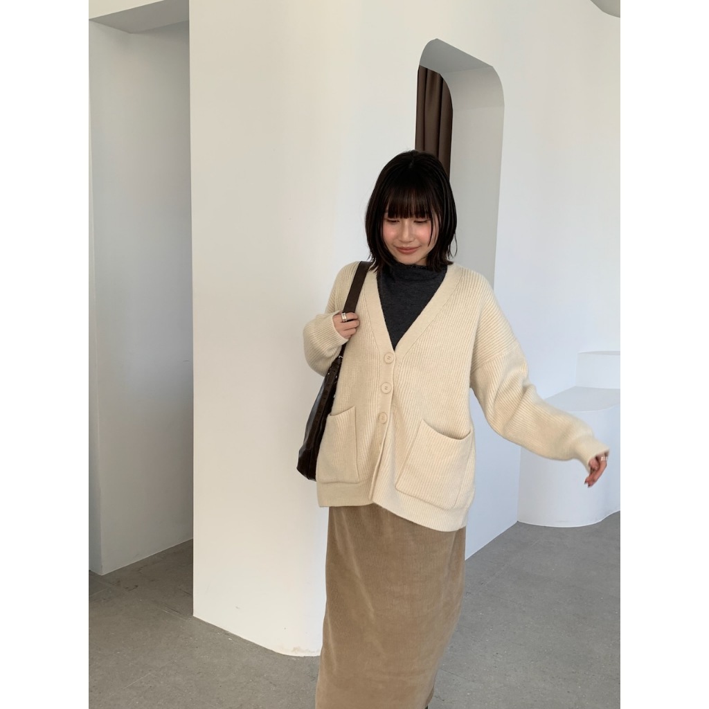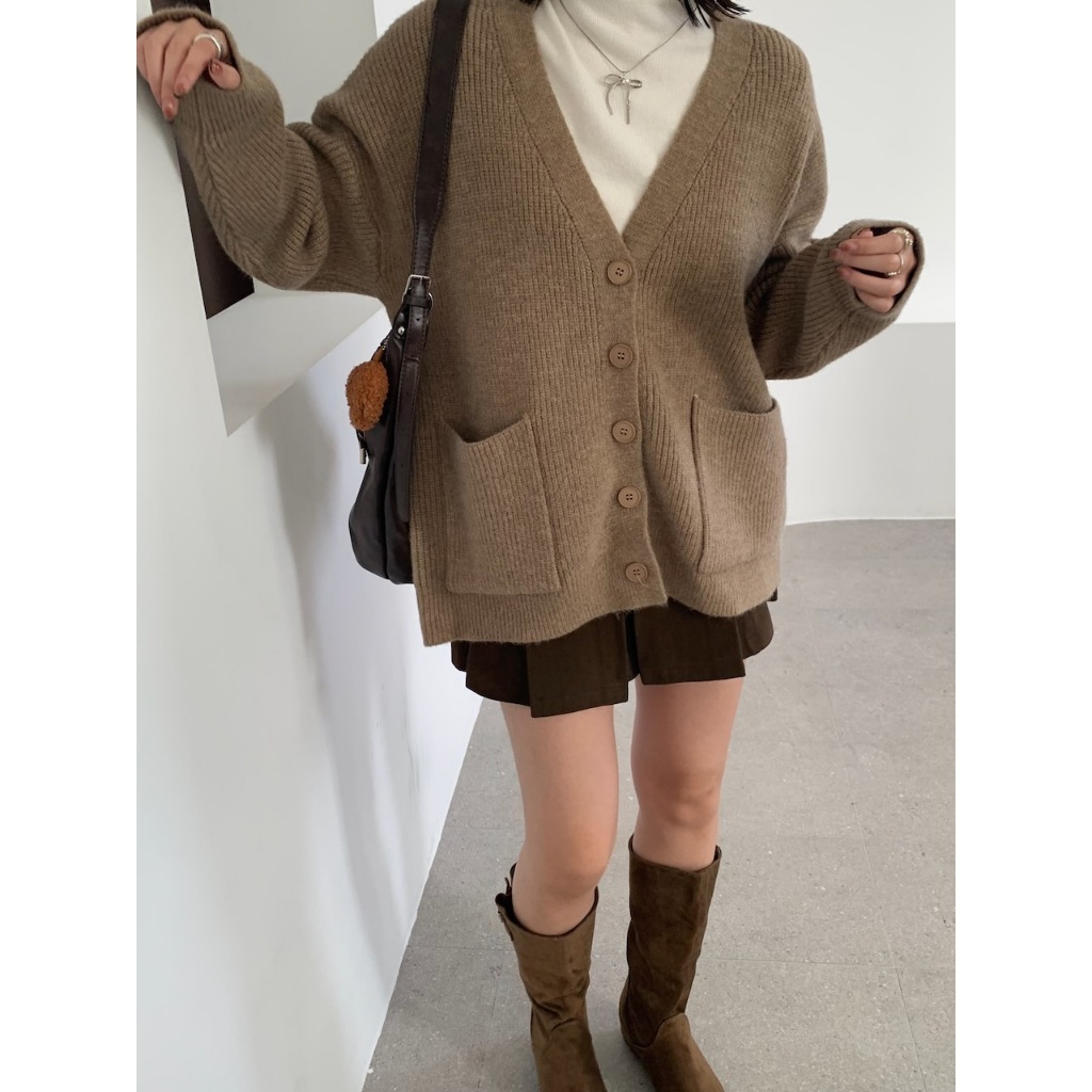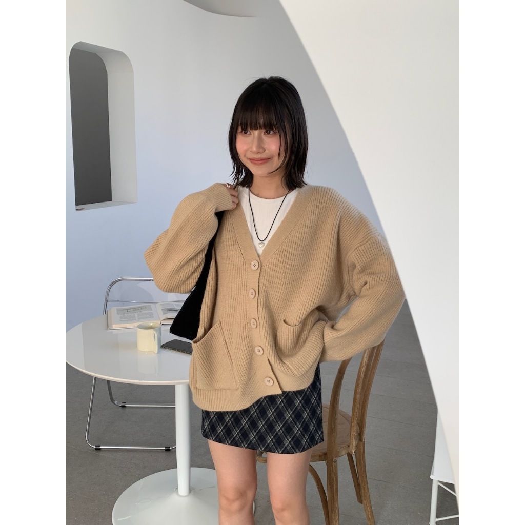 ※V領 針織 落肩 真排扣 大鈕扣 前面左右兩邊真開放式口袋 素色
