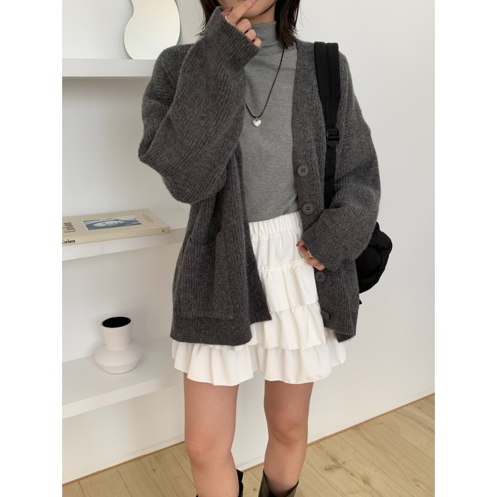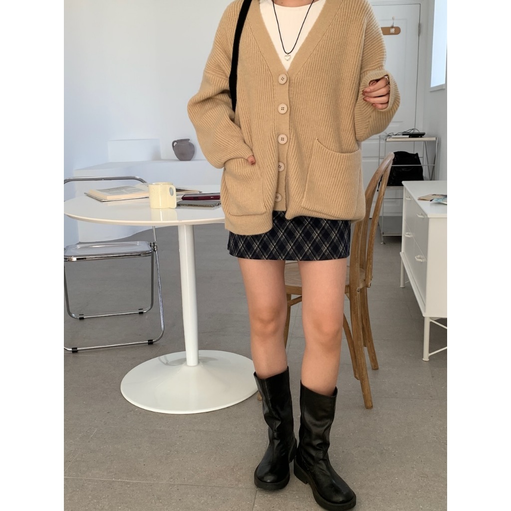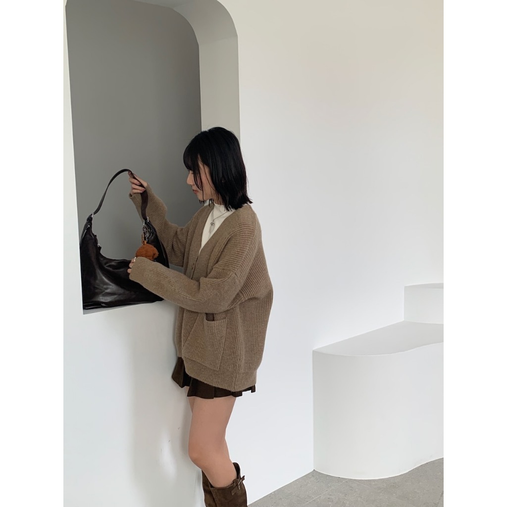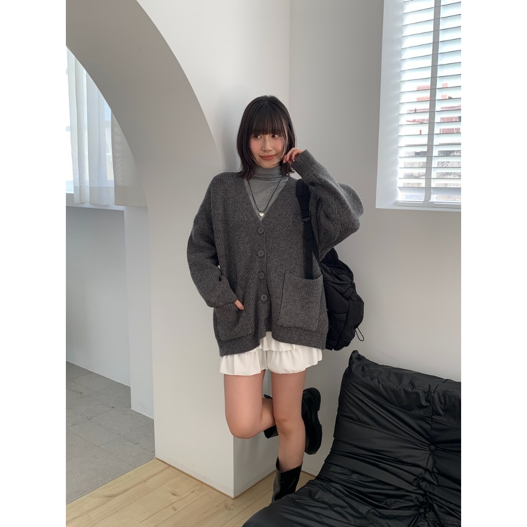 ※V領 針織 落肩 真排扣 大鈕扣 前面左右兩邊真開放式口袋 素色
