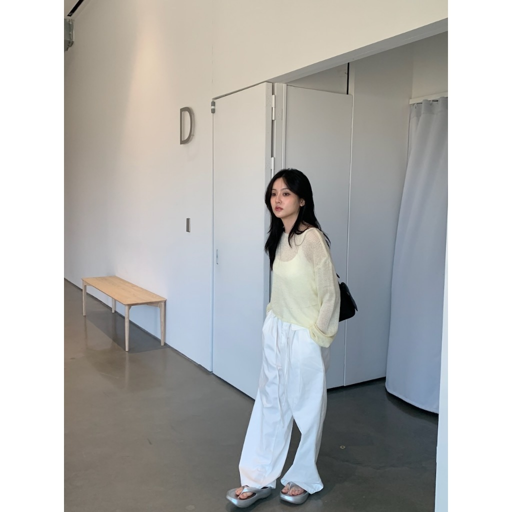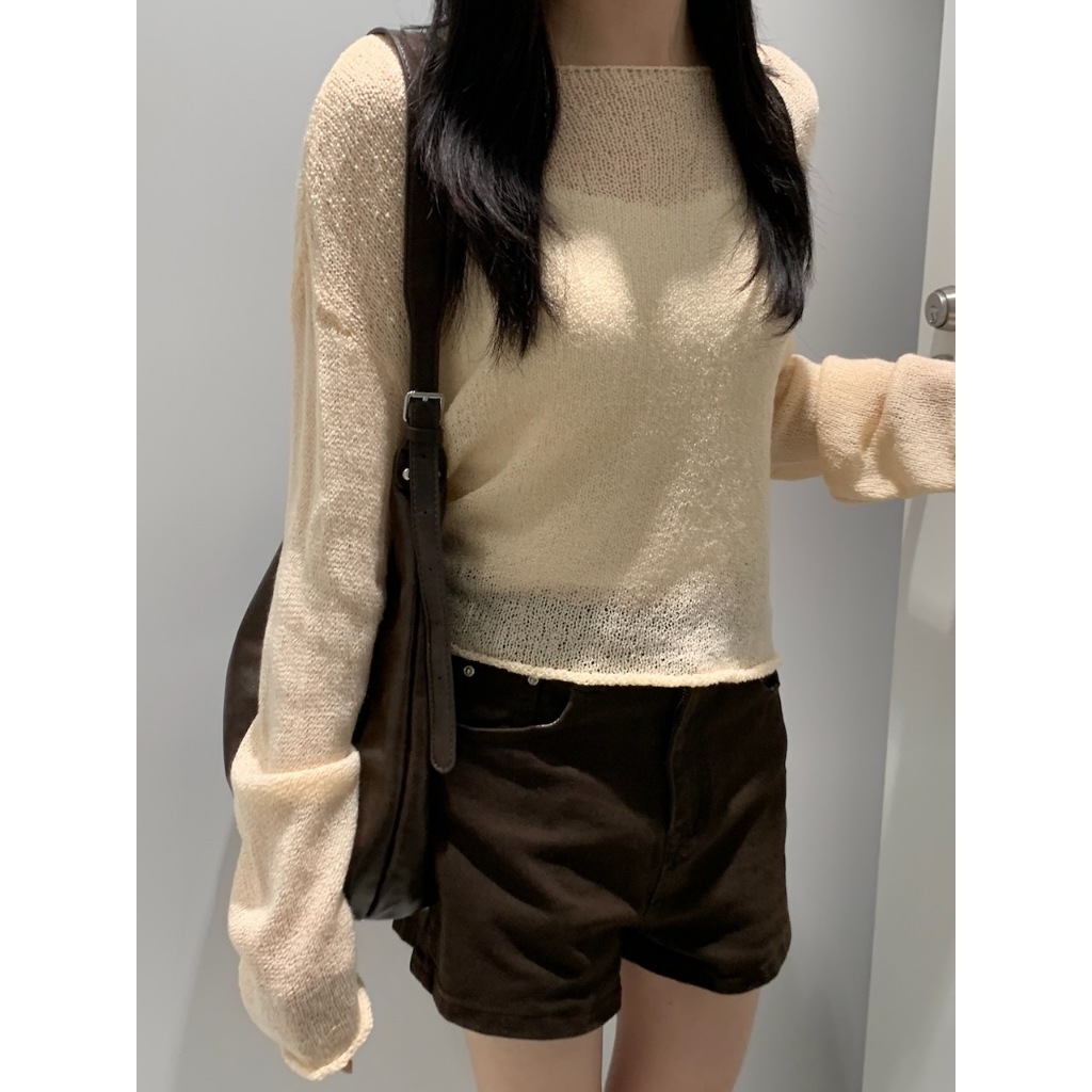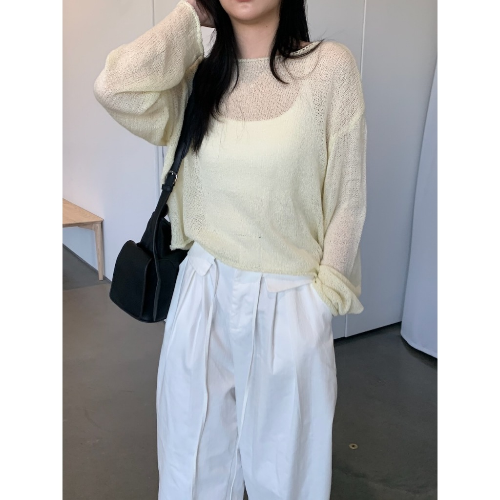 ※外罩細針織寬圓領 下擺、手袖捲邊設計 素色