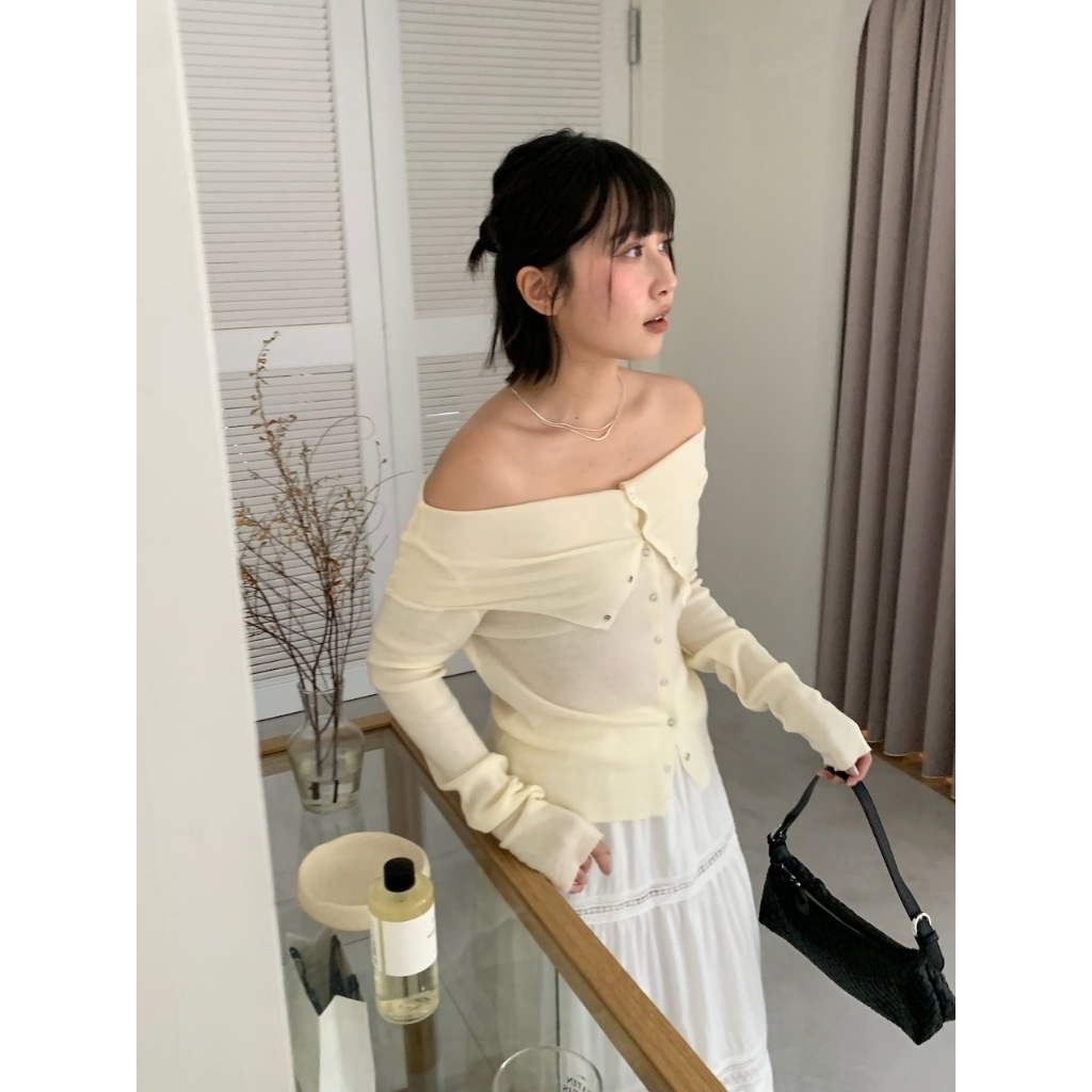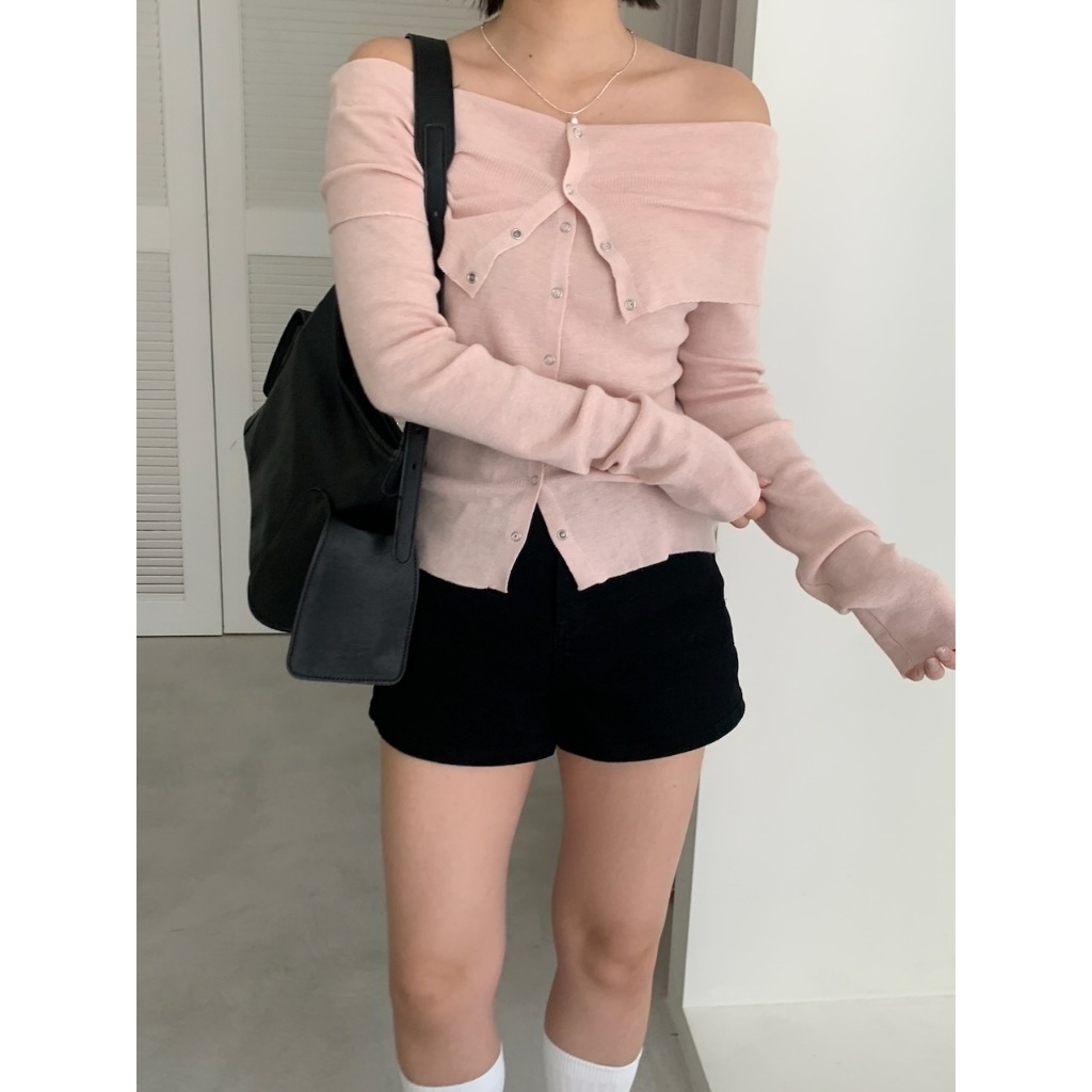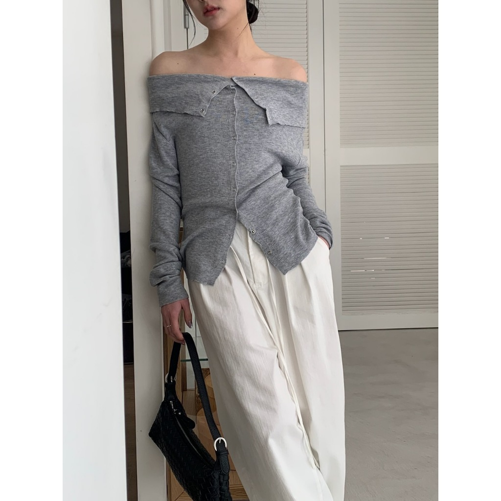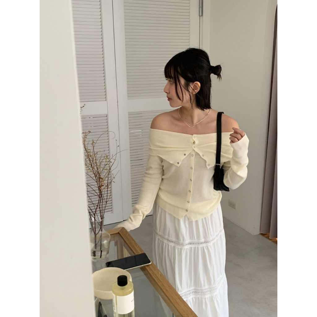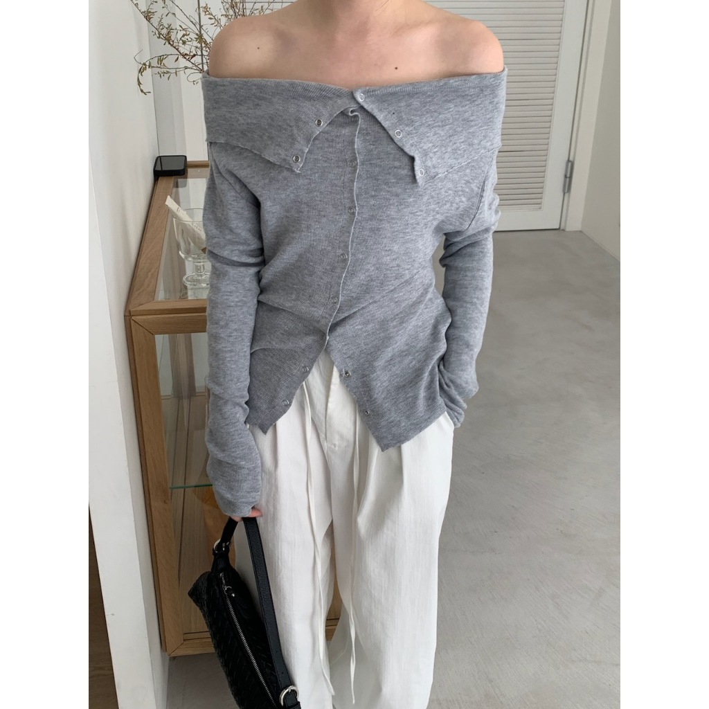 ※可露肩翻領細針織 前面排扣式 真鈕扣 素色