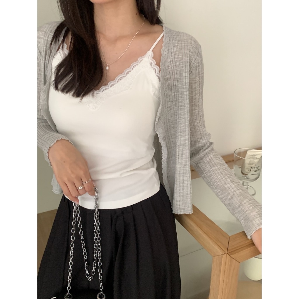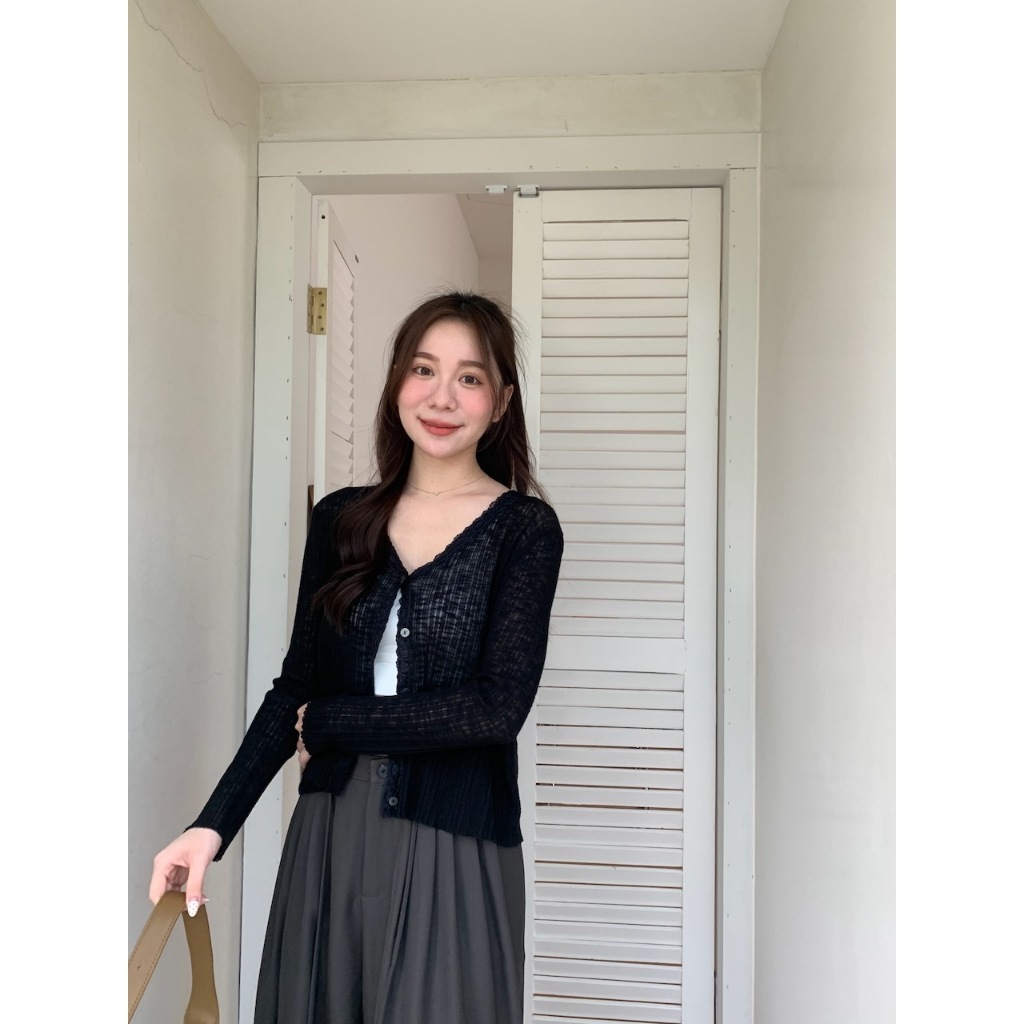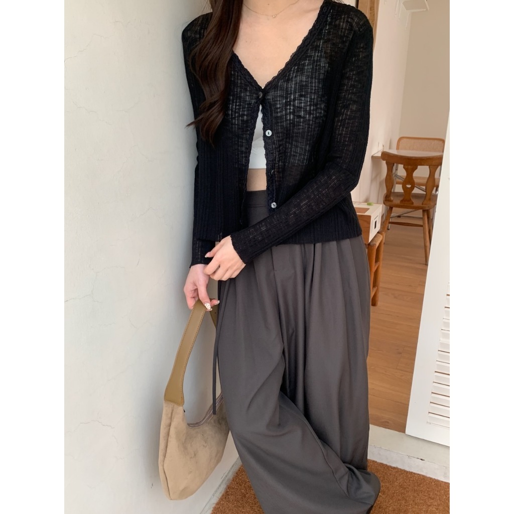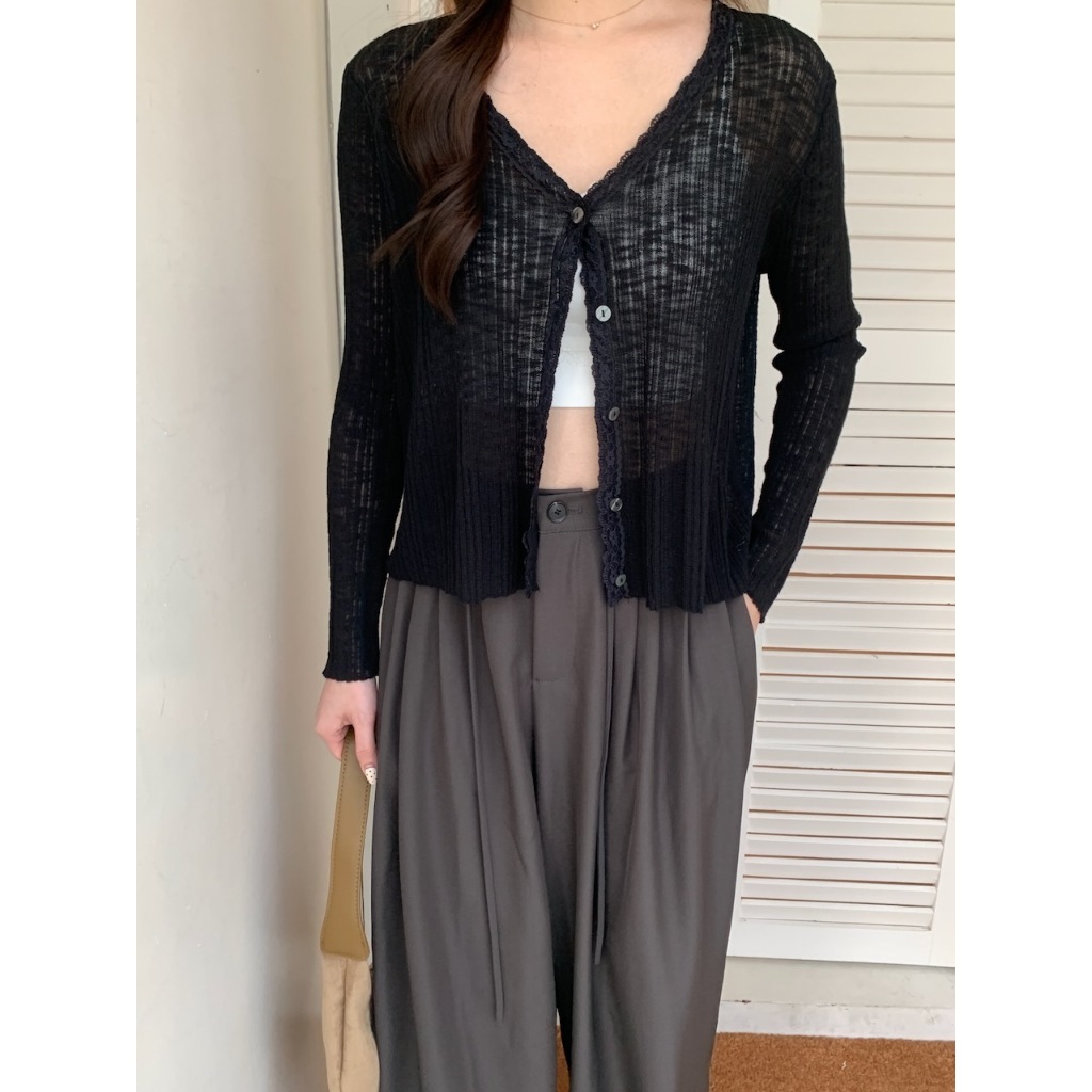 ※微V領紡紗罩衫 中長版 前真排扣 鈕扣貝殼光澤 領邊至鈕扣蕾絲花邊 有彈性 薄透