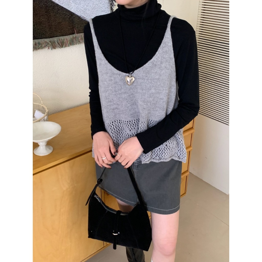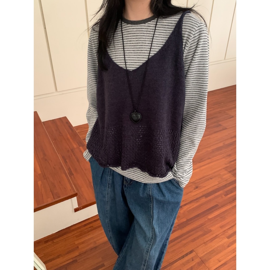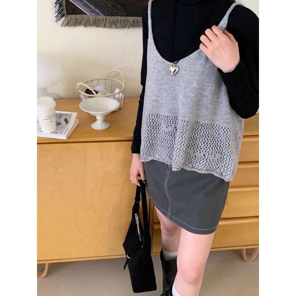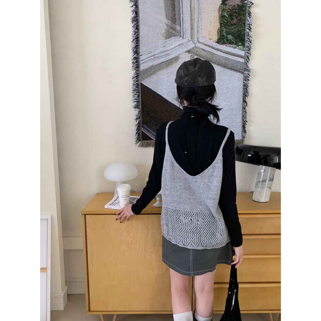 ※V領 細肩帶針織 下擺拼接簍空設計 素色
