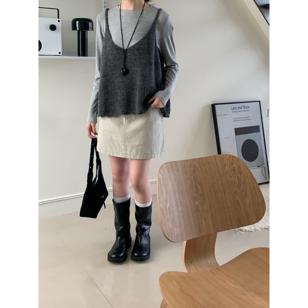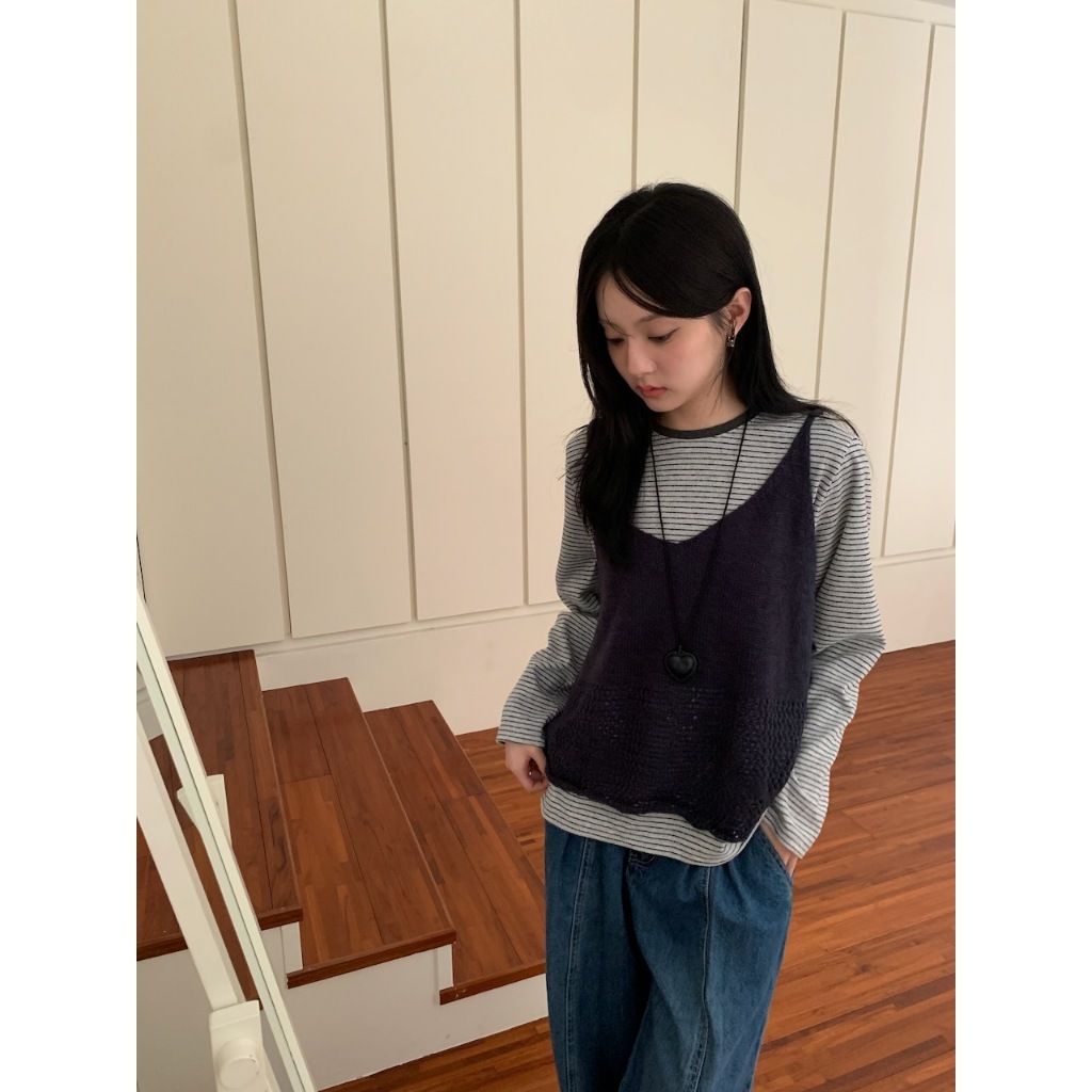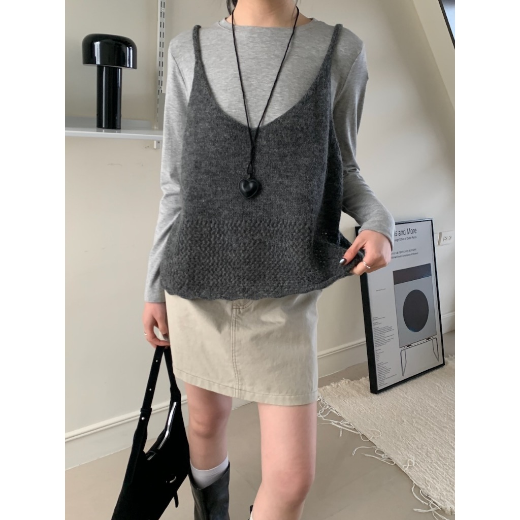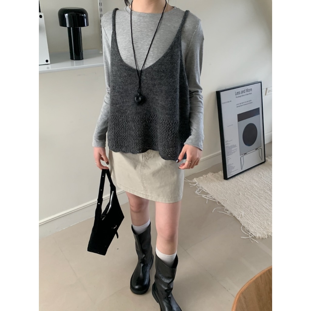 ※V領 細肩帶針織 下擺拼接簍空設計 素色