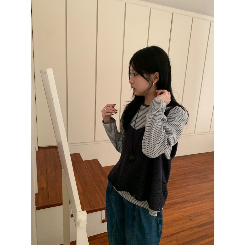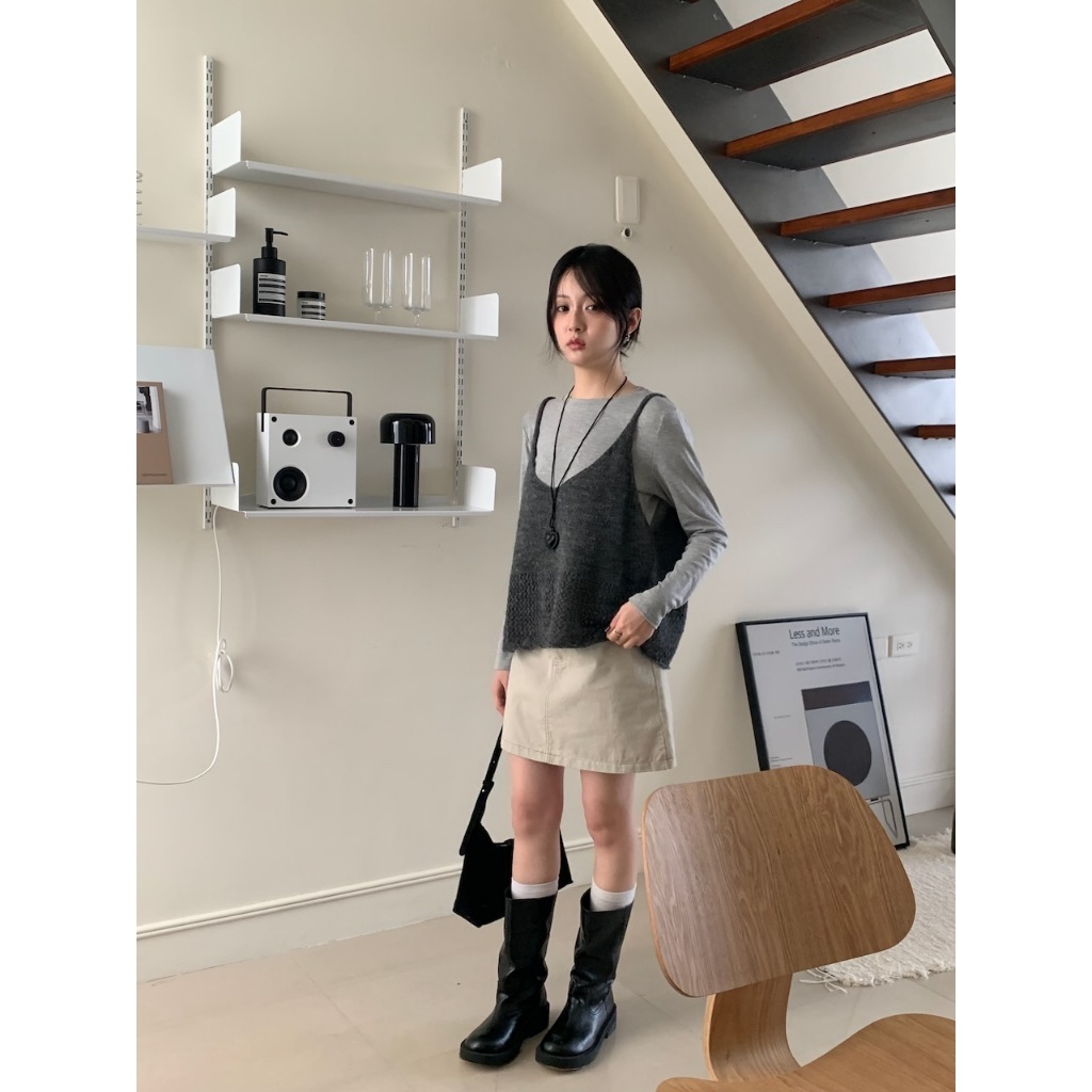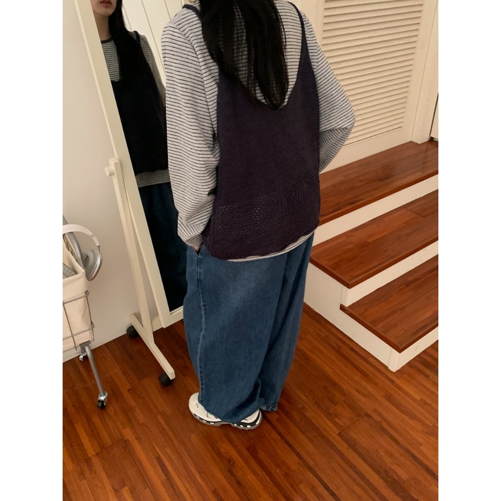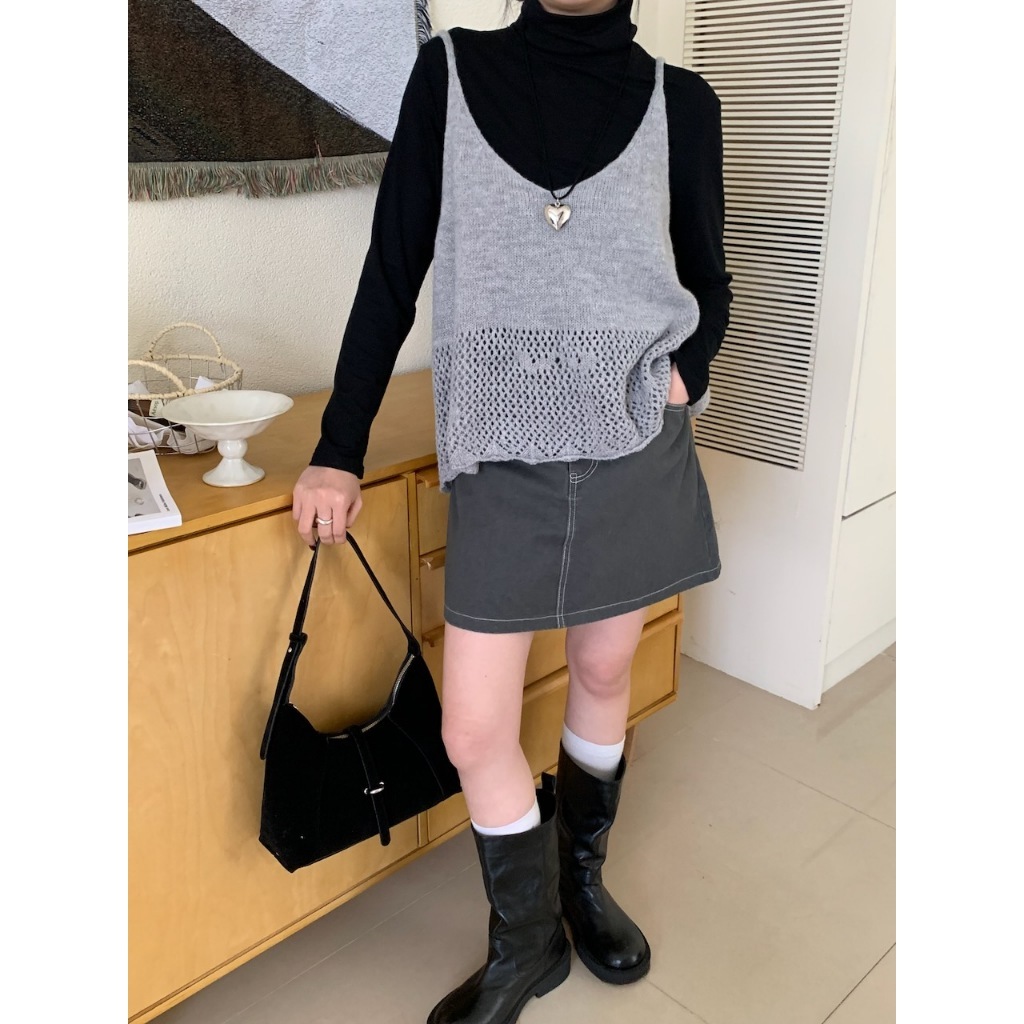 ※V領 細肩帶針織 下擺拼接簍空設計 素色