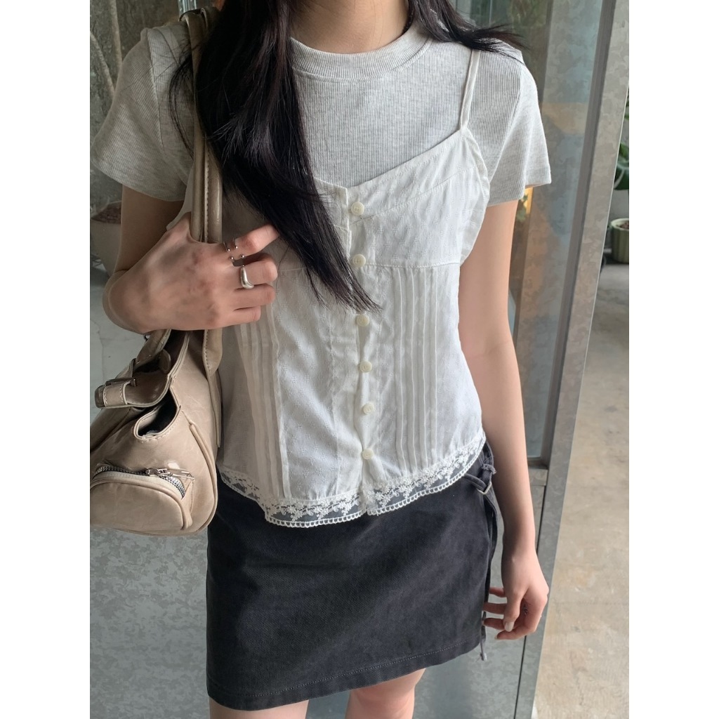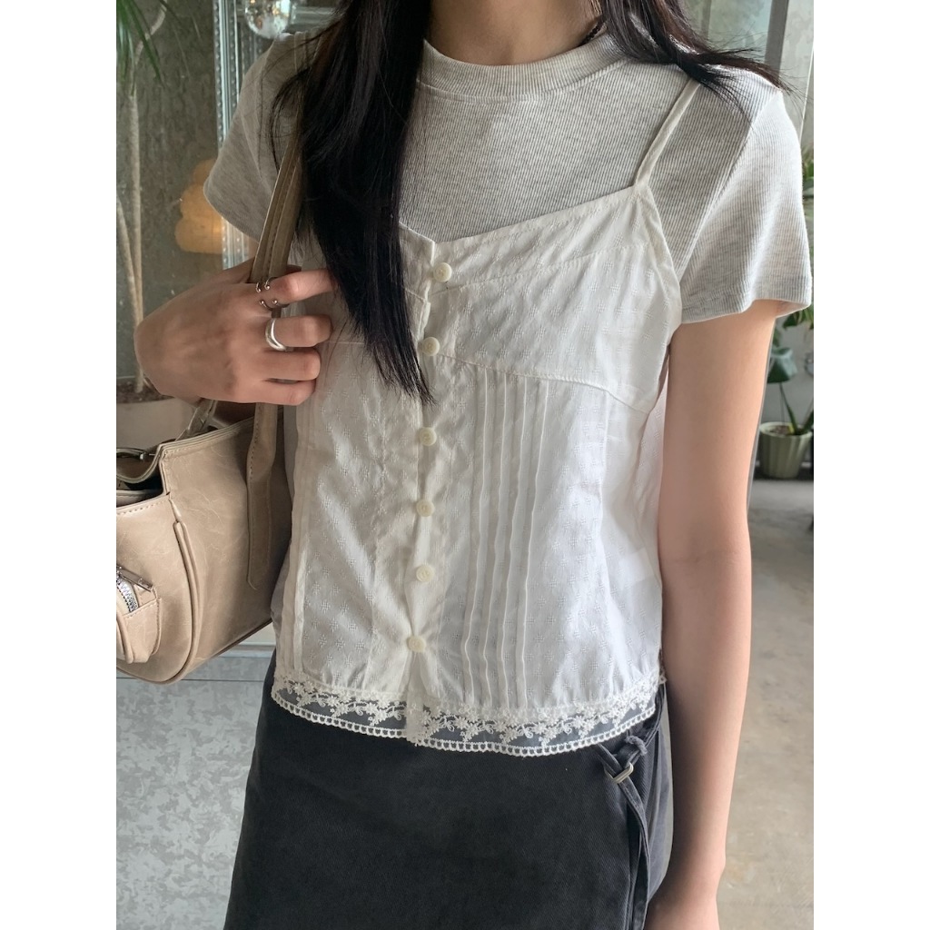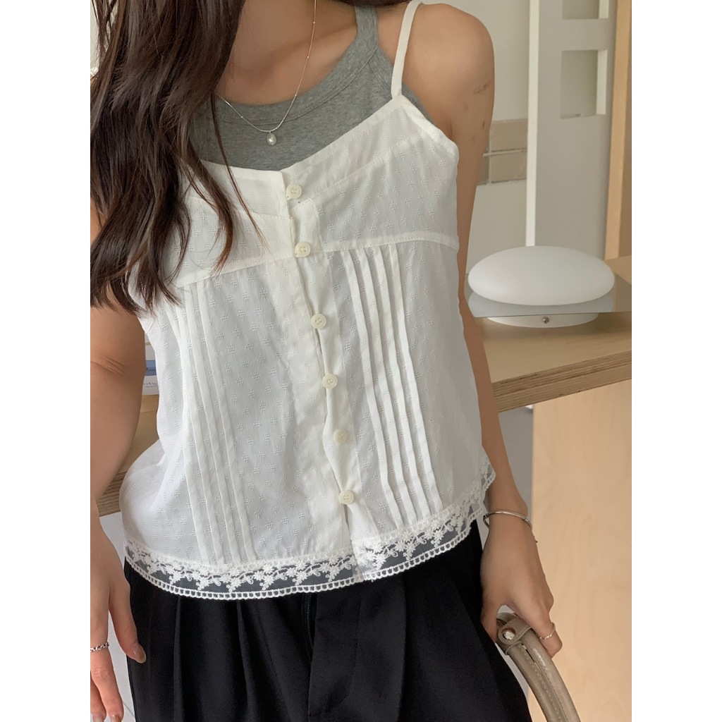 ※可調整細肩帶 微V領 可開式前排釦 整片菱格紋紋路 下擺拼接花紋蕾絲