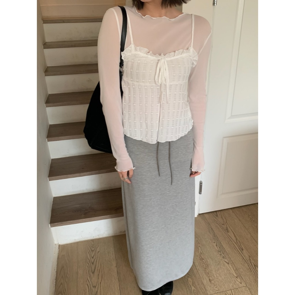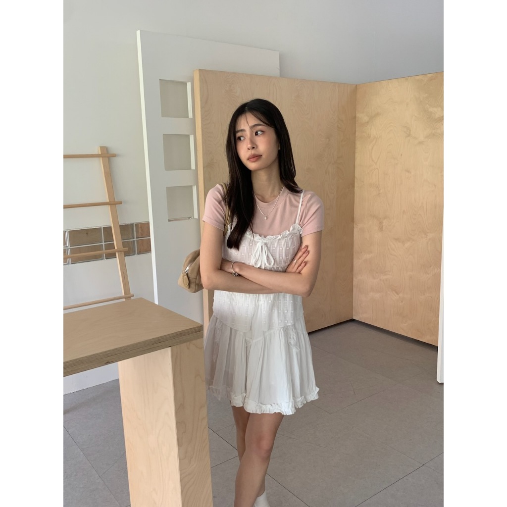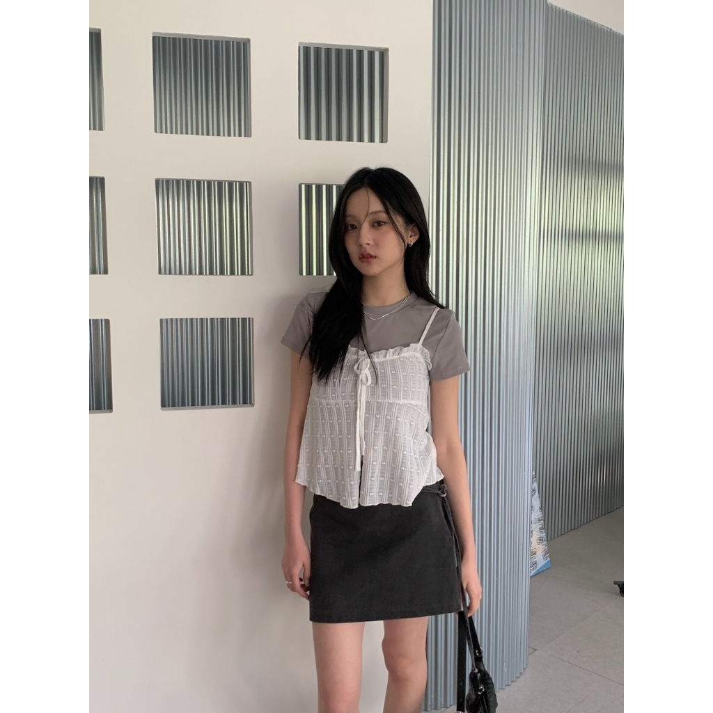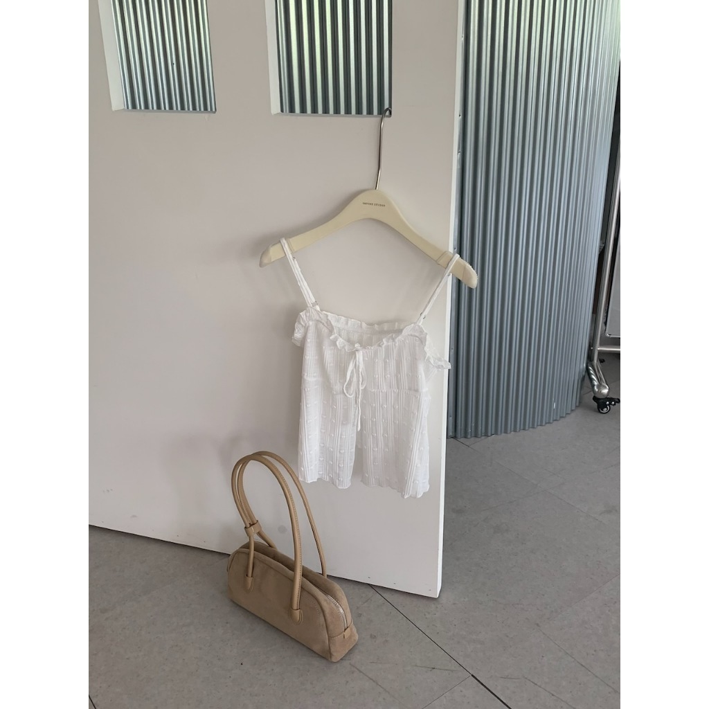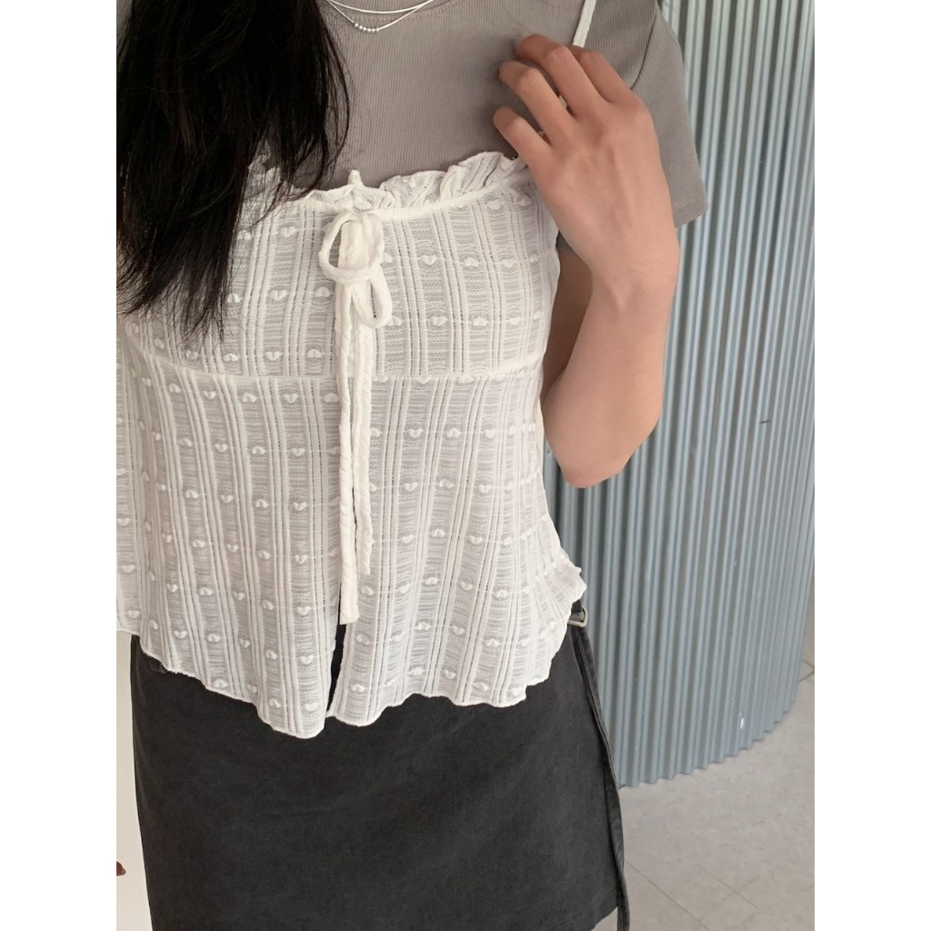 ※可調整細肩帶 整件有彈性 荷葉邊心型領 胸前固定式蝴蝶結綁帶 前下擺開岔 整片心型紋