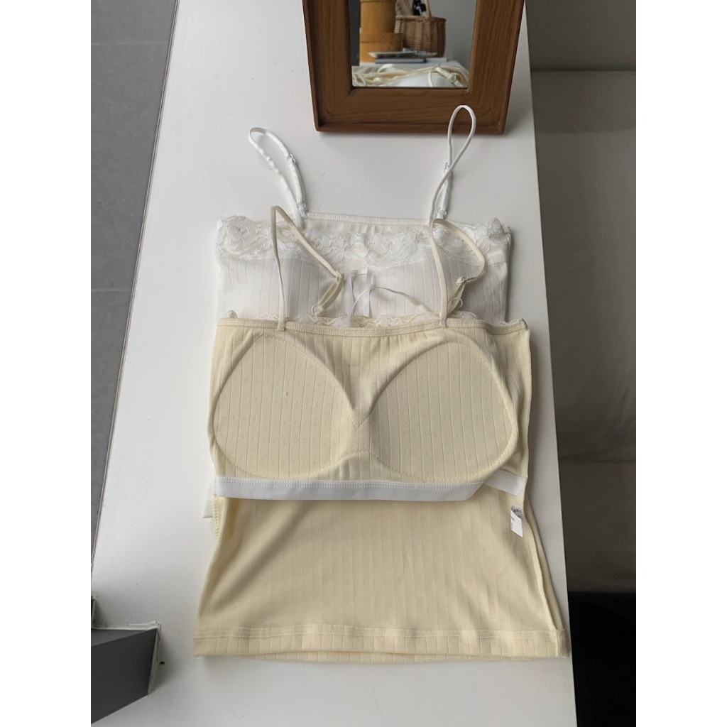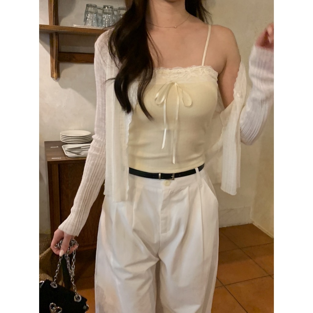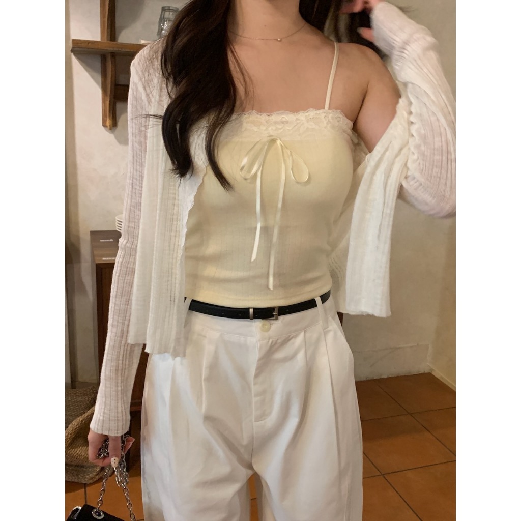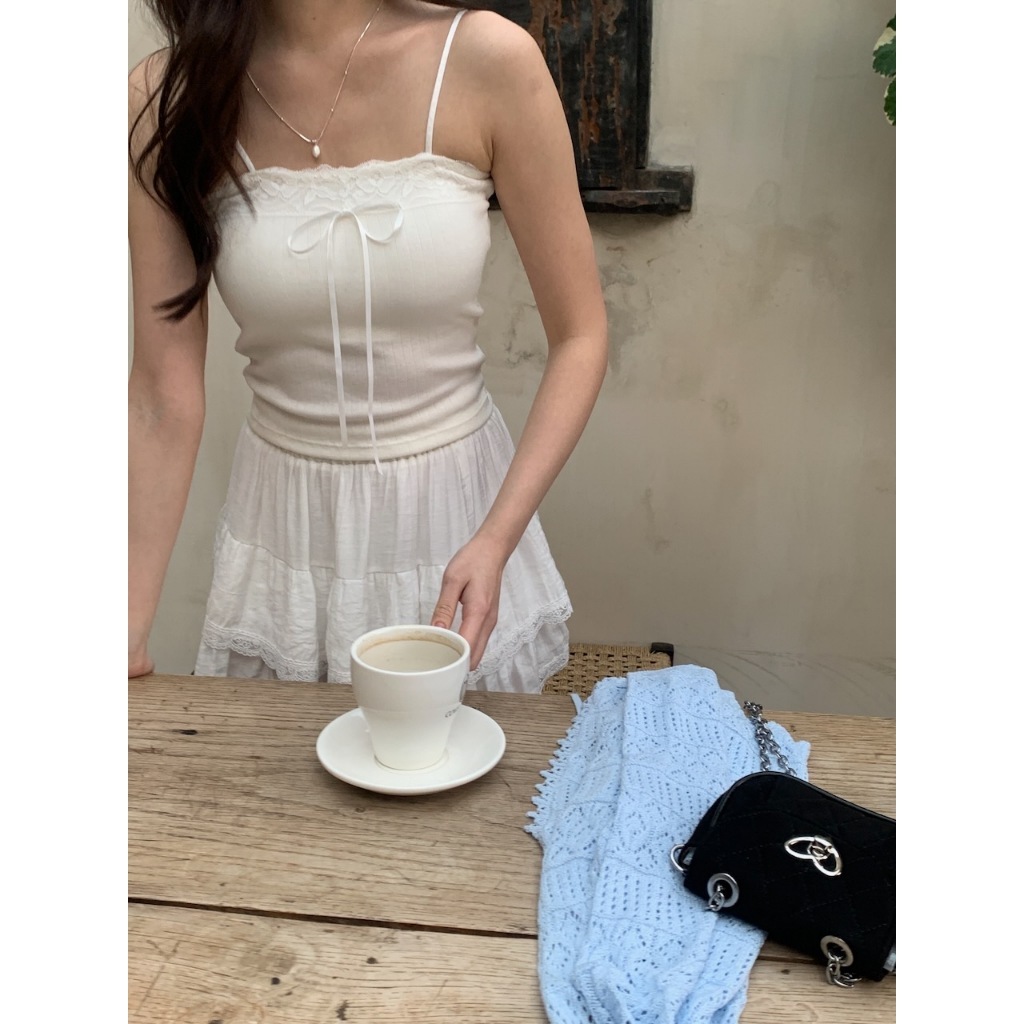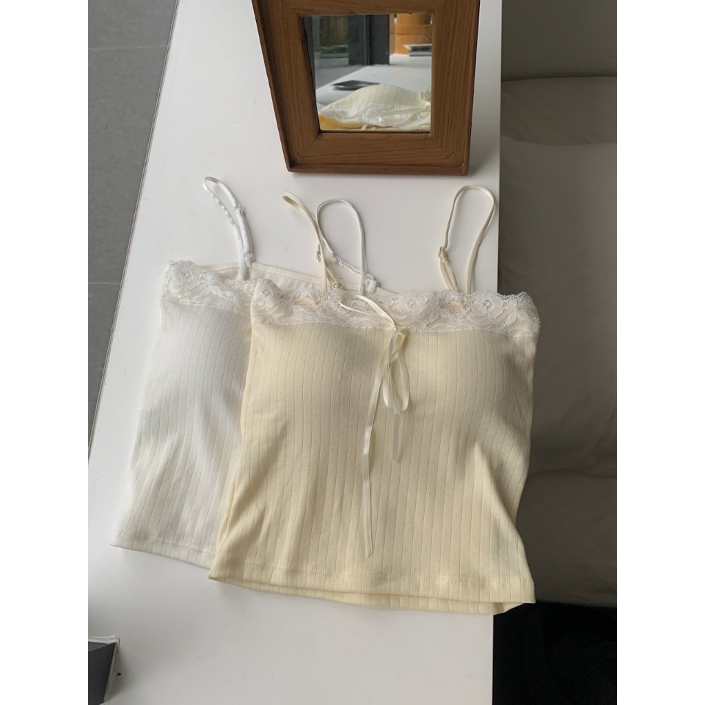 ※短版 細肩帶針織平口罩杯背心 罩杯不可拆 罩杯厚度適中 領口一片式蕾絲花邊 胸前可綁蝴蝶結(不可拆) 細肩帶可調節 整件細花紋條紋布 有彈性