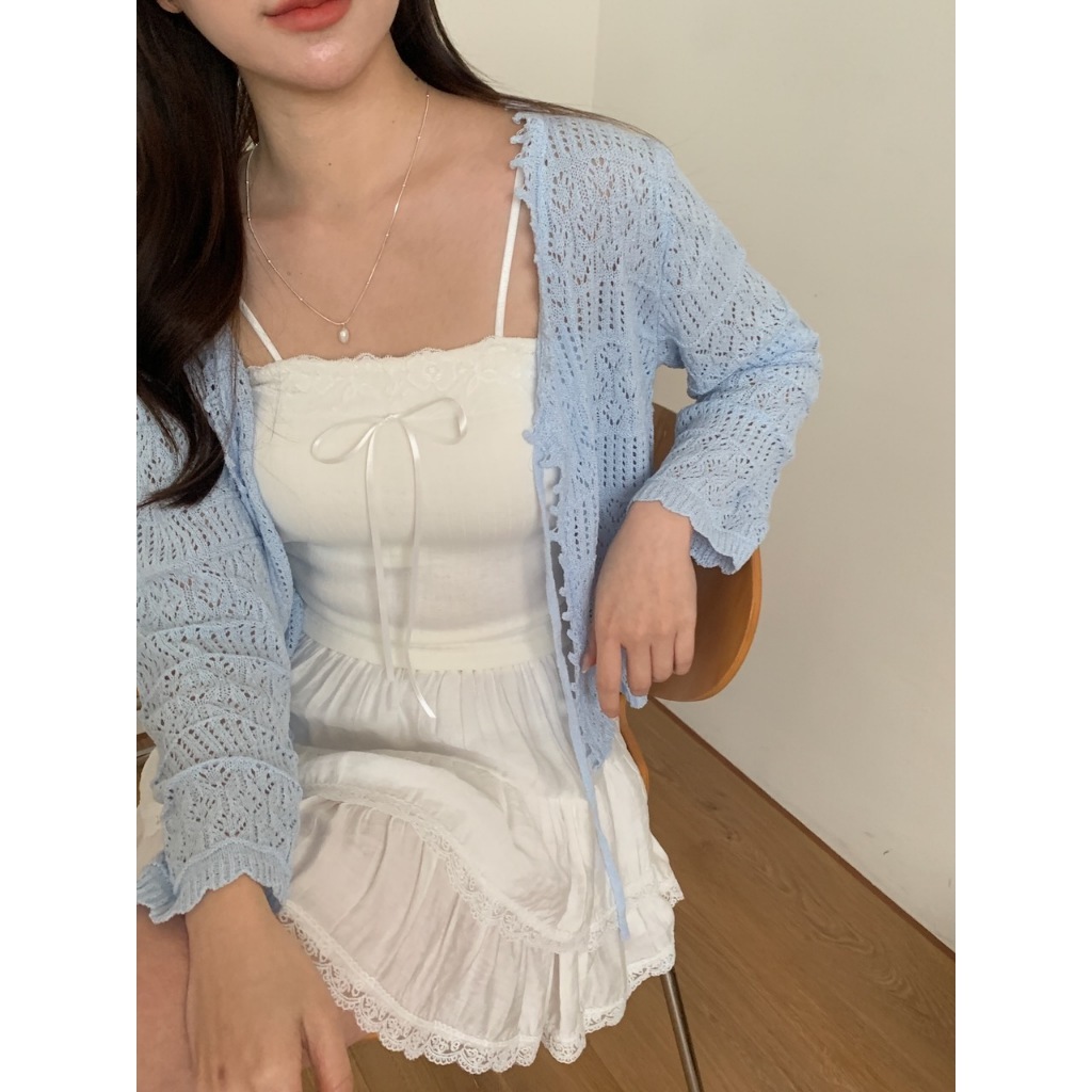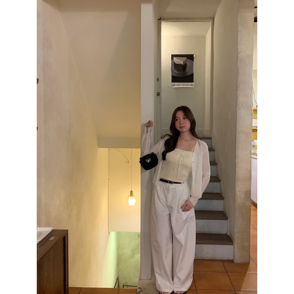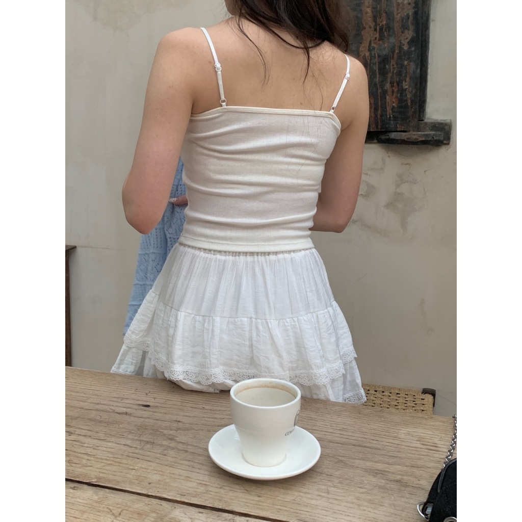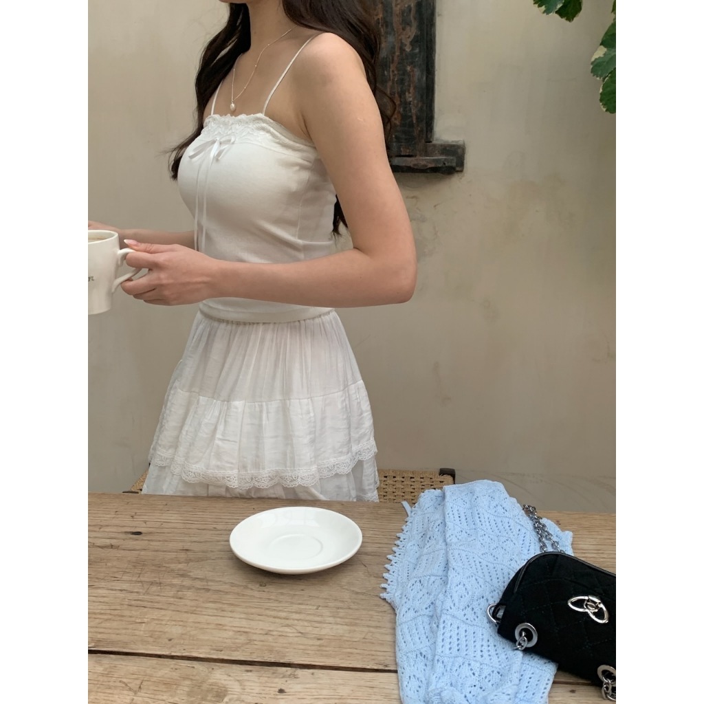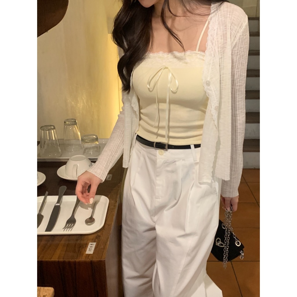 ※短版 細肩帶針織平口罩杯背心 罩杯不可拆 罩杯厚度適中 領口一片式蕾絲花邊 胸前可綁蝴蝶結(不可拆) 細肩帶可調節 整件細花紋條紋布 有彈性