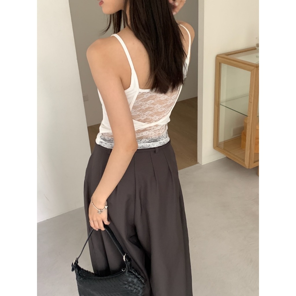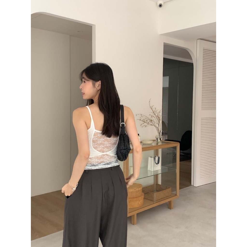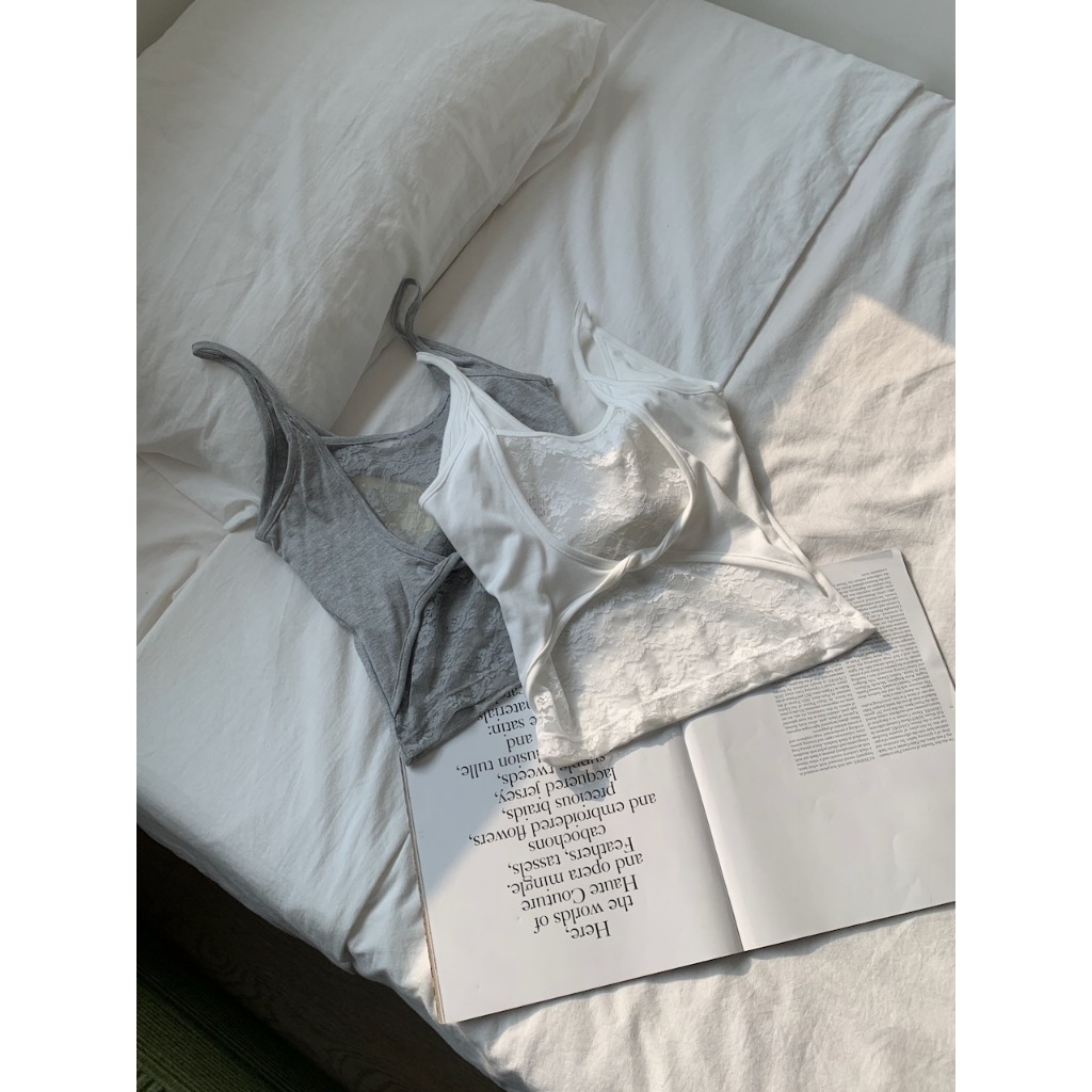 ※短版 細肩帶圓領罩杯背心 罩杯不可拆 罩杯微有厚度 肩帶不可調整 後背整片薄透蕾絲花紋布、外層一條扭結設計 有彈性 前素素色