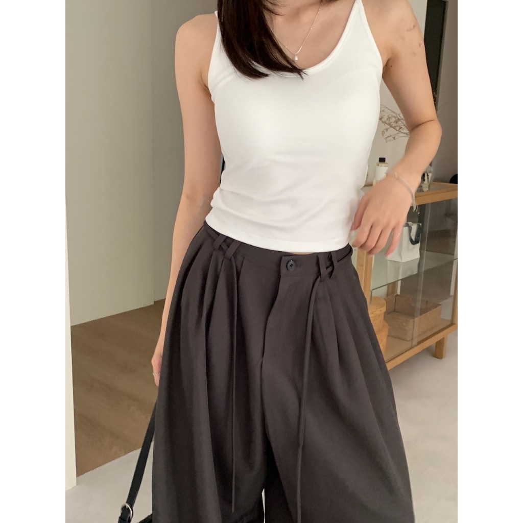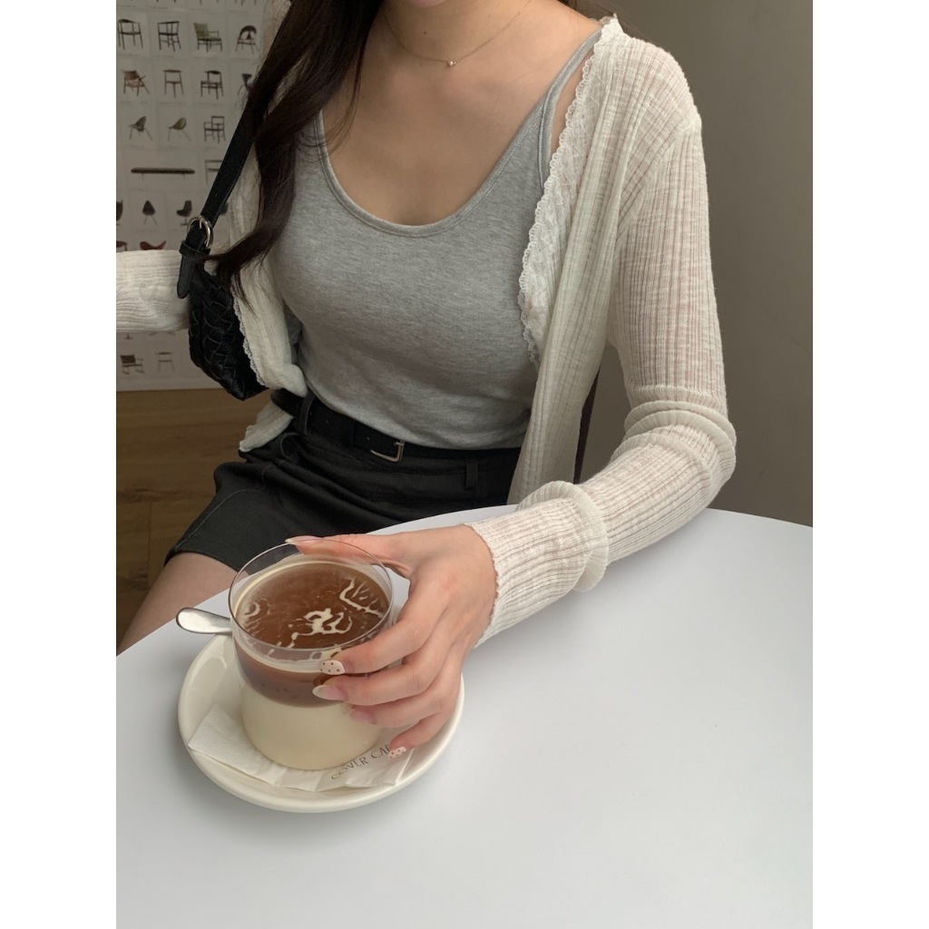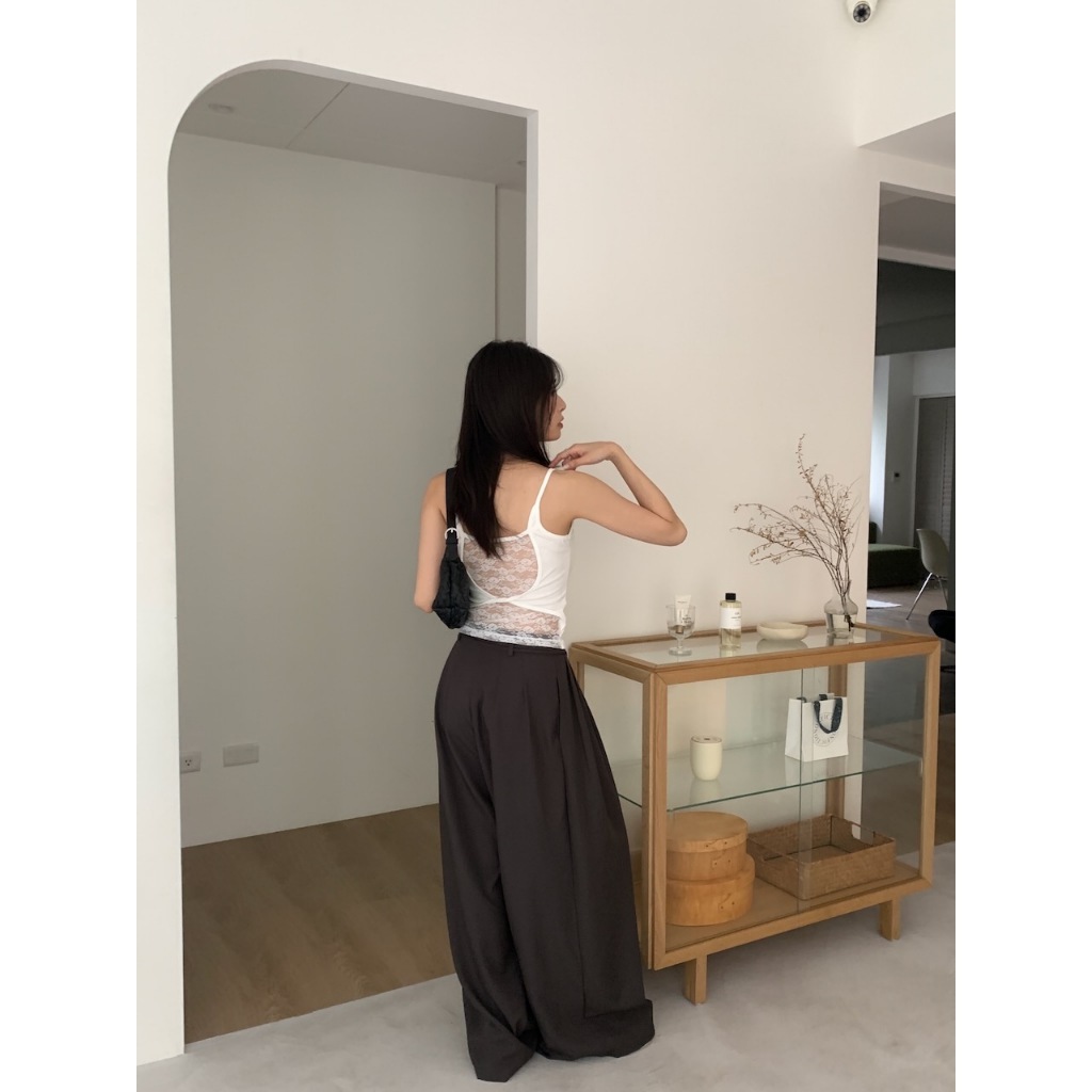 ※短版 細肩帶圓領罩杯背心 罩杯不可拆 罩杯微有厚度 肩帶不可調整 後背整片薄透蕾絲花紋布、外層一條扭結設計 有彈性 前素素色