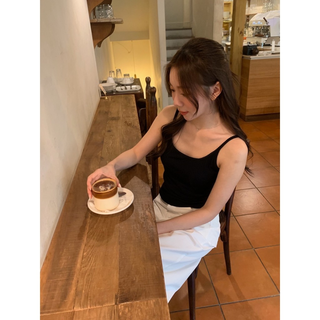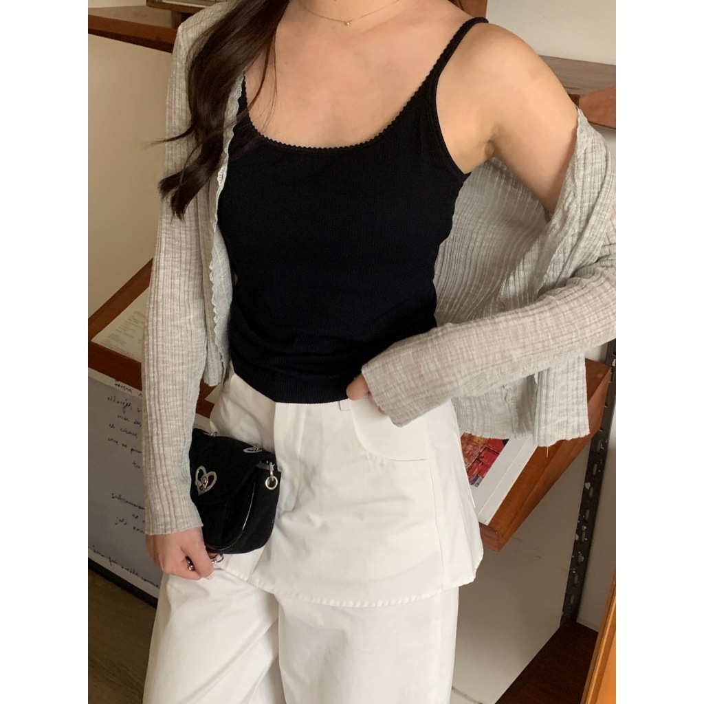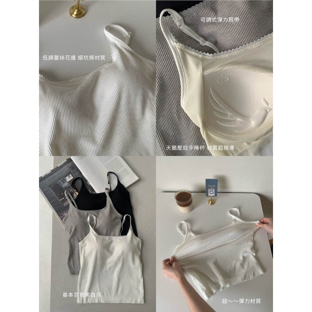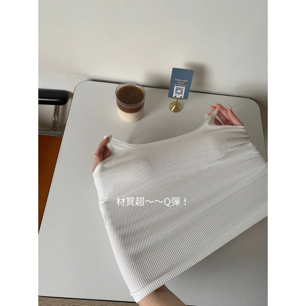 ※細肩帶平口罩杯背心 罩杯不可拆 罩杯厚度薄 前領口至肩線蕾絲花邊 後背挖U領 整建直條紋紋路 有彈性