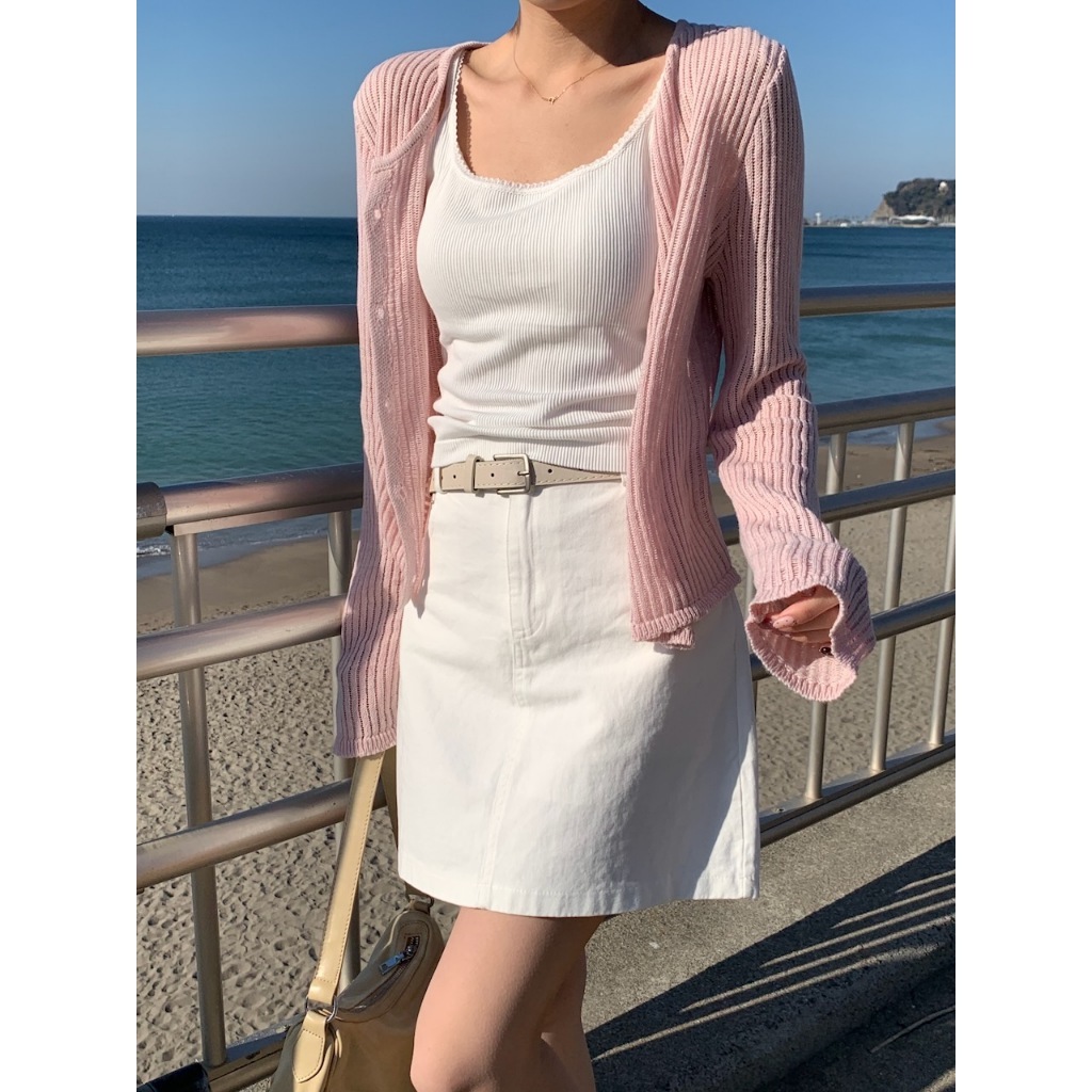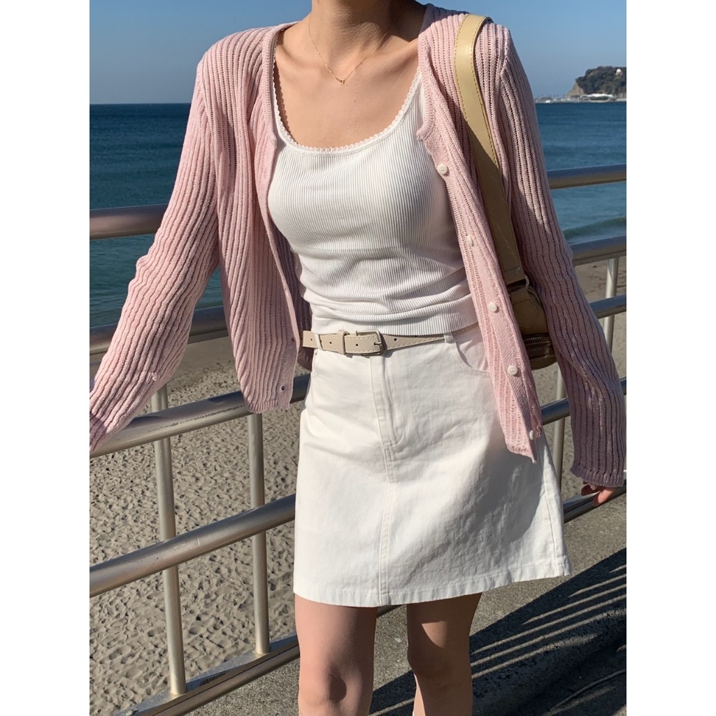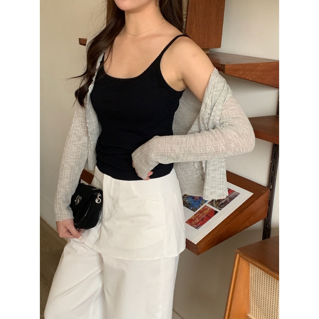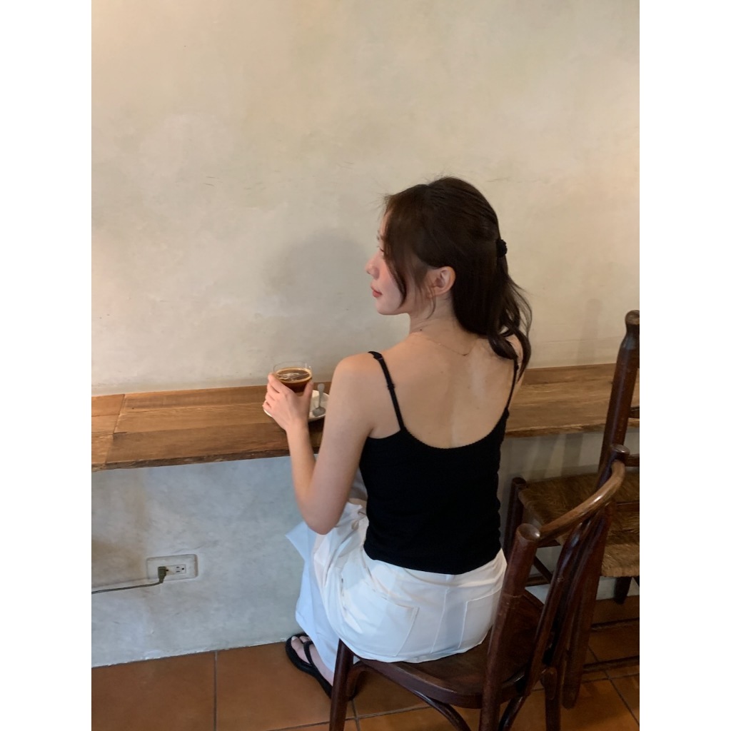 ※細肩帶平口罩杯背心 罩杯不可拆 罩杯厚度薄 前領口至肩線蕾絲花邊 後背挖U領 整建直條紋紋路 有彈性