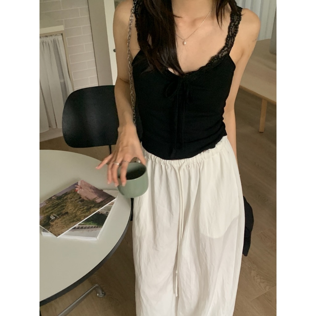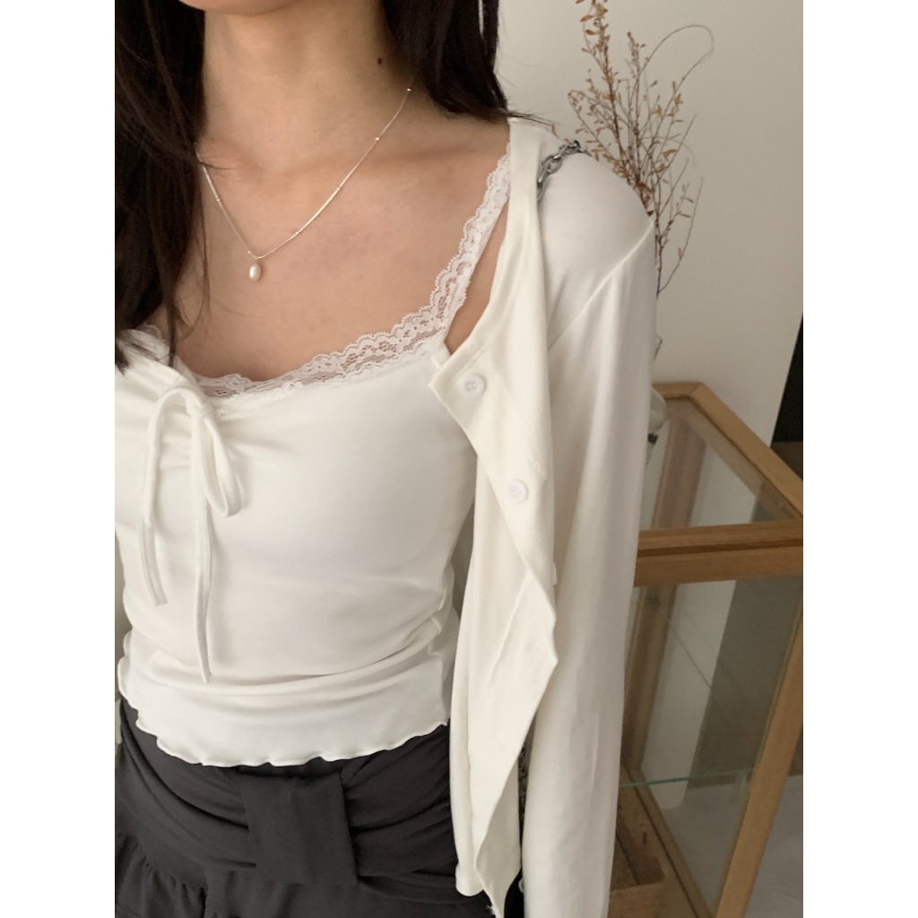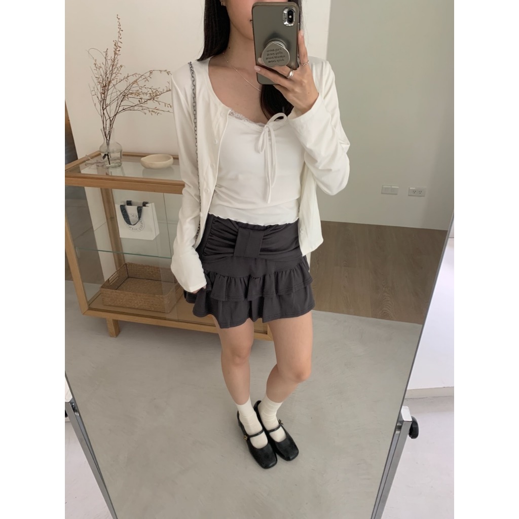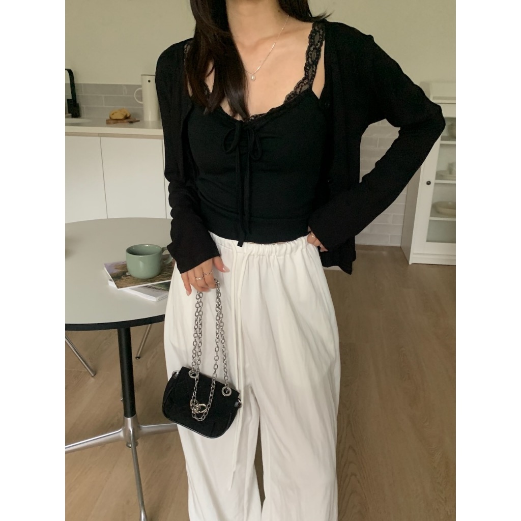 ※背心:短版 蕾絲細肩帶罩杯式背心 罩杯不可拆 罩杯厚度適中 領口至肩帶蕾絲花邊 胸前綁帶蝴蝶結(不可拆) 胸前抓皺 下擺木耳邊線 有彈性