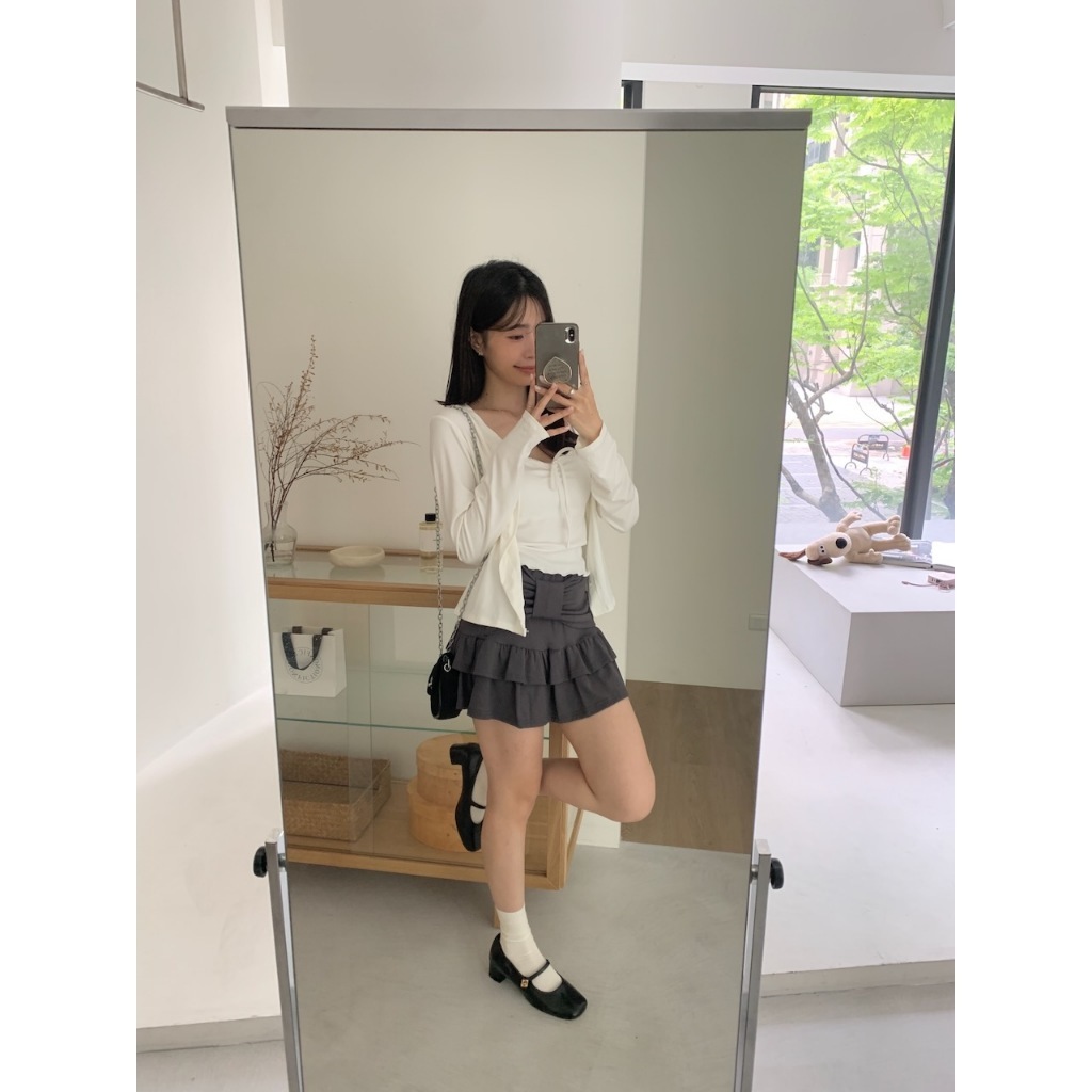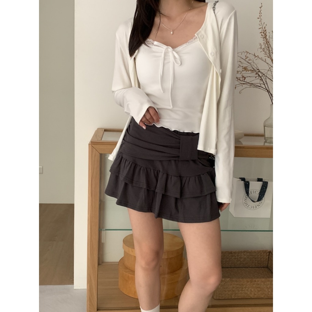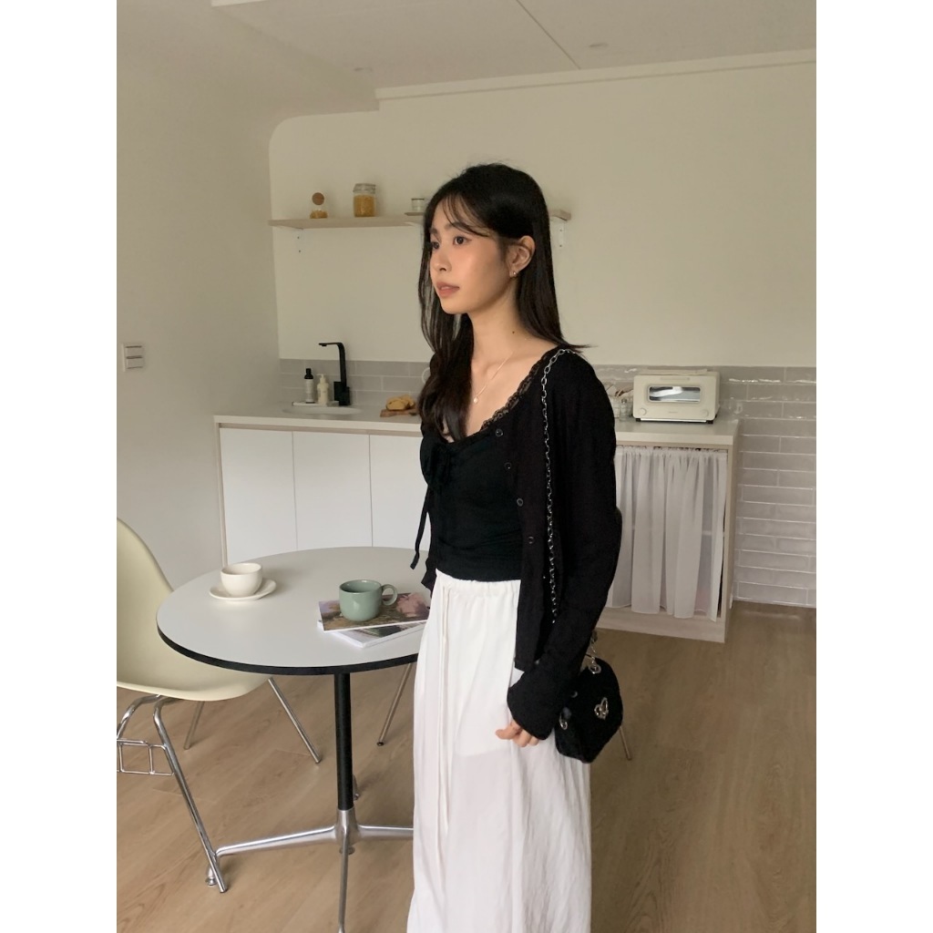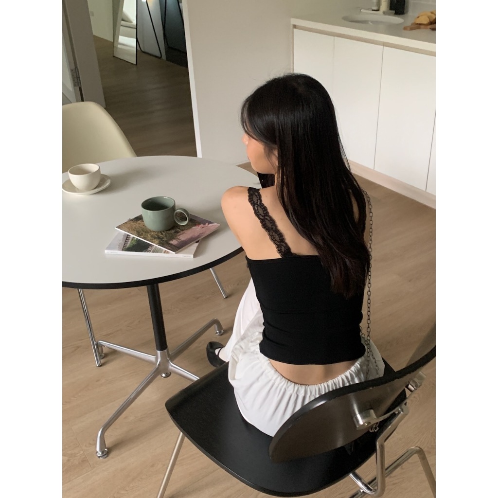 ※背心:短版 蕾絲細肩帶罩杯式背心 罩杯不可拆 罩杯厚度適中 領口至肩帶蕾絲花邊 胸前綁帶蝴蝶結(不可拆) 胸前抓皺 下擺木耳邊線 有彈性
