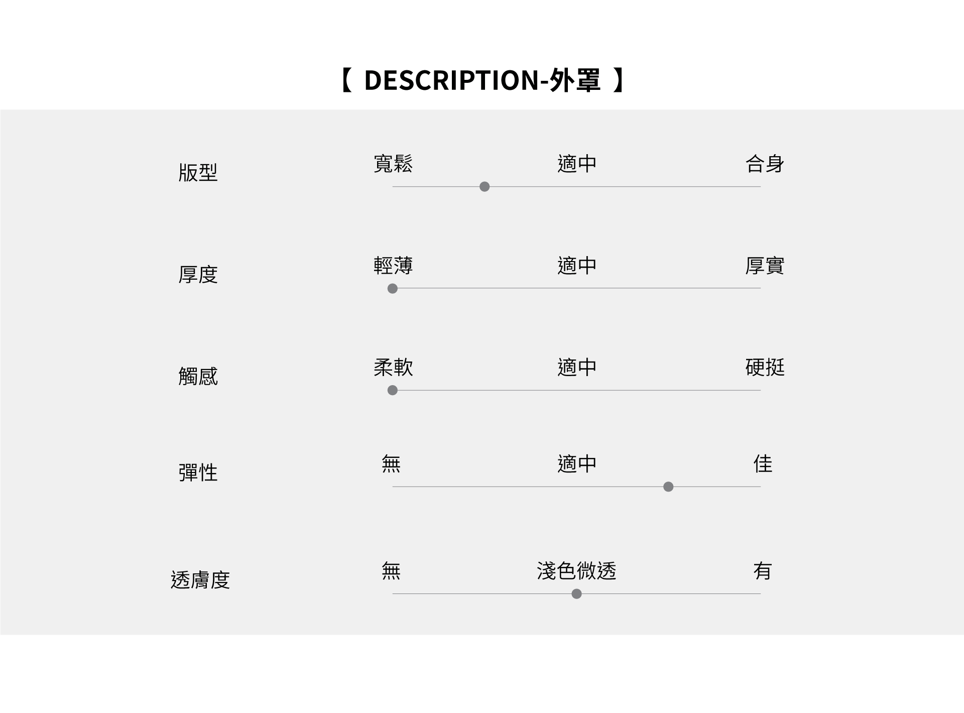 ※外罩:圓領 前真排扣外罩 中長版 袖長可遮到手背 柔軟 很有彈性 合身 微透 素色