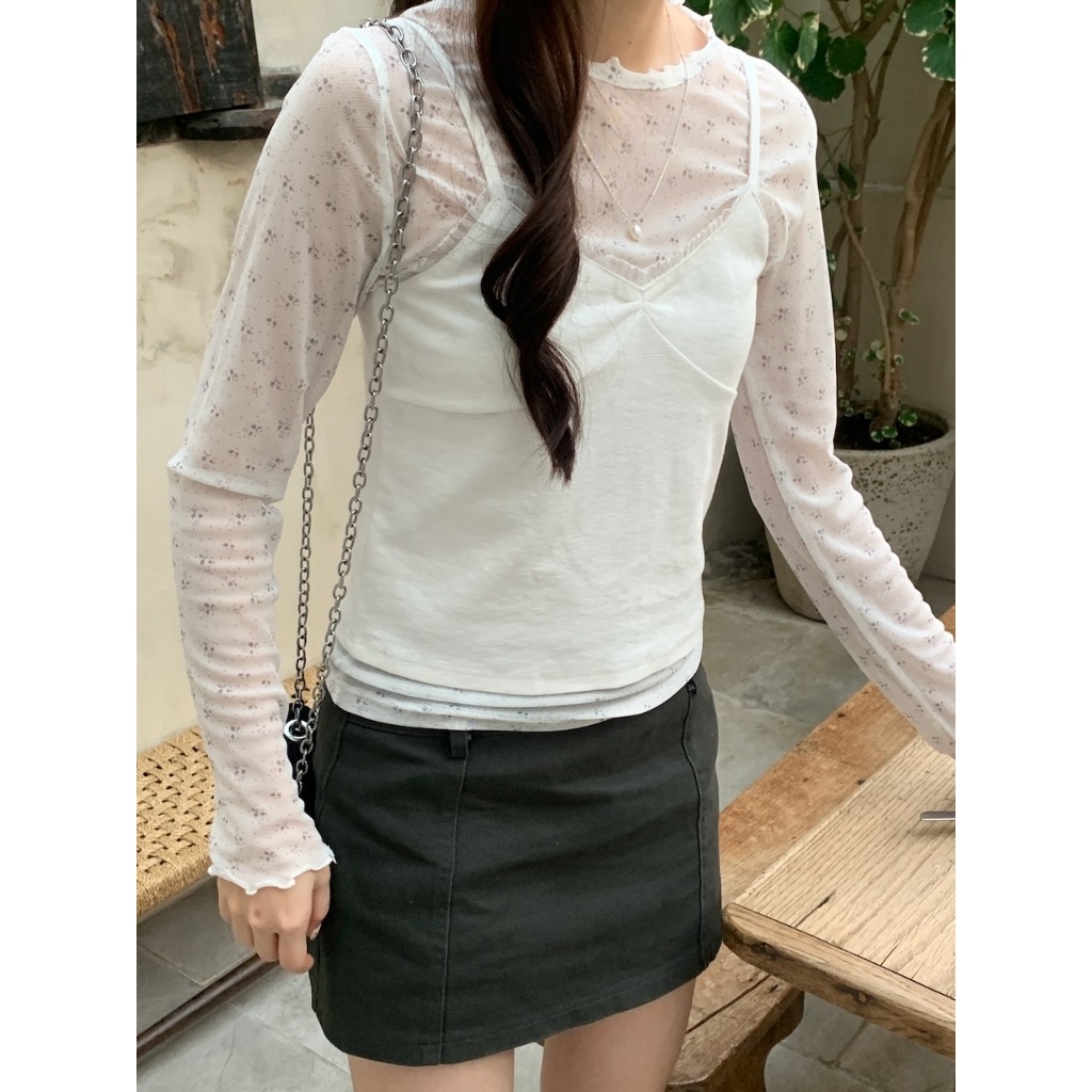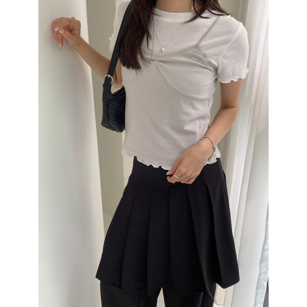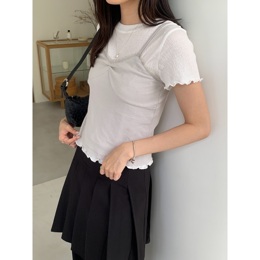 ※細肩帶 微V領 短版 可調節肩帶 領口整圈紡紗皺褶花邊 前面車縫胸型設計 有彈性 素色