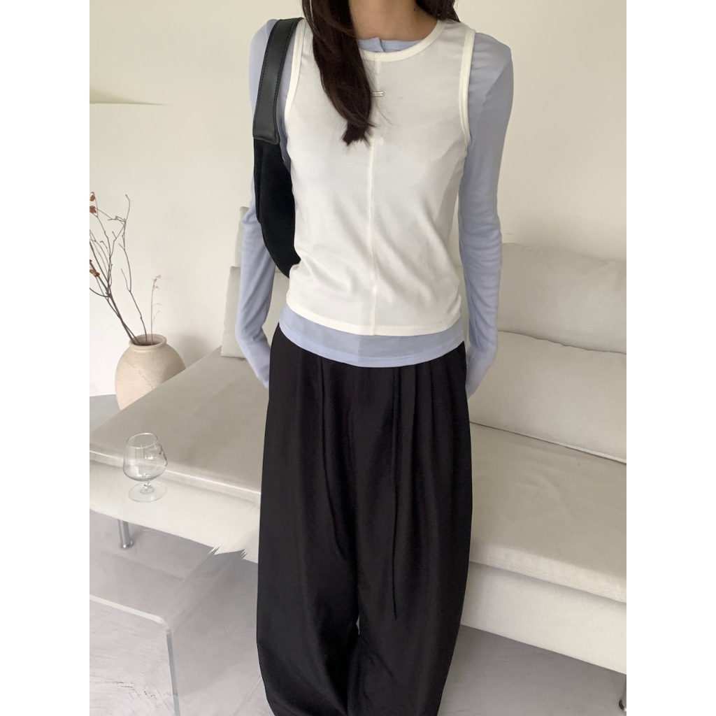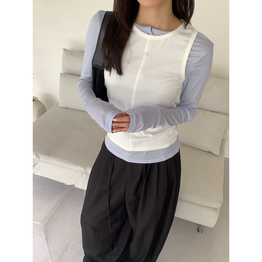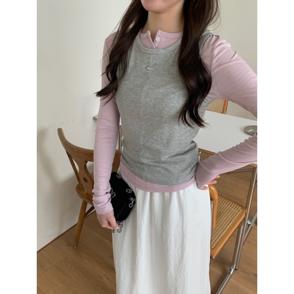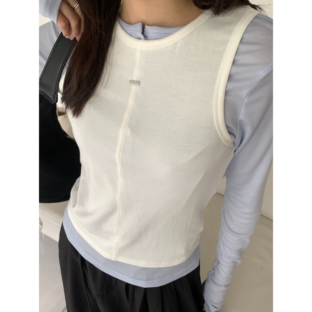 ※圓領 無袖坦克背心 腋窩略寬 中長版 胸前逢飾扣 胸前縫一條車線設計 薄微透 蠻有彈性